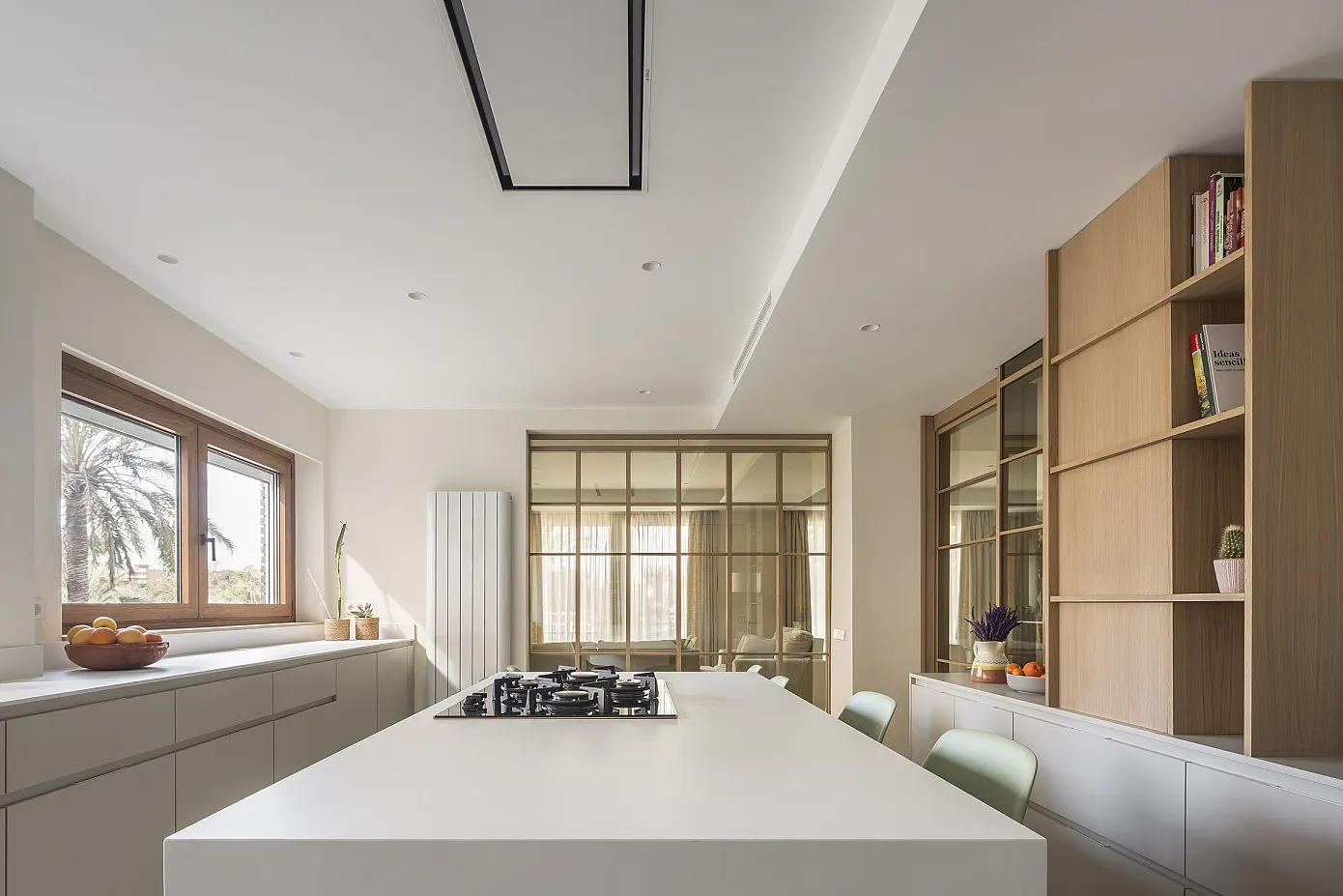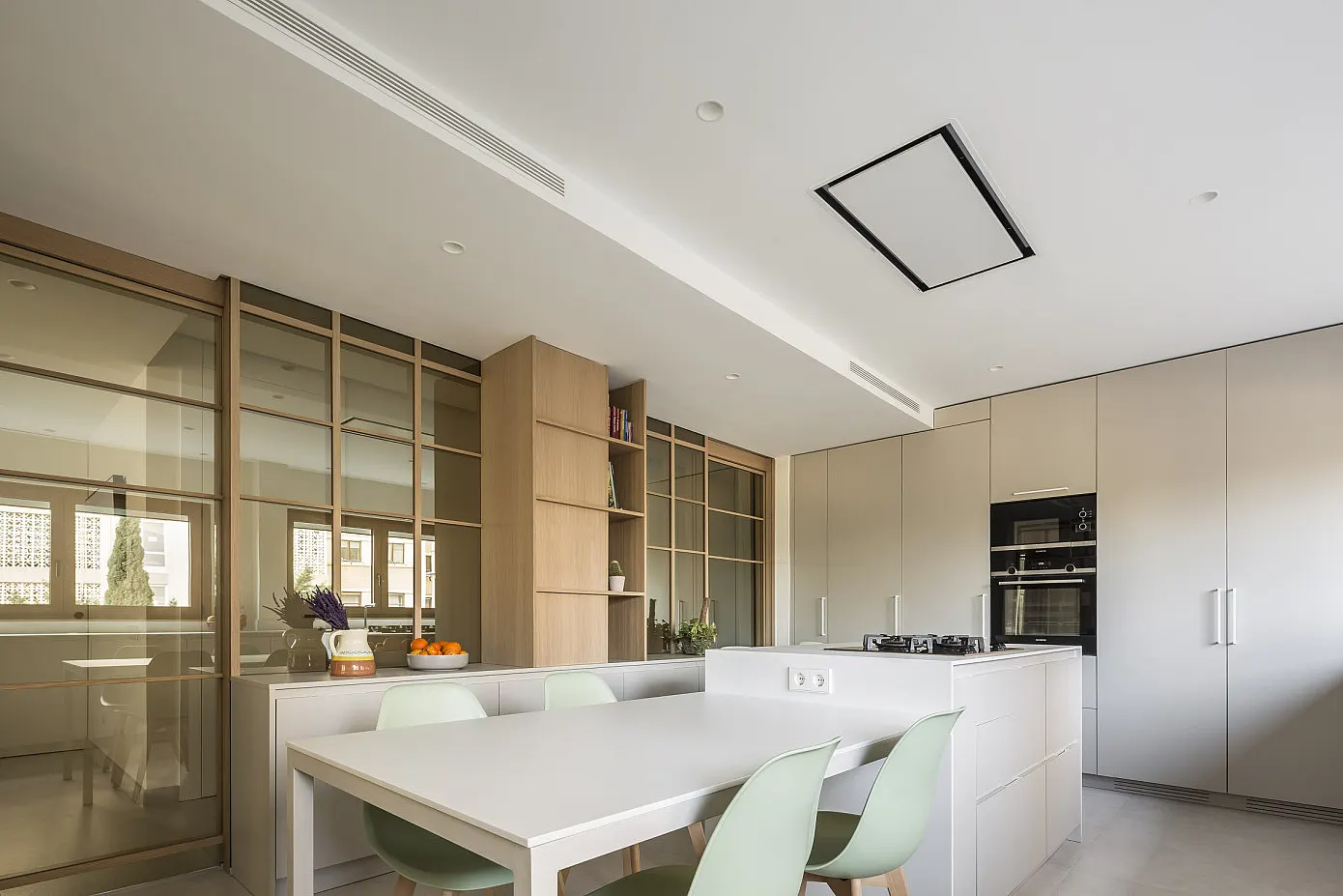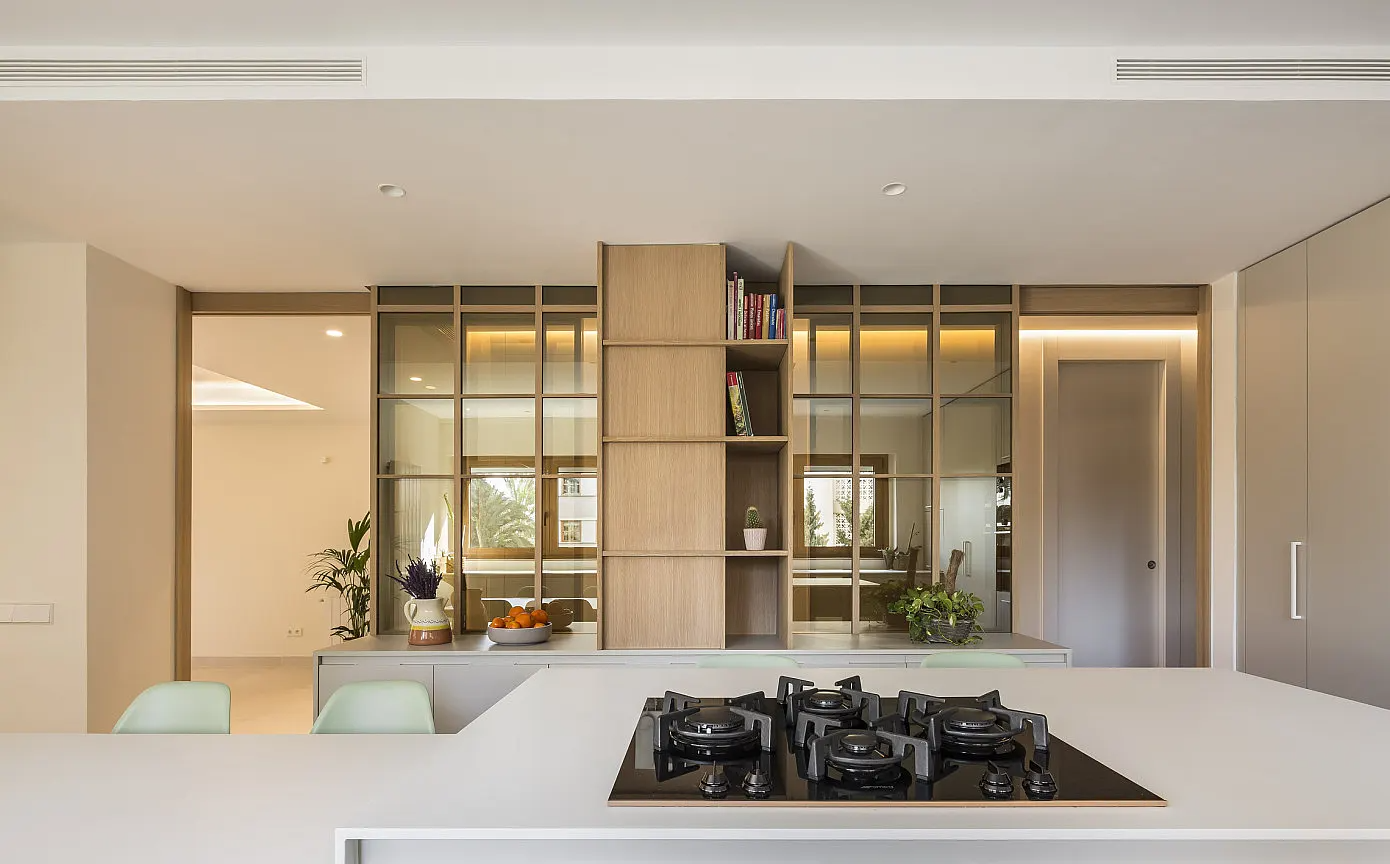 참나무와 유리로 제작된 파티션을 사이에 두고 메인 공간과 자연스럽게 구분된 주방에는 공간에 꼭 맞춰 설계된 심플한 디자인의 빌트인 싱크대와 아일랜드 조리대 겸 식탁을 깔끔하고 견고하게 설치해 세련미와 실용성을 모두 갖춘 고급스러운 주방 인테리어를 선보이고 있다.