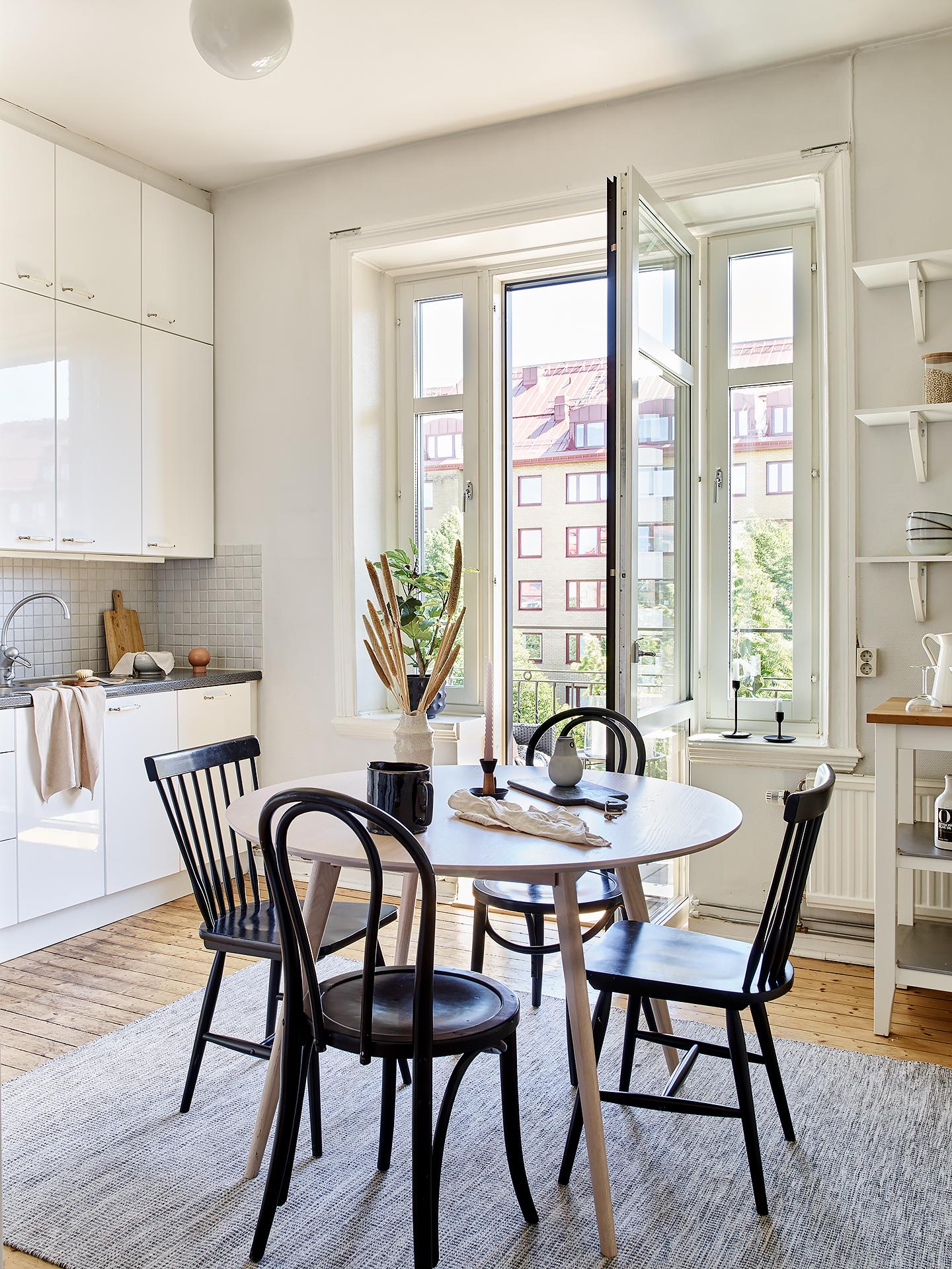 라운드 다이닝 테이블과 네 개의 우드 다이닝 체어들이 예쁘게 놓인 주방 속 다이닝 공간은 가벼운 식사와 티타임을 즐길 수 있는 실용적인 공간으로 디자인되어 일상의 편리를 더하고 있다.
