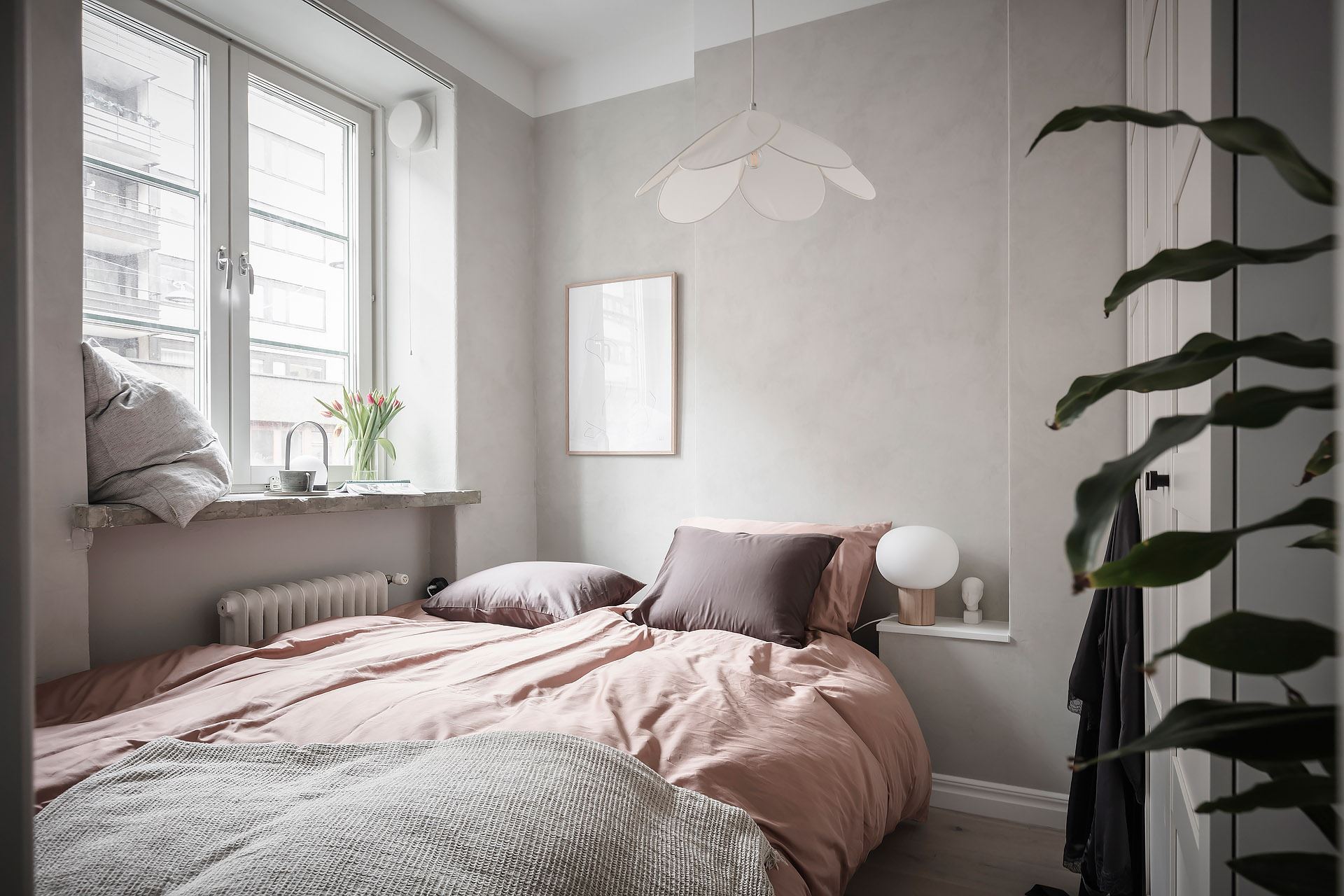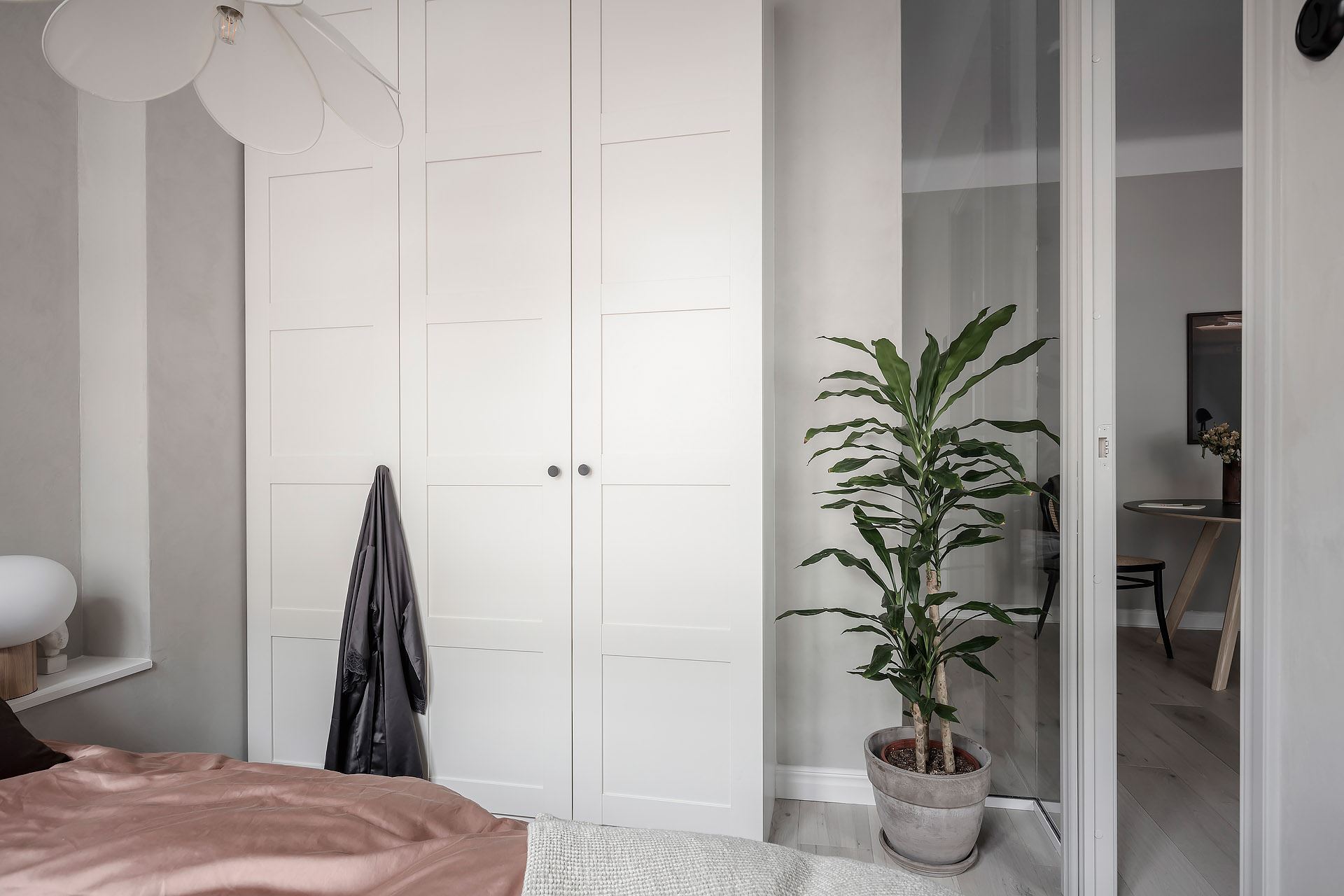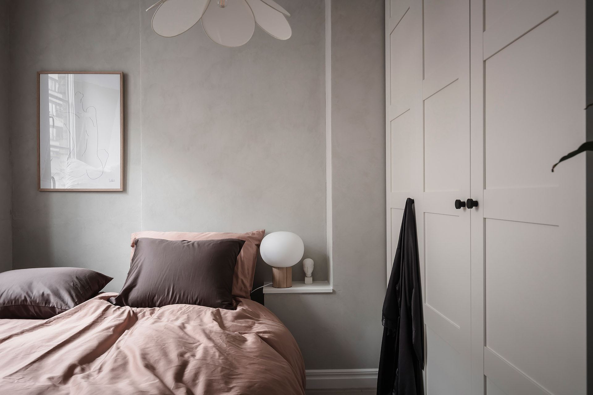 새롭게 만들어진 마스터 침실은 거실, 식당, 주방으로 구성된 공동생활공간과 완벽하게 분리된 사적인 공간으로, 침대, 장롱, 조명, 액자, 오브제 등으로 아기자기하게 꾸며져 소형 공간을 활용한 아늑하고 예쁜 침실 인테리어를 잘 보여주고 있다.
