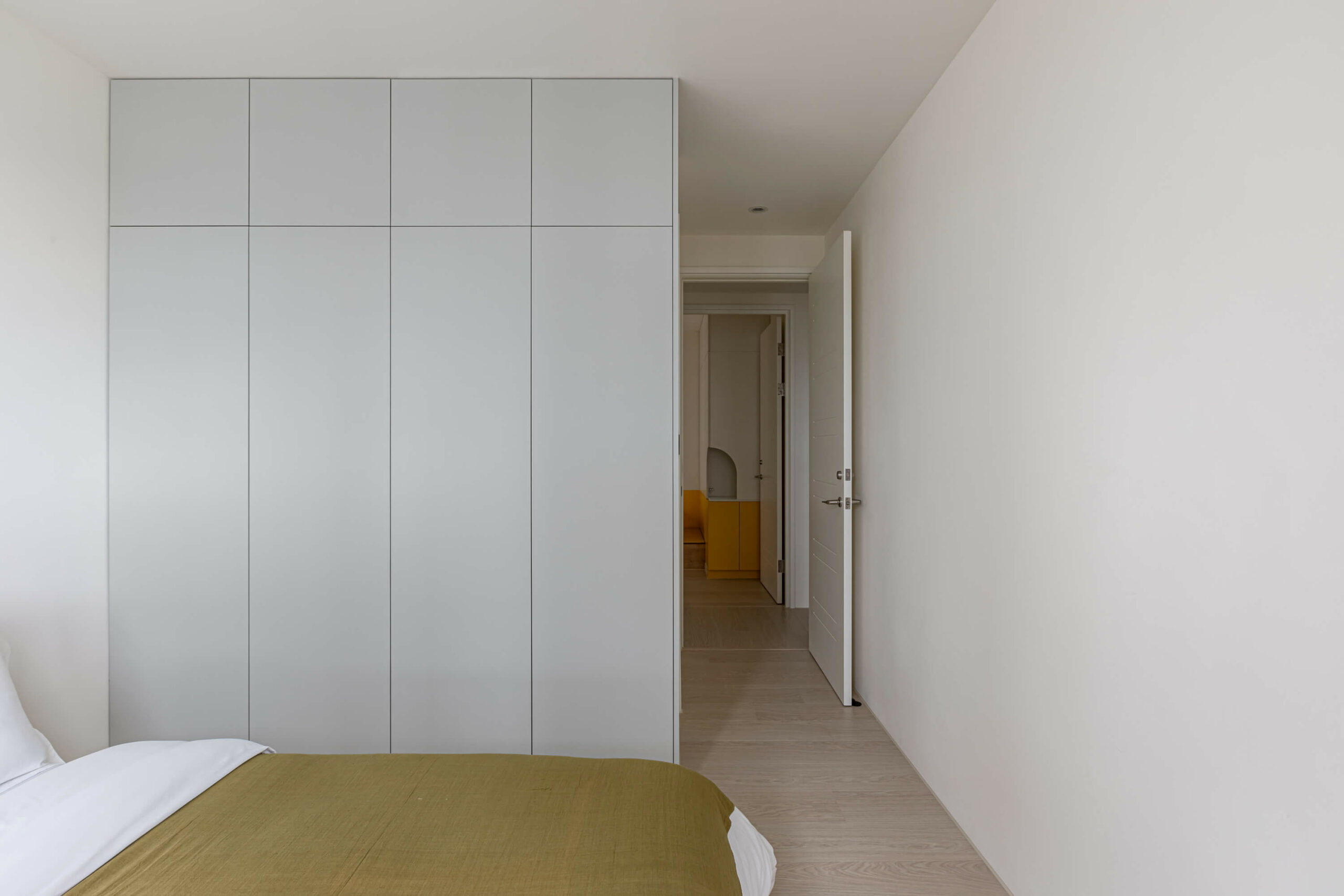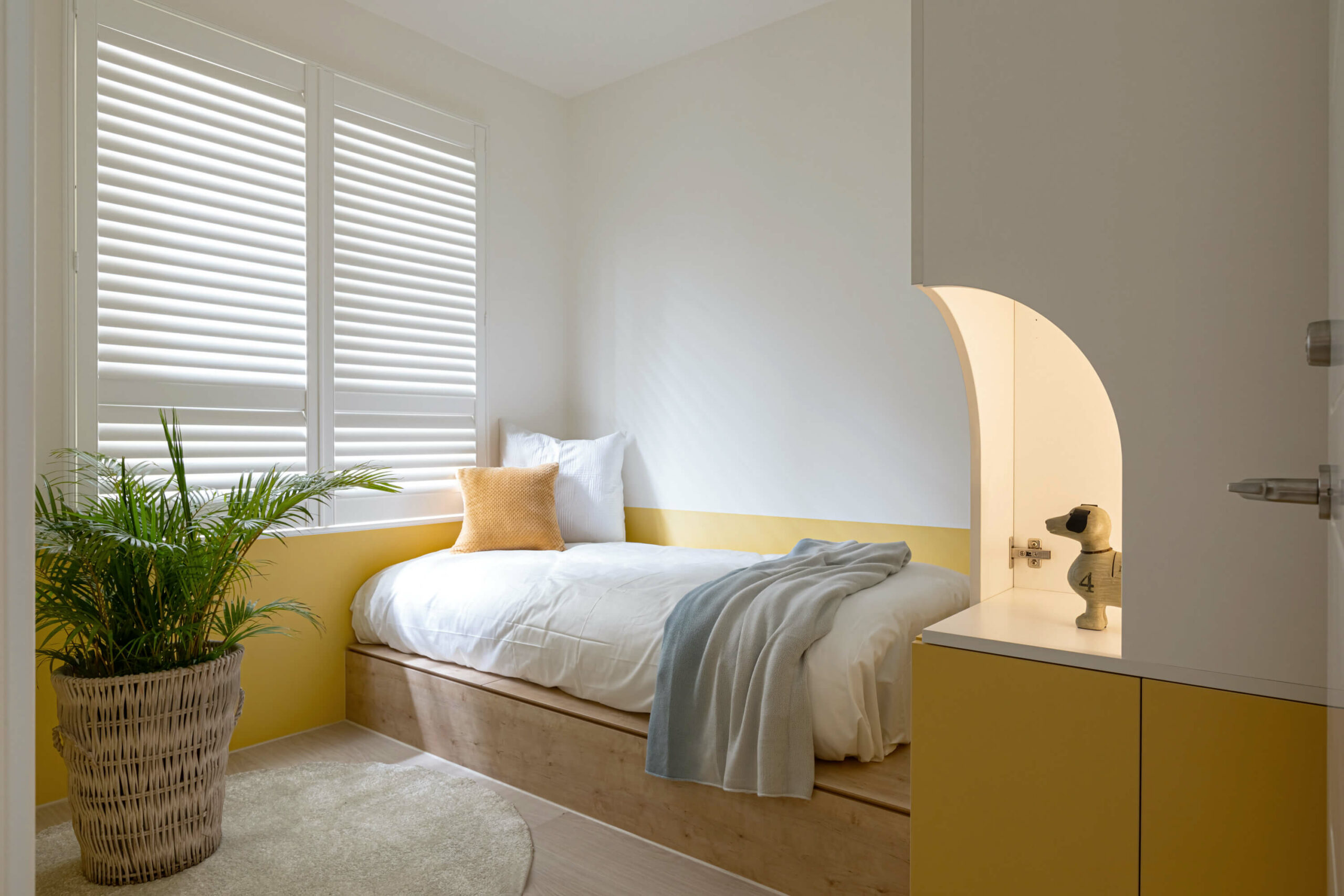 화이트와 옐로, 우드가 조화롭게 어우러져 발랄하고 경쾌한 분위기를 연출하고 있는 침실에는 다양한 수납공간이 효율적으로 내장되어 있는 빌트인장을 설치해 공간을 보다 깔끔하게 유지, 관리할 수 있도록 했다.