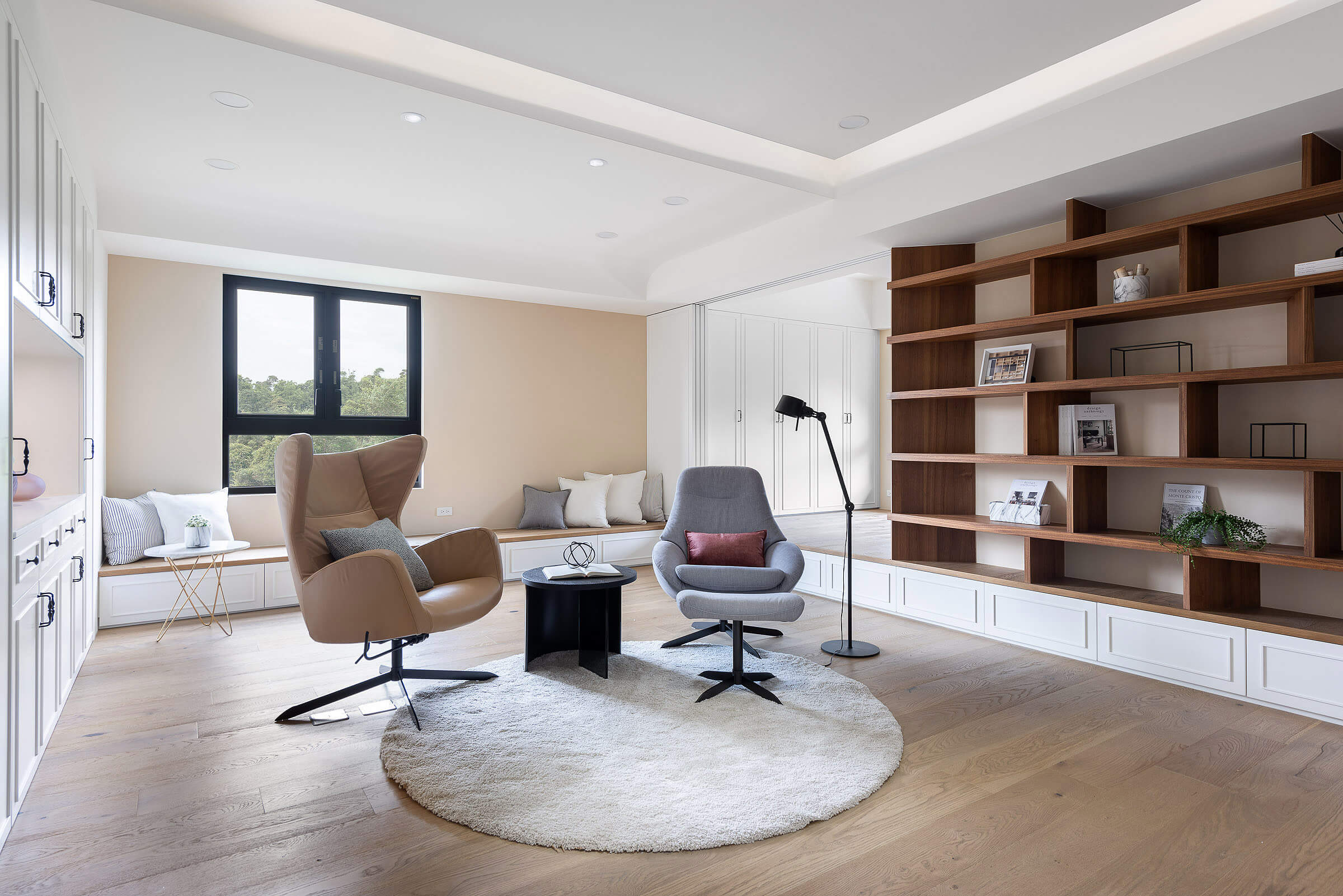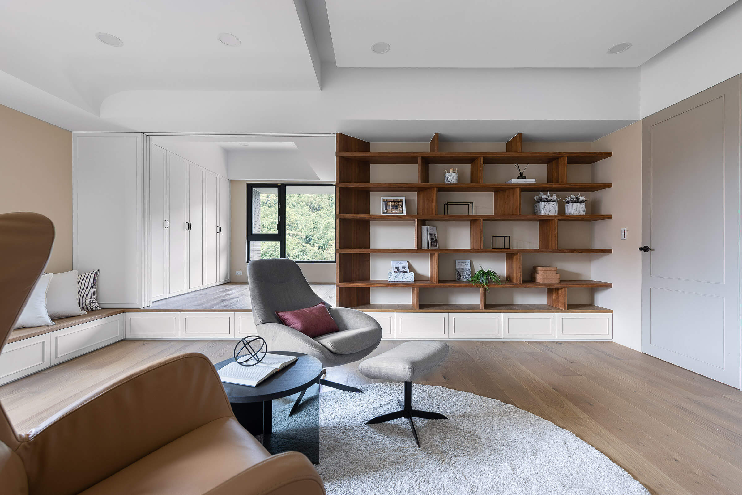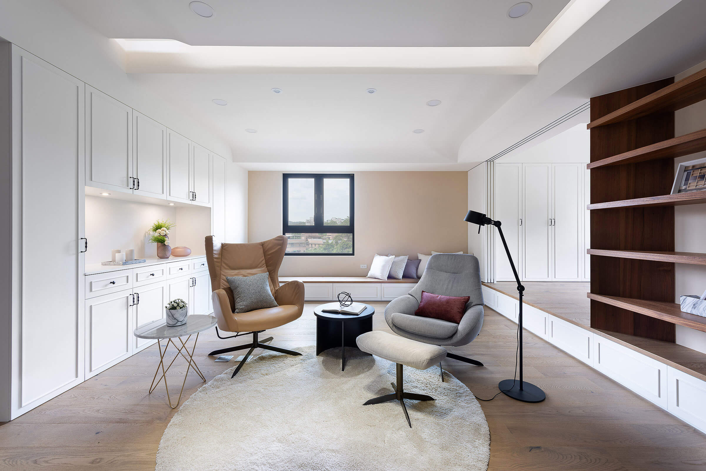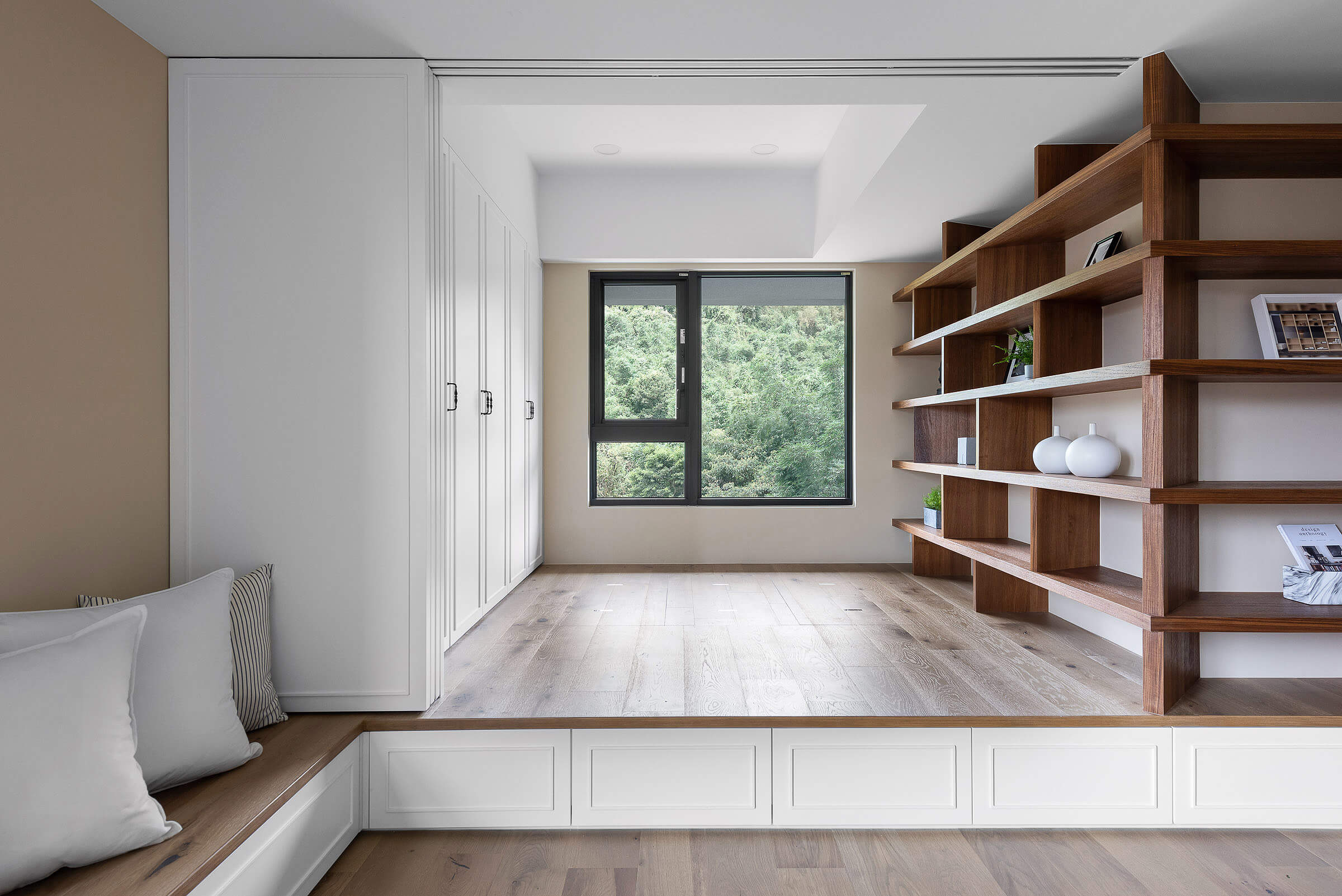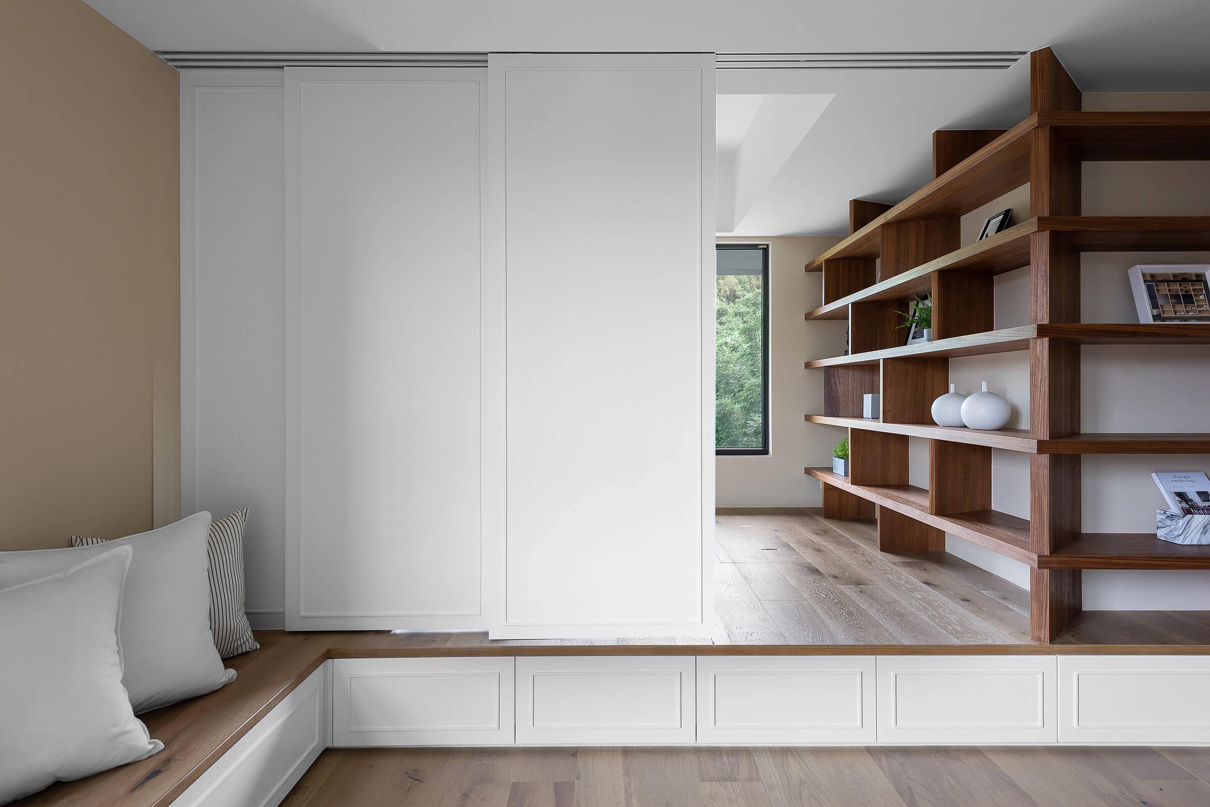 창가에 대형 윈도우 시트를 배치해 여유로운 일상을 즐길 수 있도록 한 거실에는 우드 선반장과 화이트 빌트인장을 조화롭게 설치해 진열과 보관이 깔끔하고 효율적으로 이루어질 수 있도록 했다.
