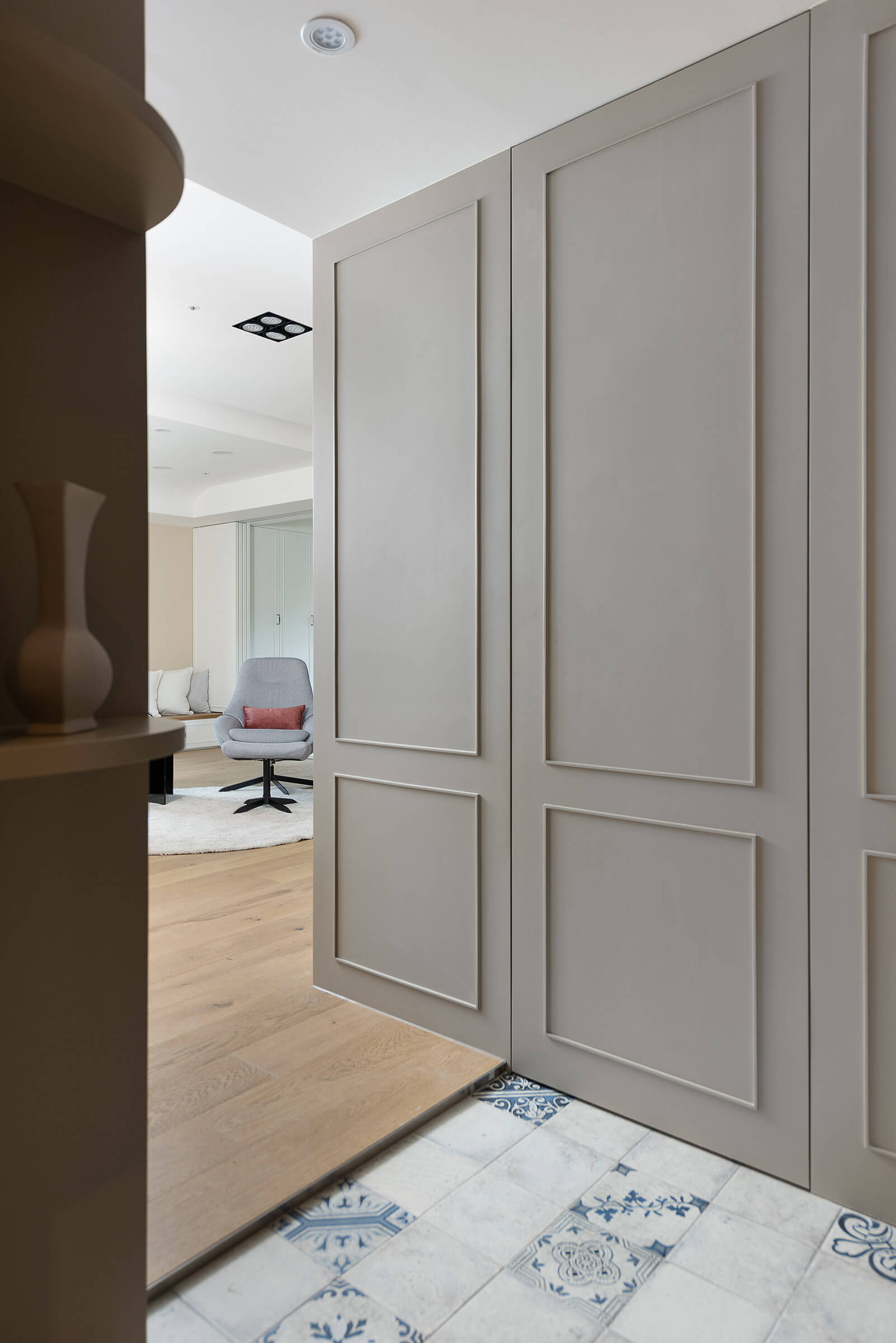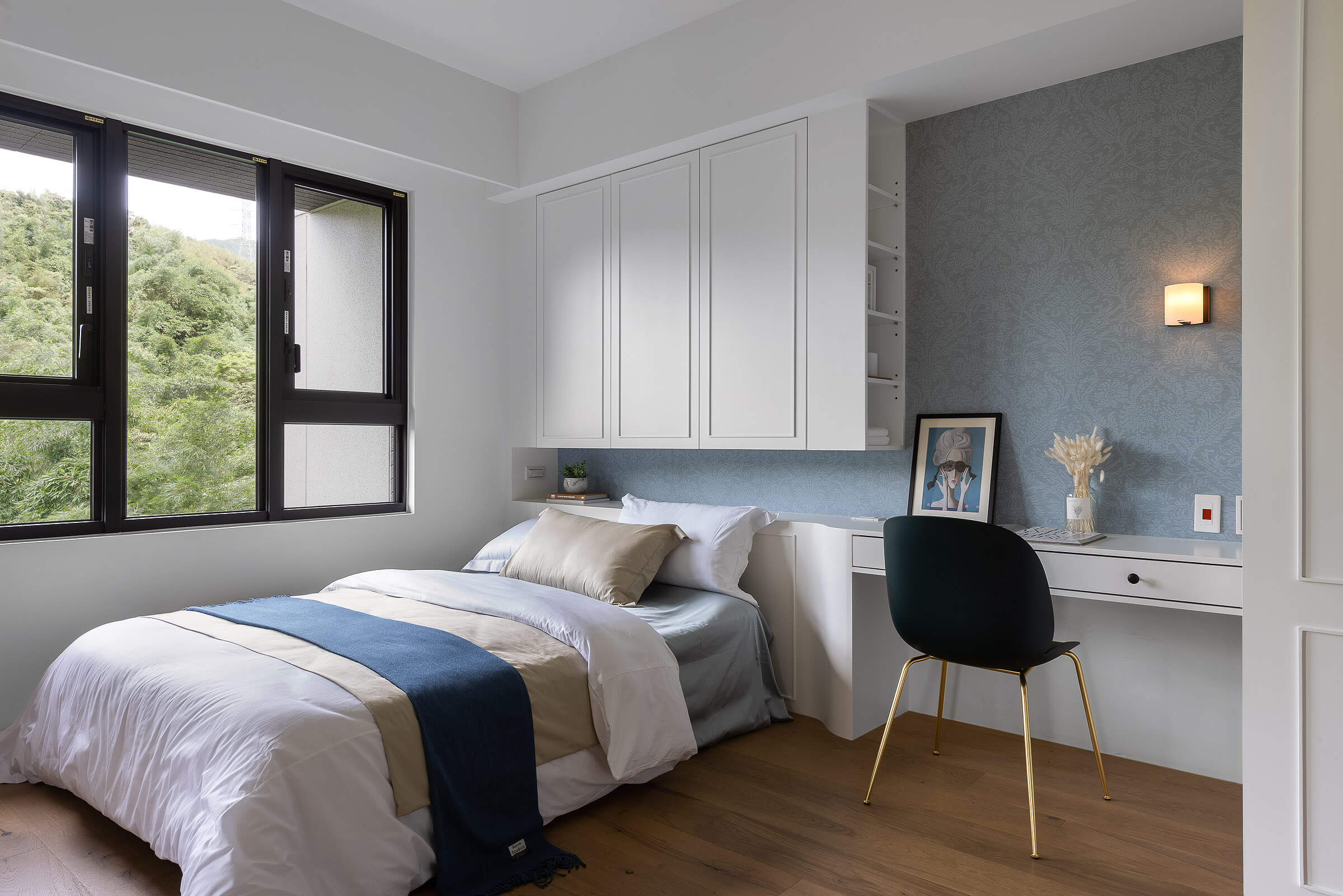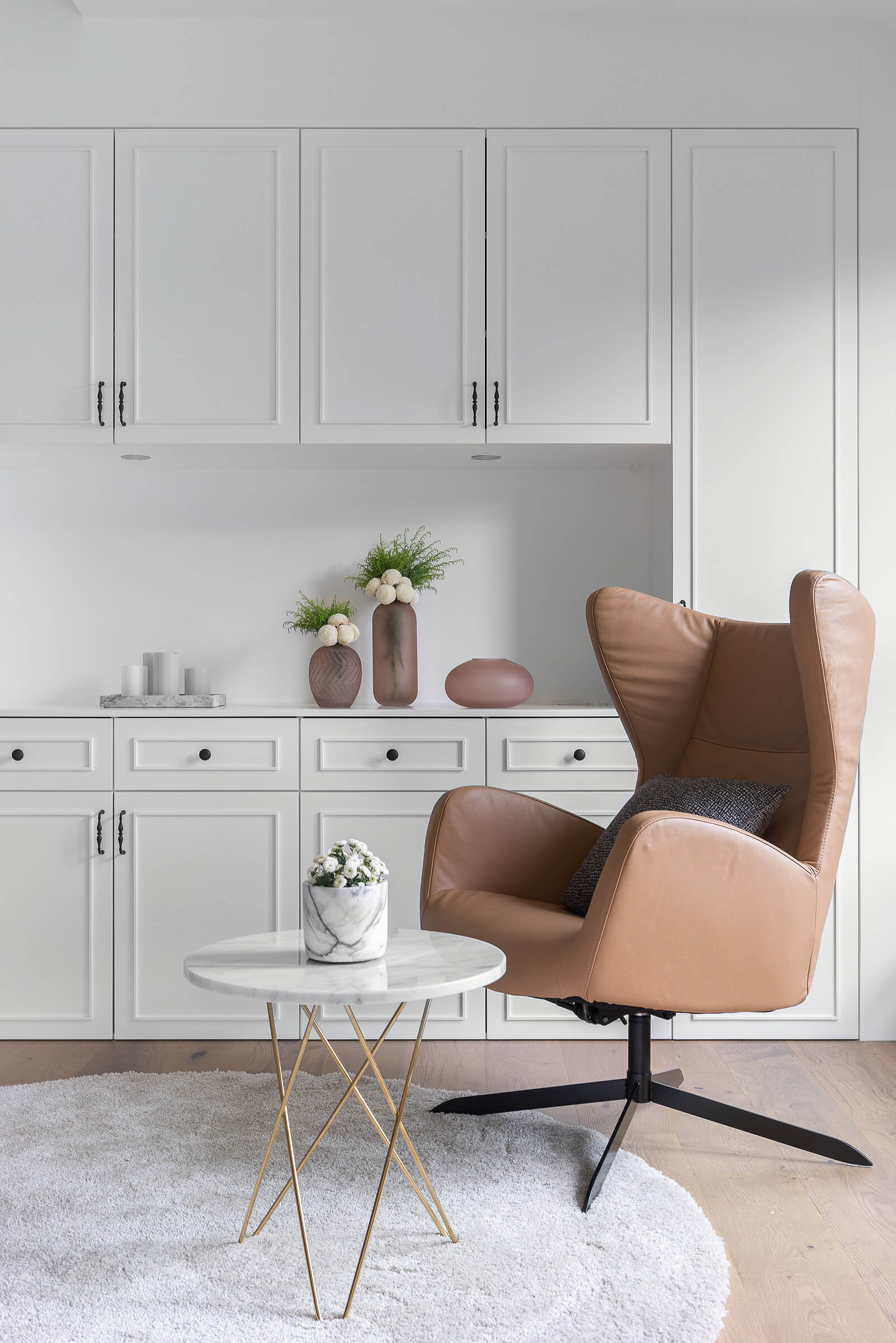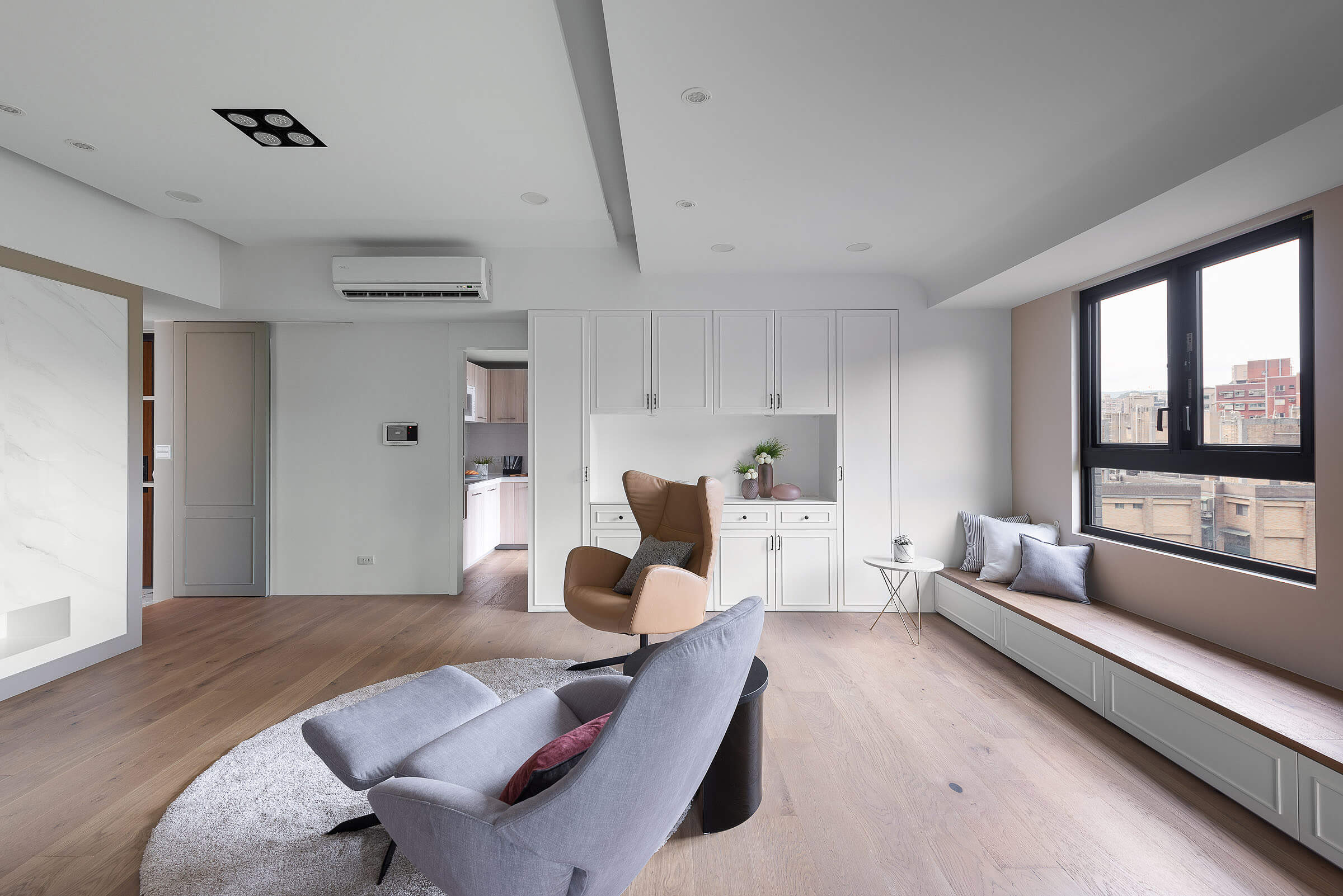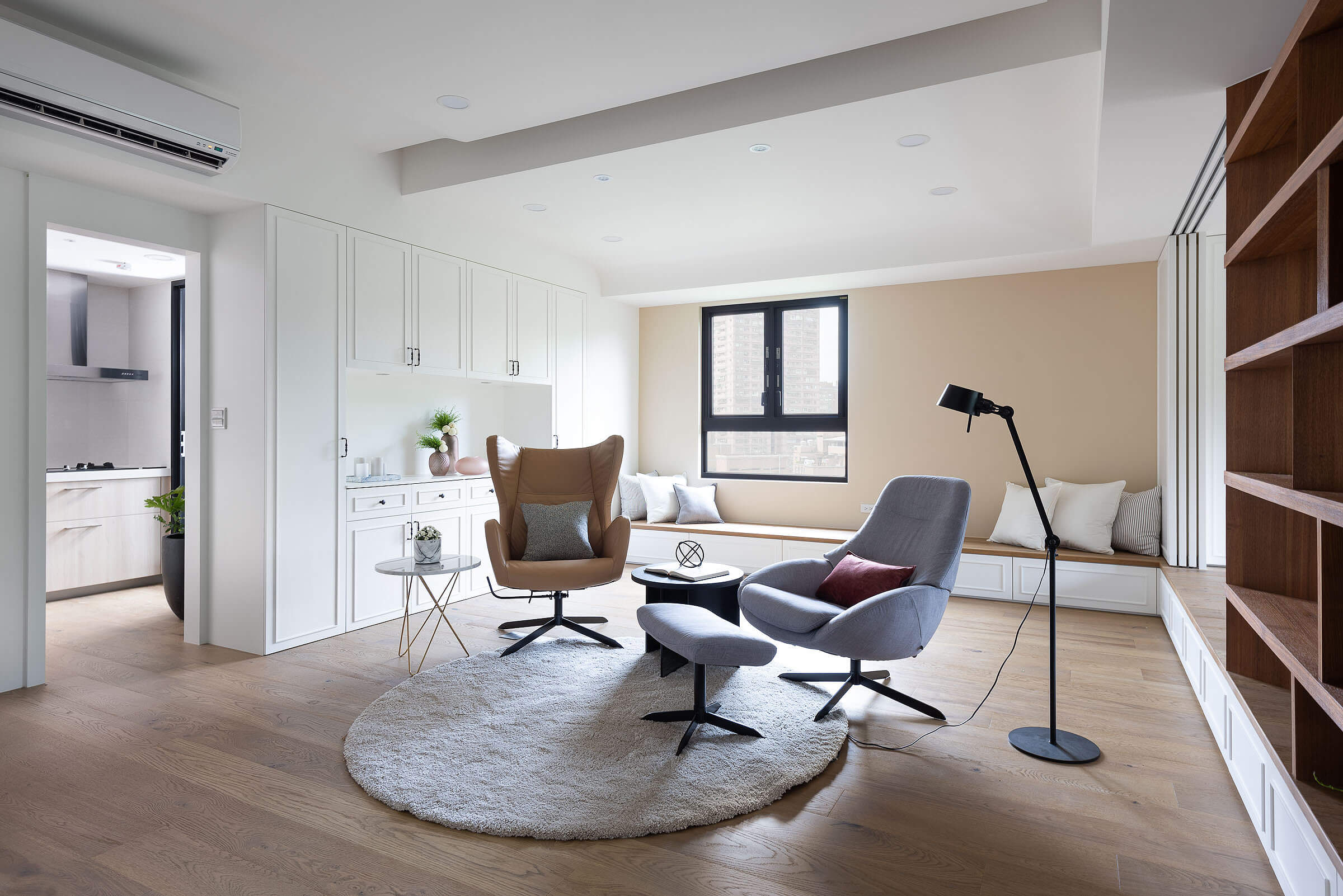 창가에 대형 윈도우 시트를 배치해 여유로운 일상을 즐길 수 있도록 한 거실에는 우드 선반장과 화이트 빌트인장을 조화롭게 설치해 진열과 보관이 깔끔하고 효율적으로 이루어질 수 있도록 했다.
