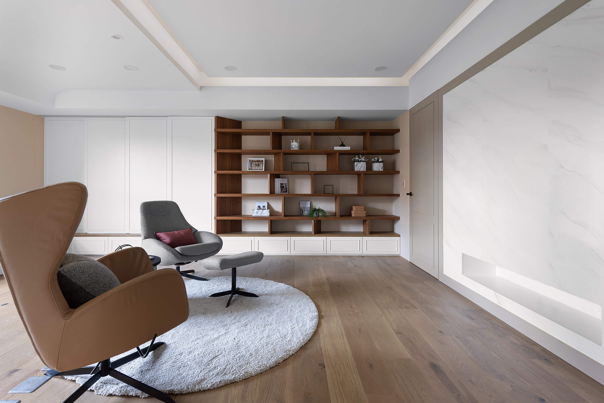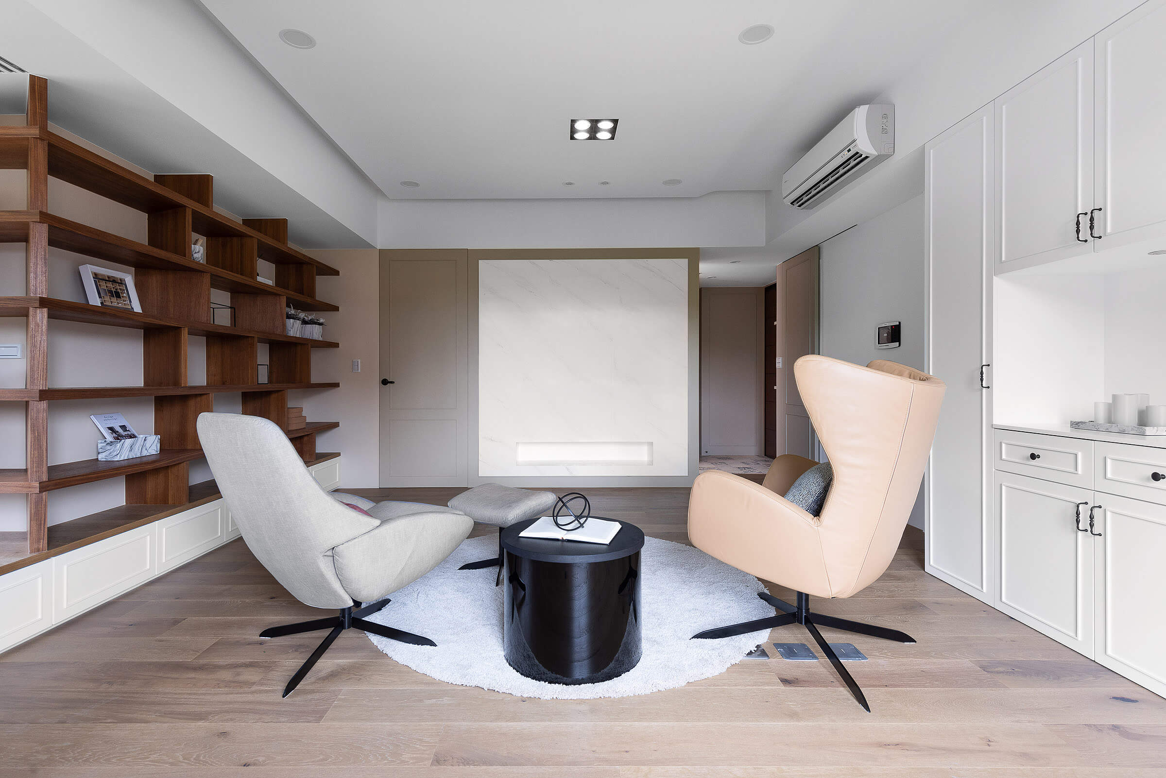 소파를 생략하고 라운지체어, 티 테이블, 조명, 러그 등으로 세련되게 꾸며진 거실은 독서를 좋아하는 가족의 라이프스타일에 반영한 심플하고 모던한 서재형 거실 인테리어를 잘 보여주고 있다.