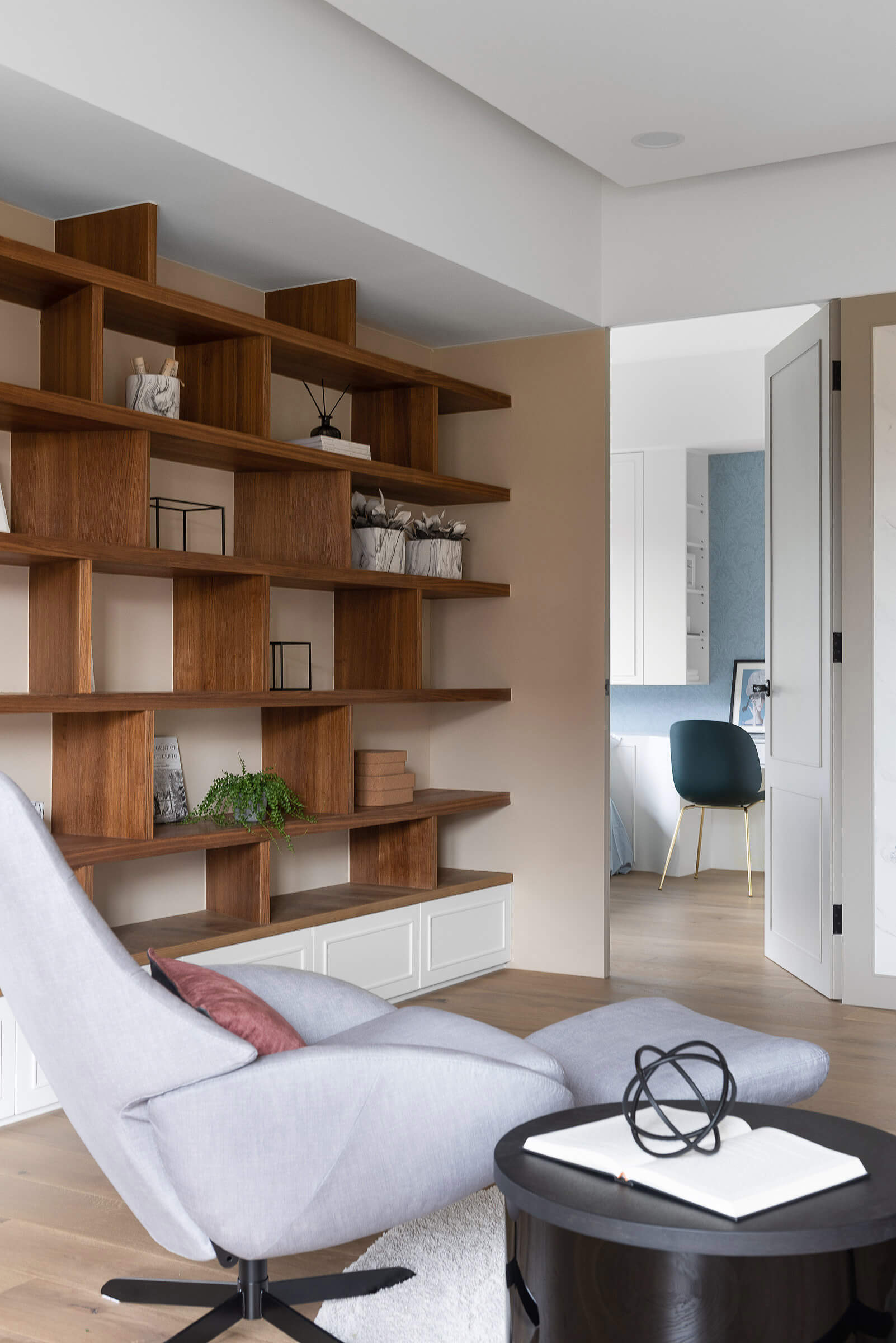 스킵 플로어로 거실과 자연스럽게 구분된 서재에는 공간의 개방과 분리가 손쉽게 이루어질 수 있는 슬라이딩 도어를 설치해 상황에 따라 공간을 유연하고 효율적으로 사용할 수 있도록 했다.