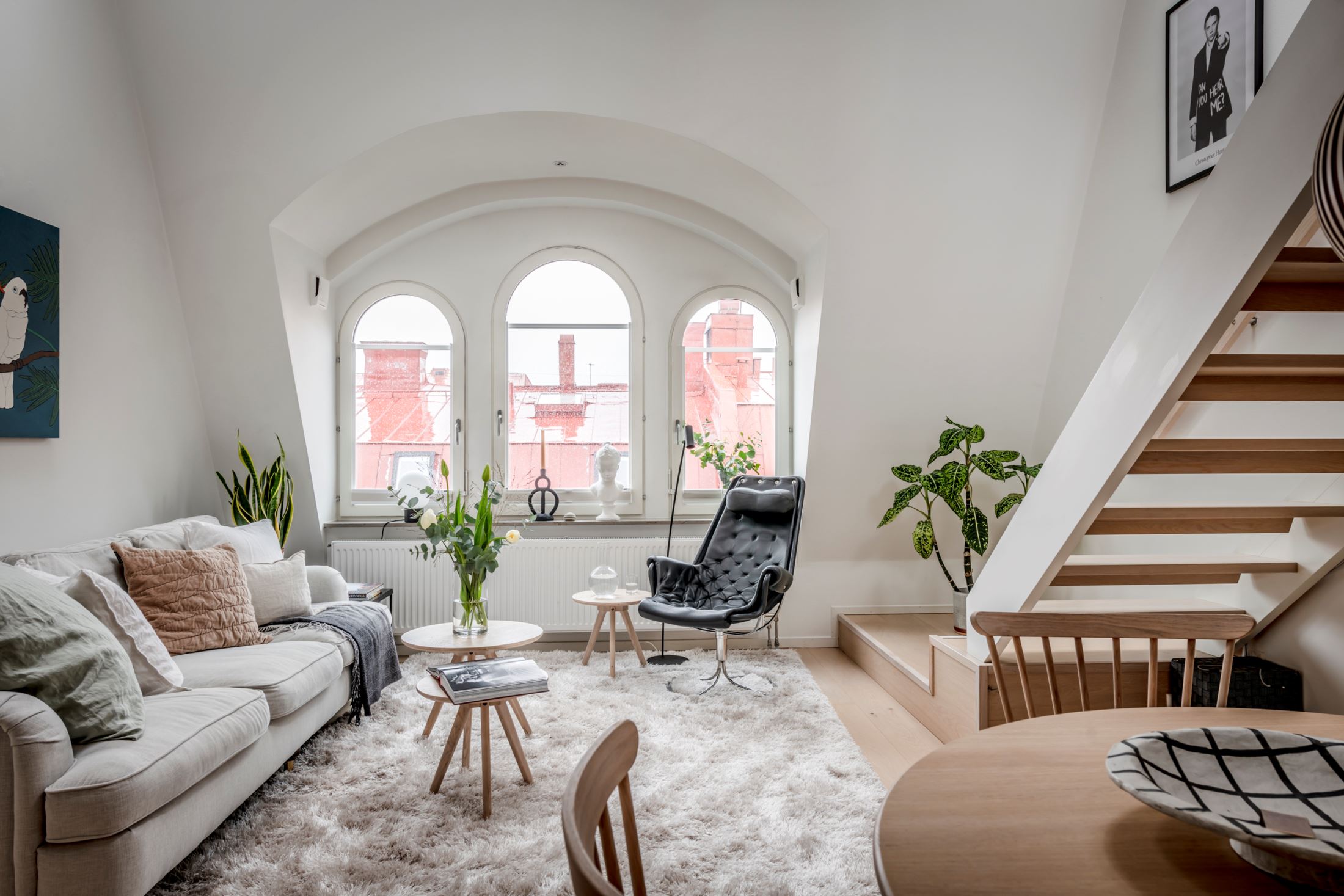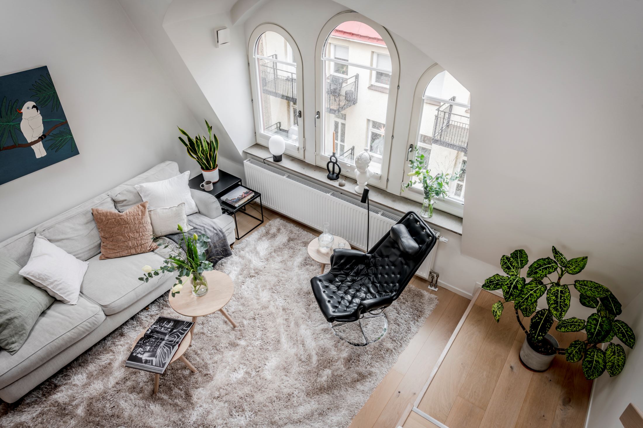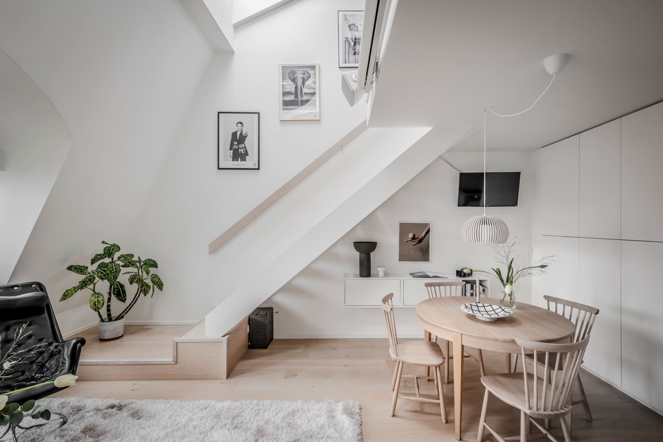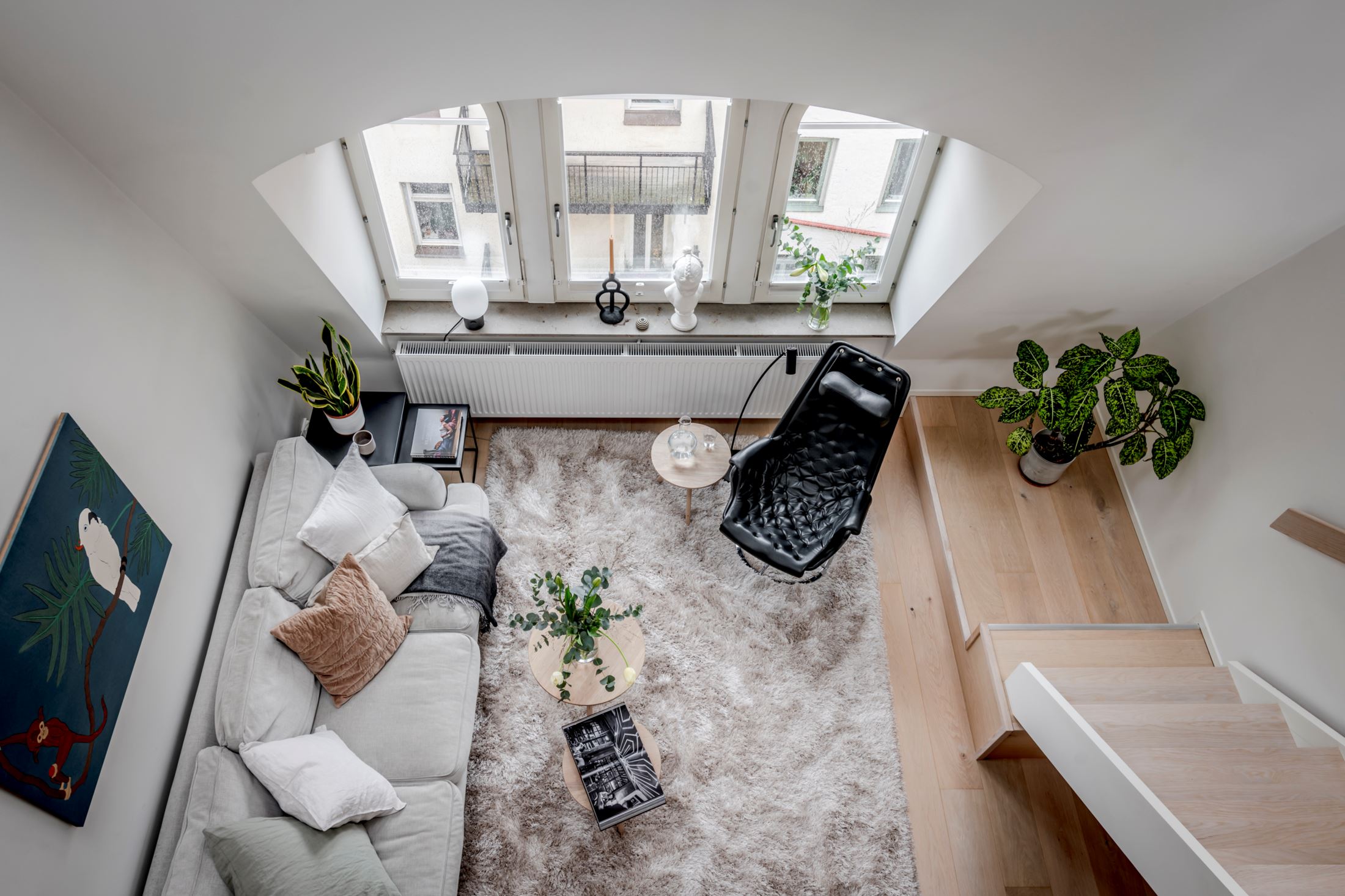무려 4.66m 높이의 높은 층고를 자랑하는 다락방을 리모델링해 만든 아름답고 세련된 복층 아파트가 시선을 모으고 있다. 스웨덴 예테보리에 위치한 55m²(17평) 크기의 이 집은 1인 가구 혹은 2인 가구를 위한 매력적인 보금자리를 제안하고 있다.