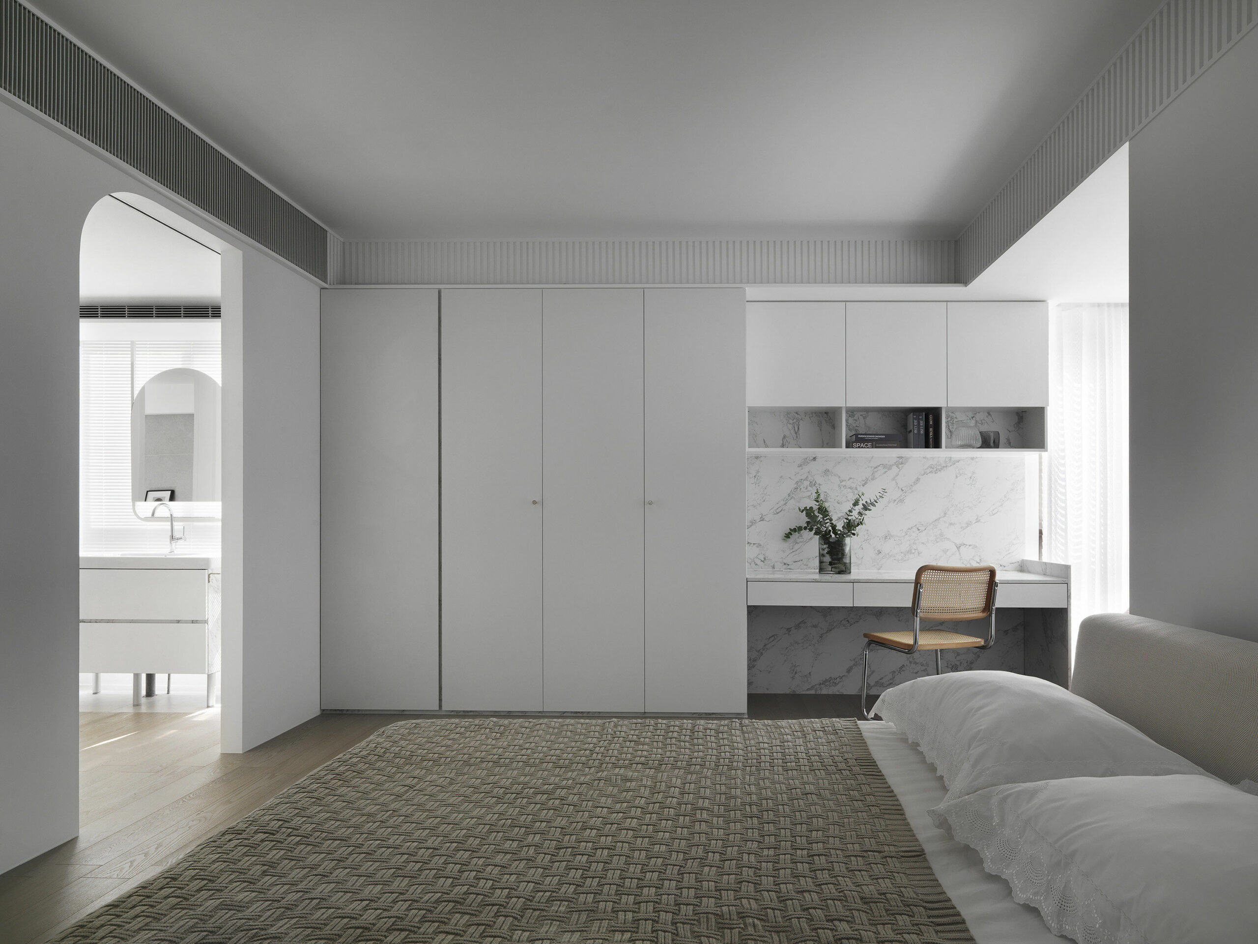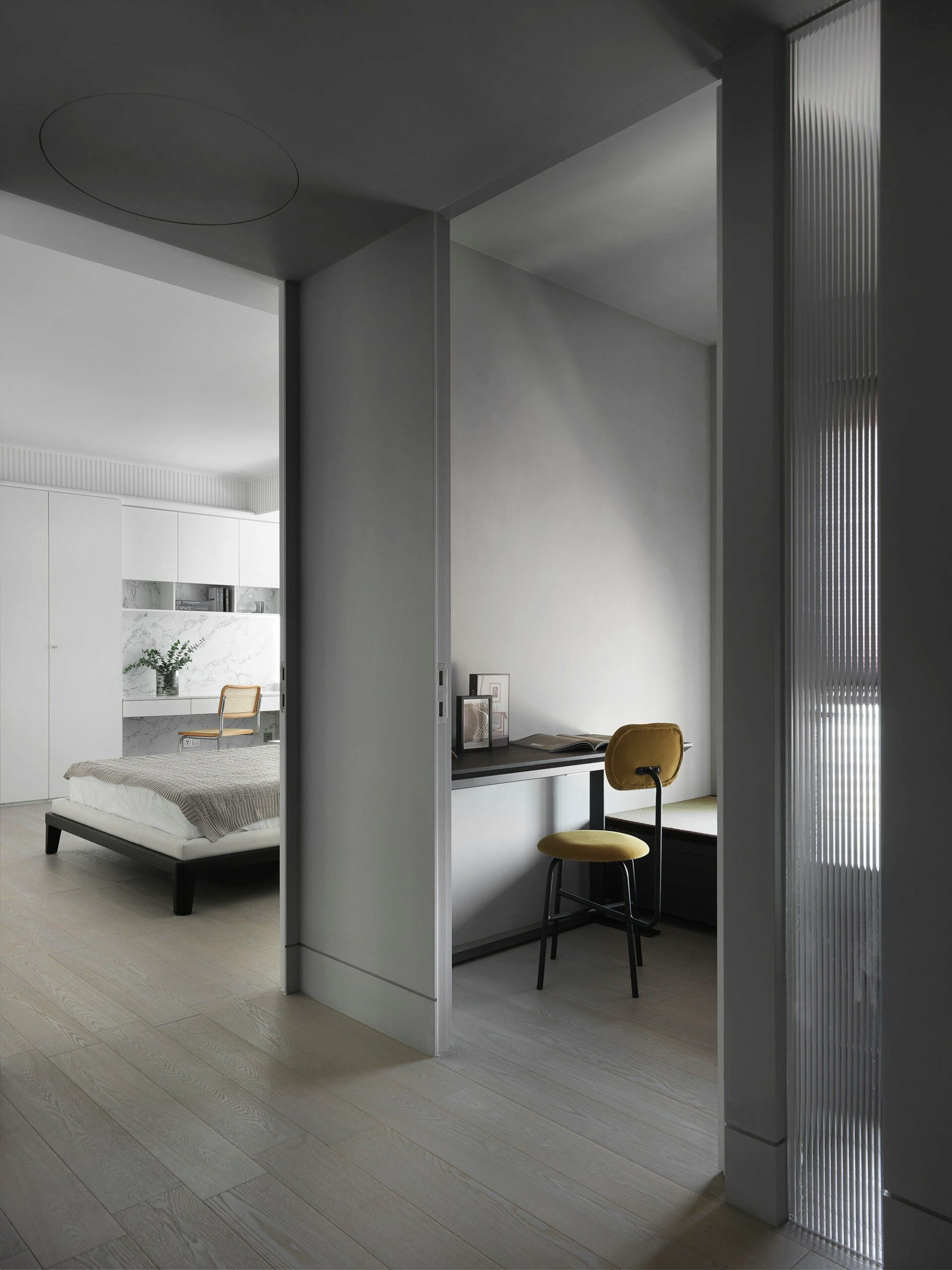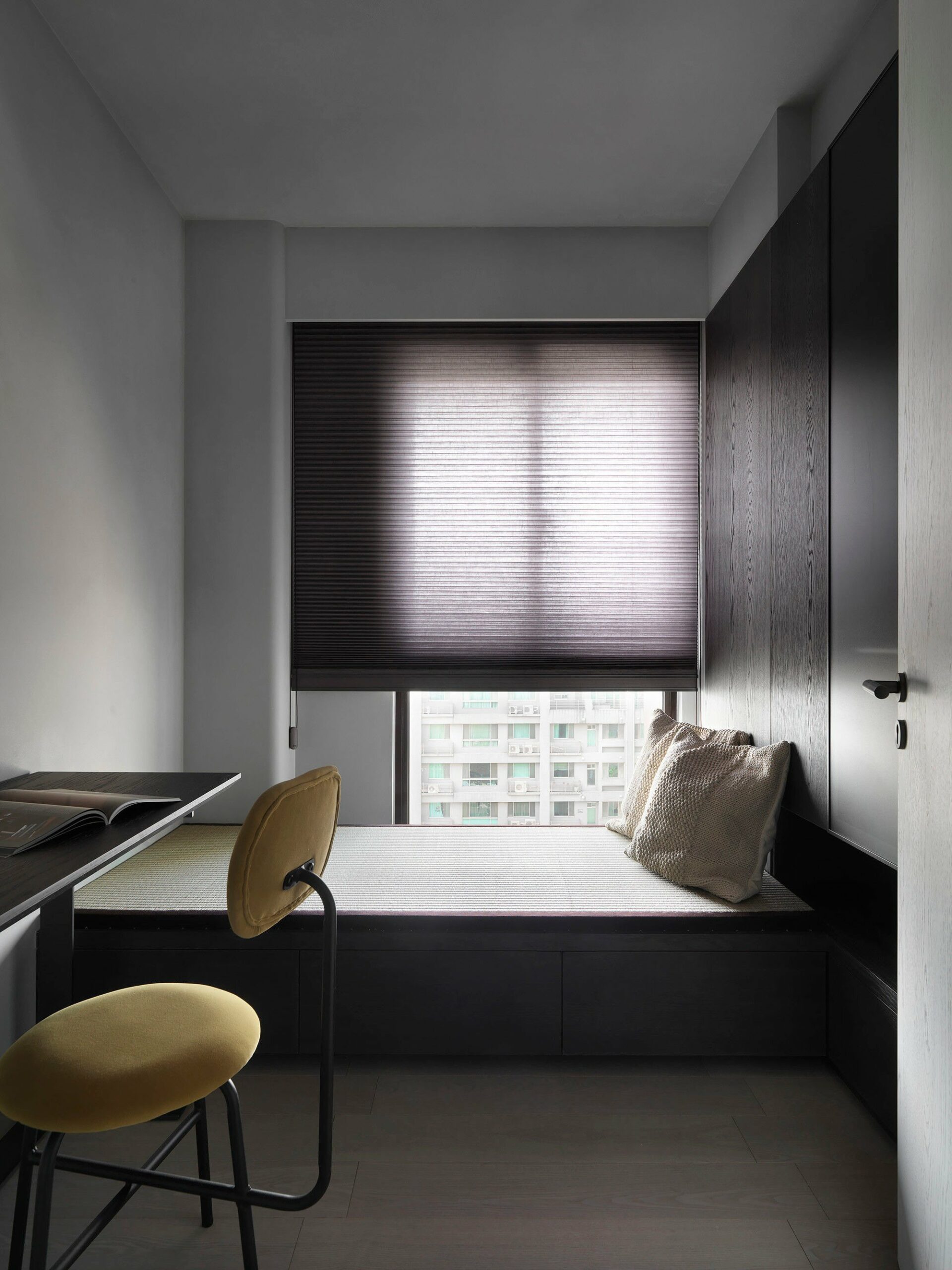책상과 윈도우 시트, 빌트인장으로 깔끔하게 꾸며진 홈 오피스는 업무, 작업, 학습 등에 집중할 수 있는 조용한 독립 공간으로 디자인되었다.