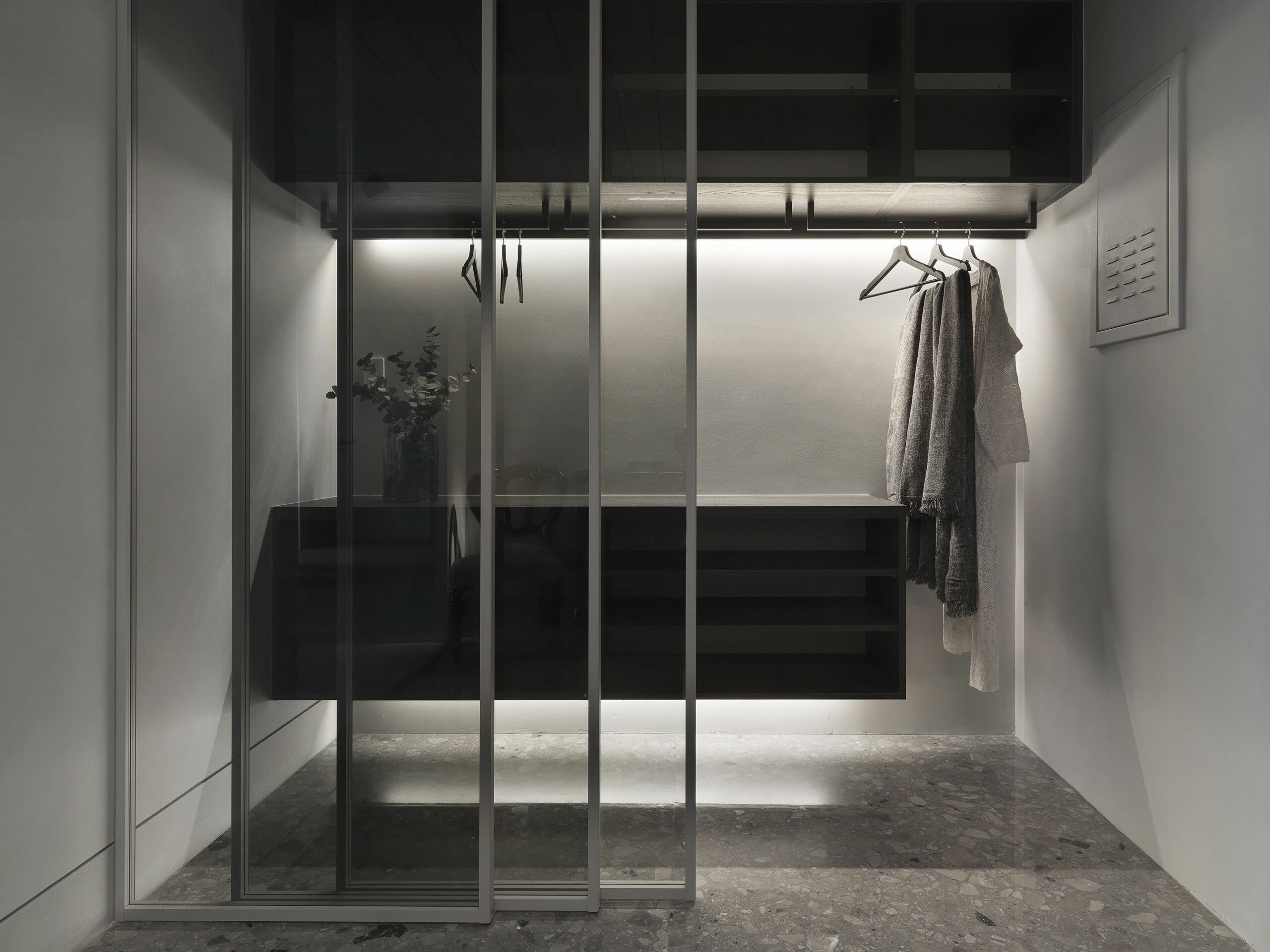투명한 글라스 슬라이딩 도어 안에 수납장과 행거로 구성된 효율적인 수납공간이 설치된 현관은 한 번 쯤 시도하고 싶은 깔끔하고 세련된 현관 인테리어를 잘 보여주고 있다.