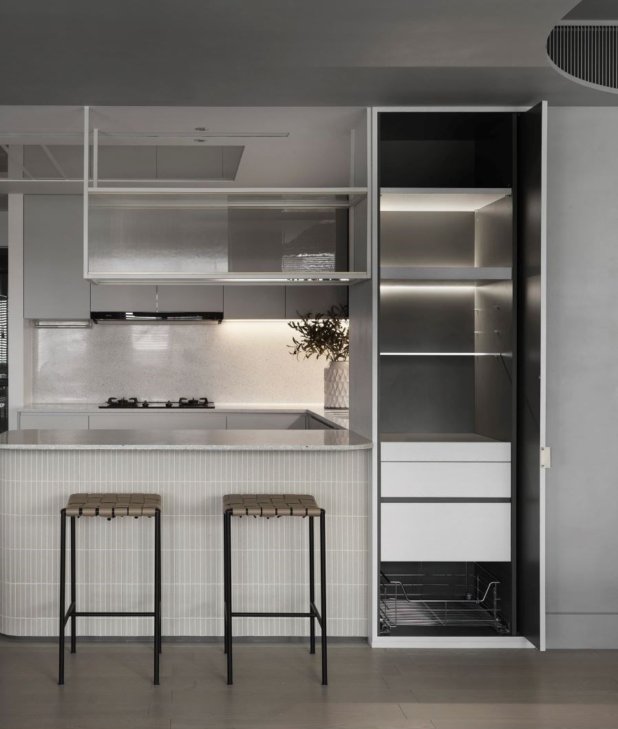 간접 조명으로 은은한 포인트를 준 L자형 빌트인 싱크대와 홈바가 함께 설치된 주방은 심플하지만 고급스러운 디자인, 실용적인 구성, 효율적인 동선이 조화롭게 어우러져 세련된 모던 키친을 선보이고 있다.