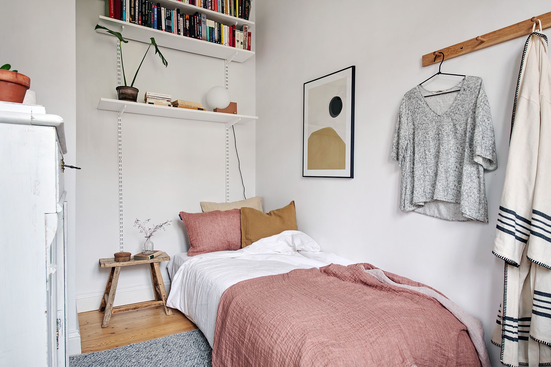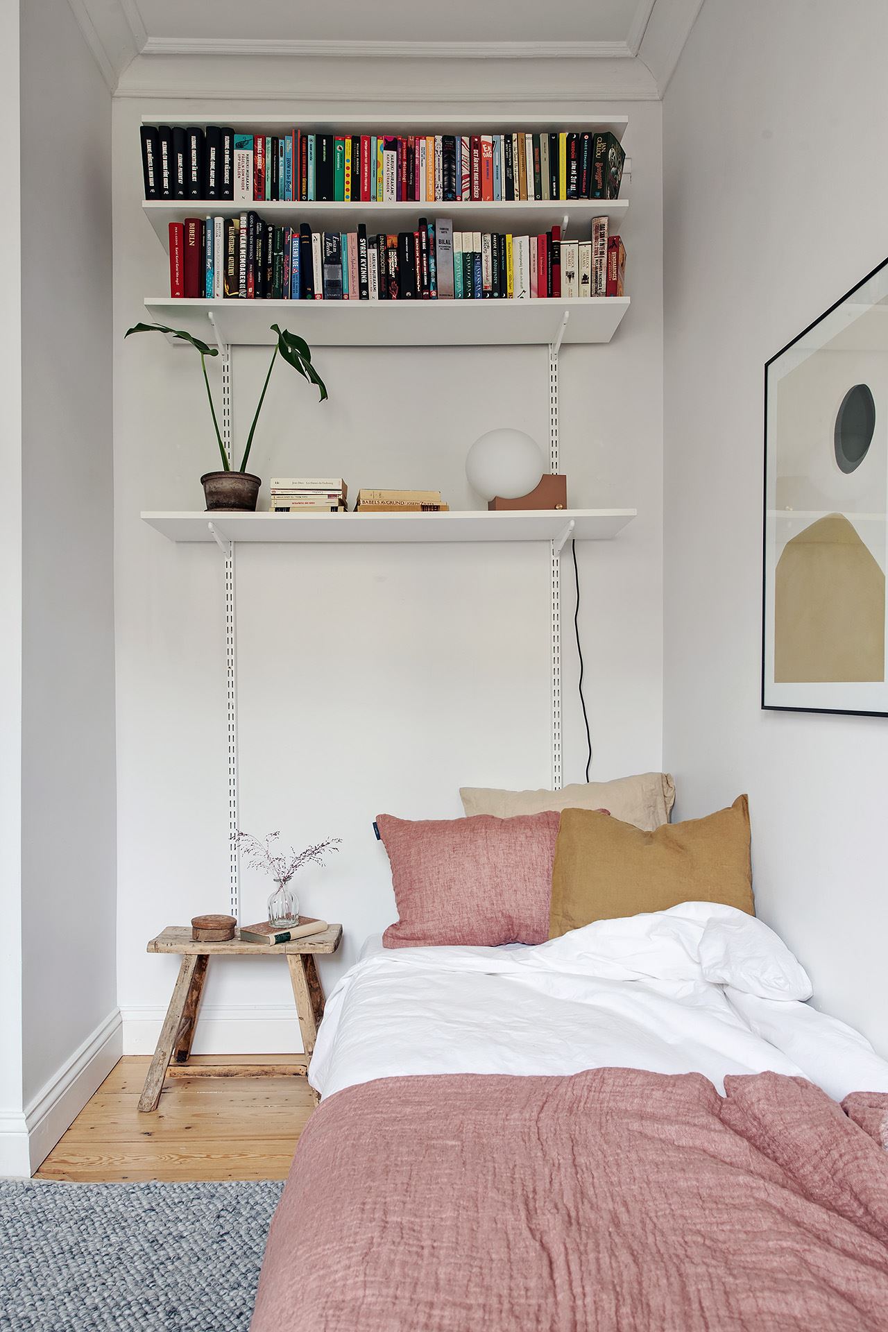 아름다운 컬러 포인트로 사랑스러운 분위기를 연출하고 있는 게스트 침실은 작은 공간을 활용한 예쁜 침실 인테리어로 눈길을 끈다.