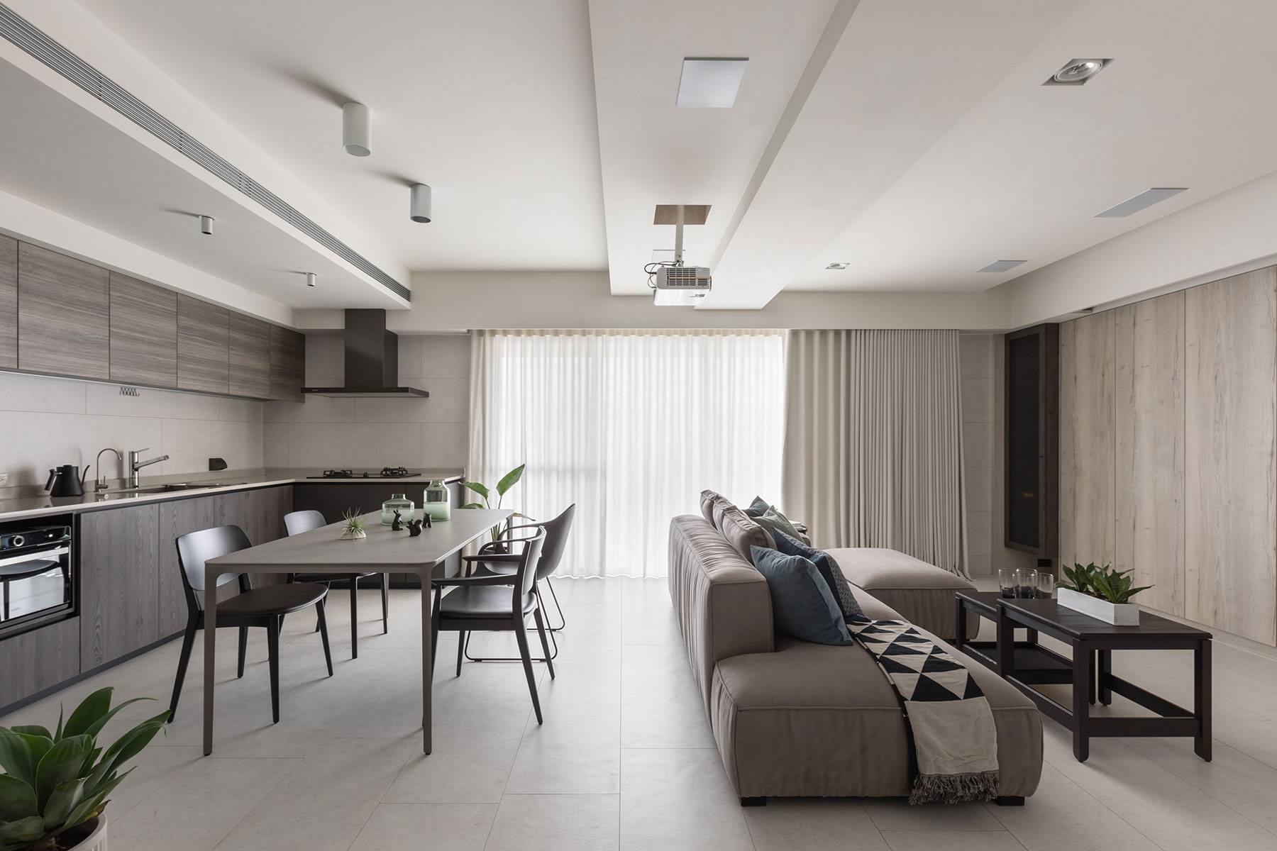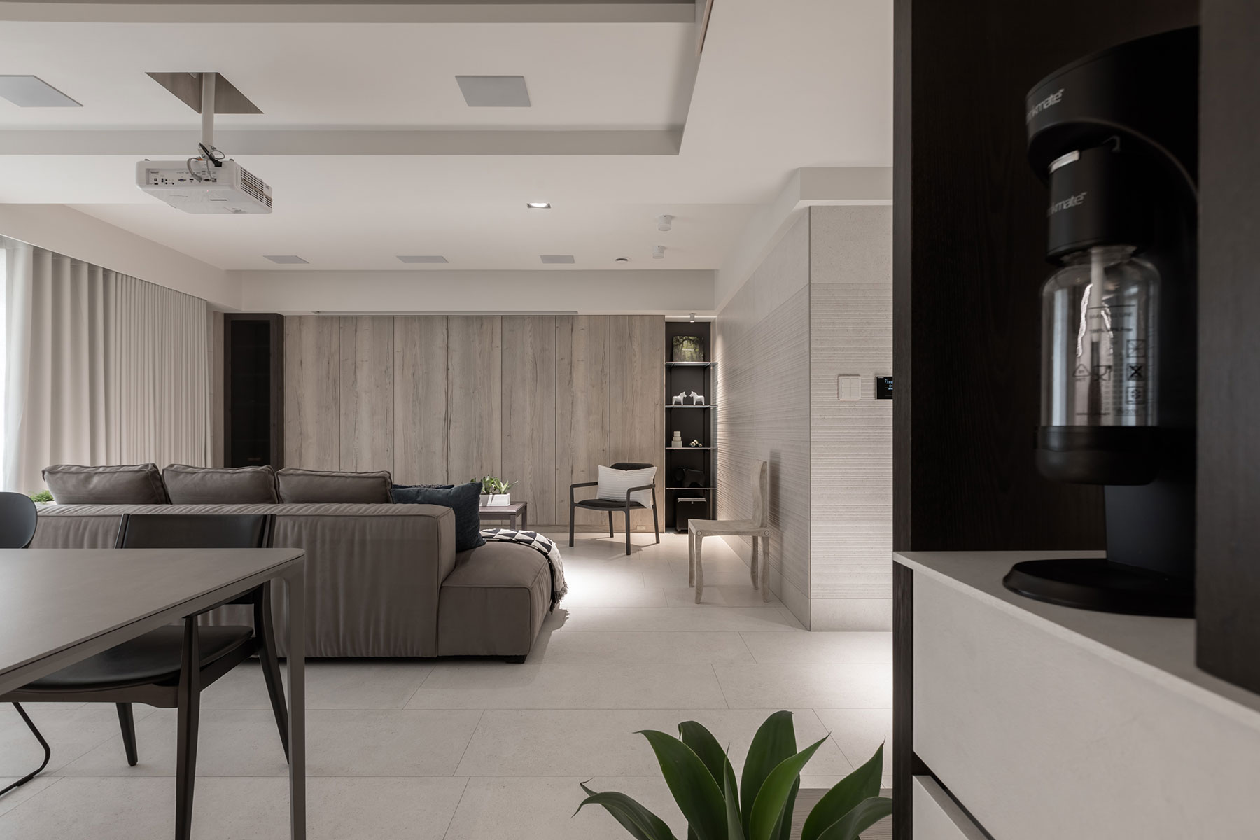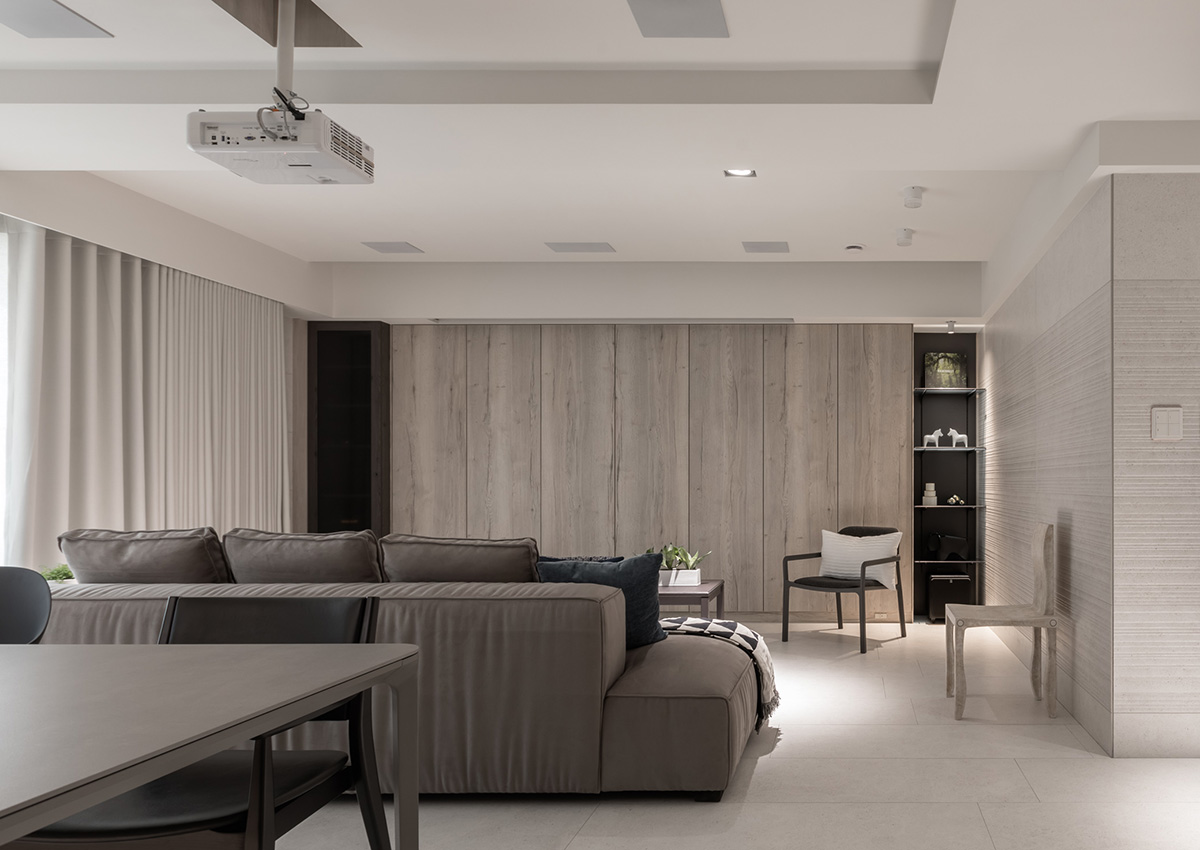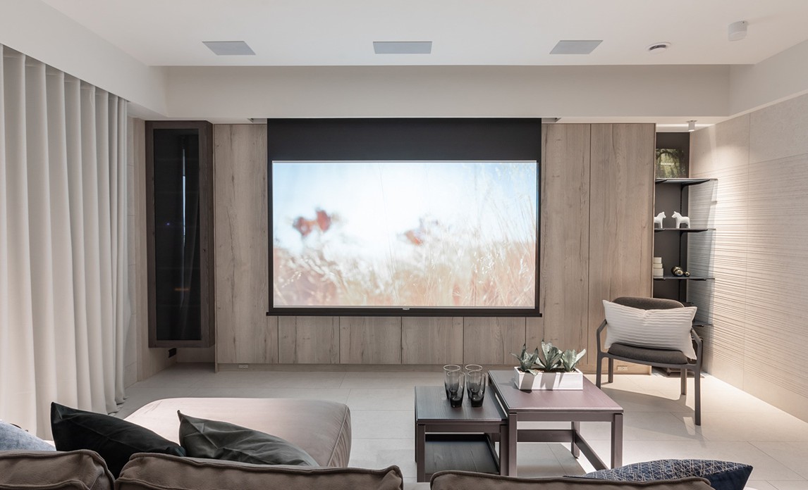 TV 대신 프로젝터와 스크린이 설치된 거실의 경우 다양한 수납공간을 내장하고 있는 빌트인 캐비닛을 중심으로 소파, 암체어, 티 테이블 등을 단정하게 배치해 깔끔하고 세련된 거실 공간을 연출하고 있다.