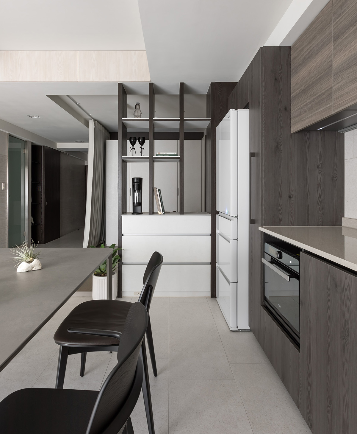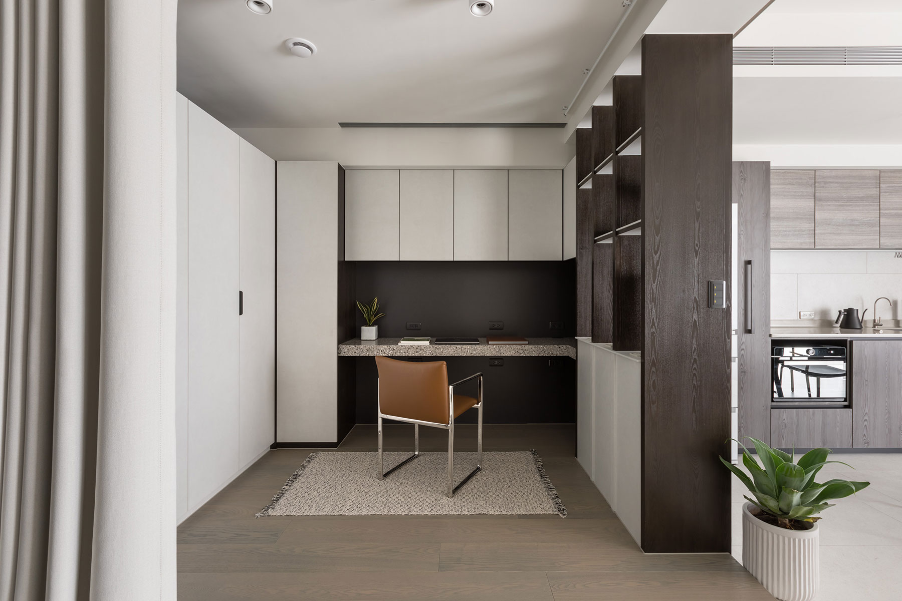 커튼이 설치되어 상황에 따라 개방과 분리가 자유로운 서재 겸 홈 오피스는 업무, 학습, 작업, 독서 등에 집중할 수 있는 효율적인 공간으로 디자인되었다.