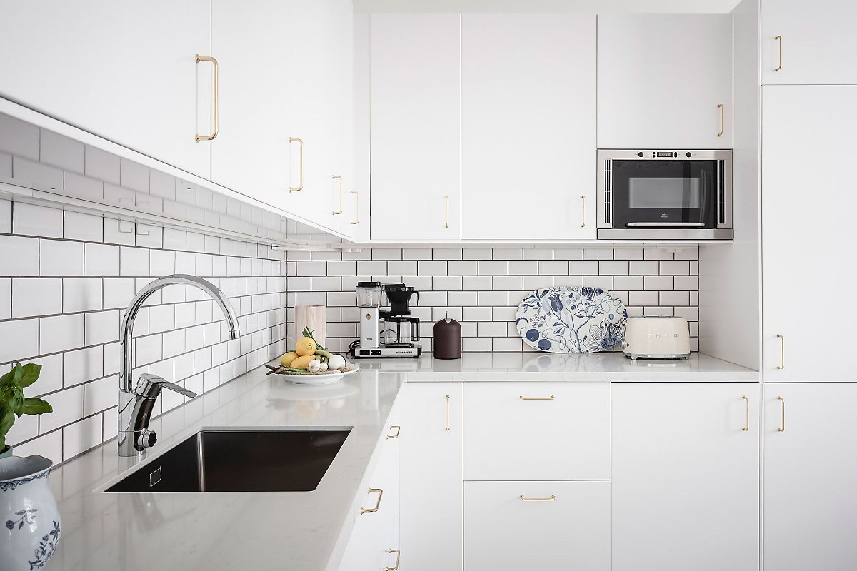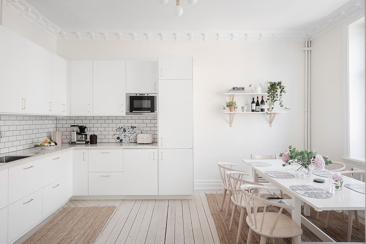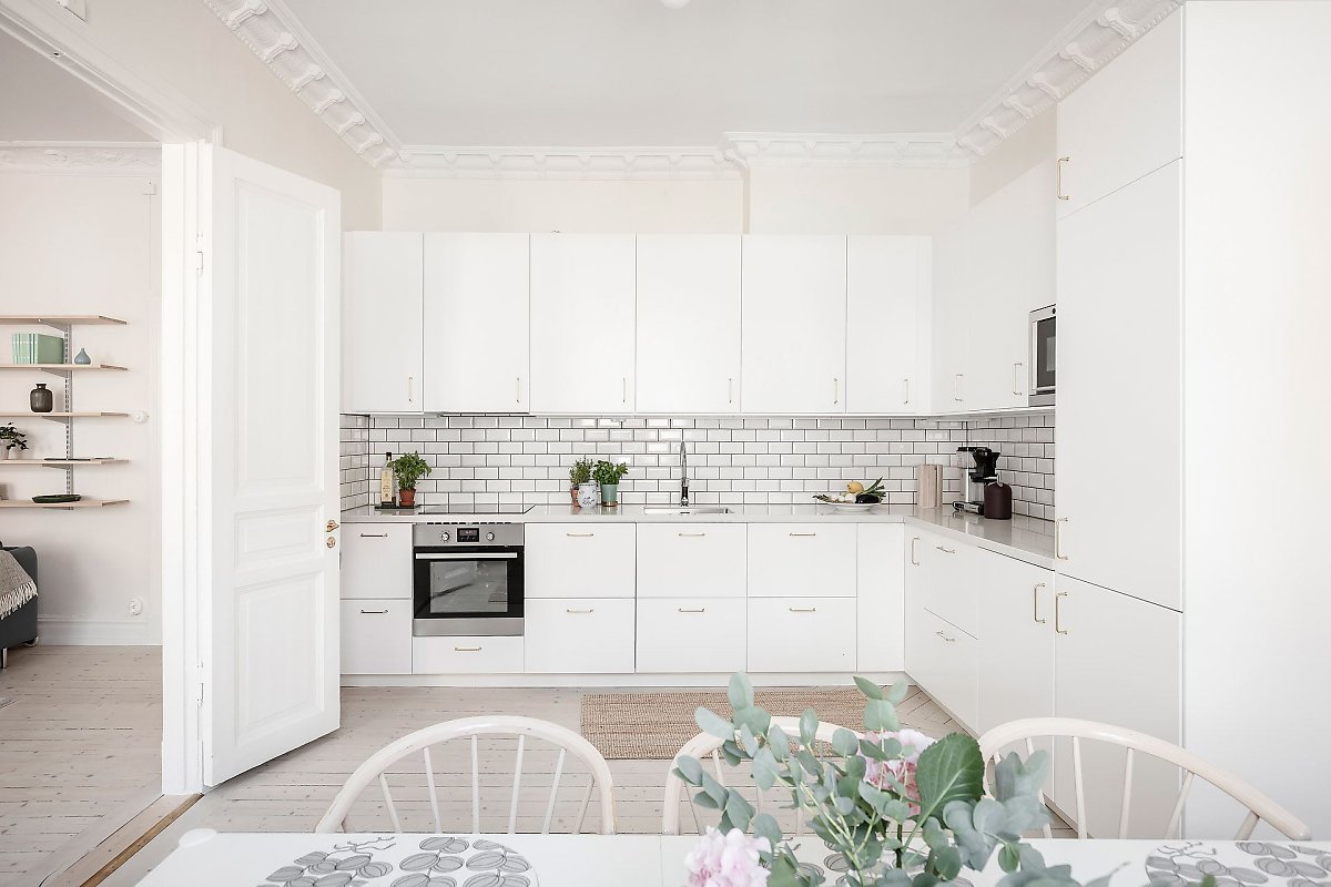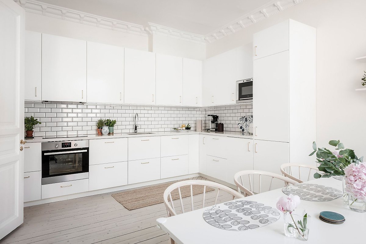 화이트 타일로 백스플래쉬를 깔끔하게 마감해 사용과 관리에 편리를 더한 주방에는 넉넉한 수납공간을 내장하고 있는 심플한 디자인의 L자형 화이트 빌트인 싱크대를 설치해 깔끔하고 효율적인 주방 공간을 선보이고 있다.