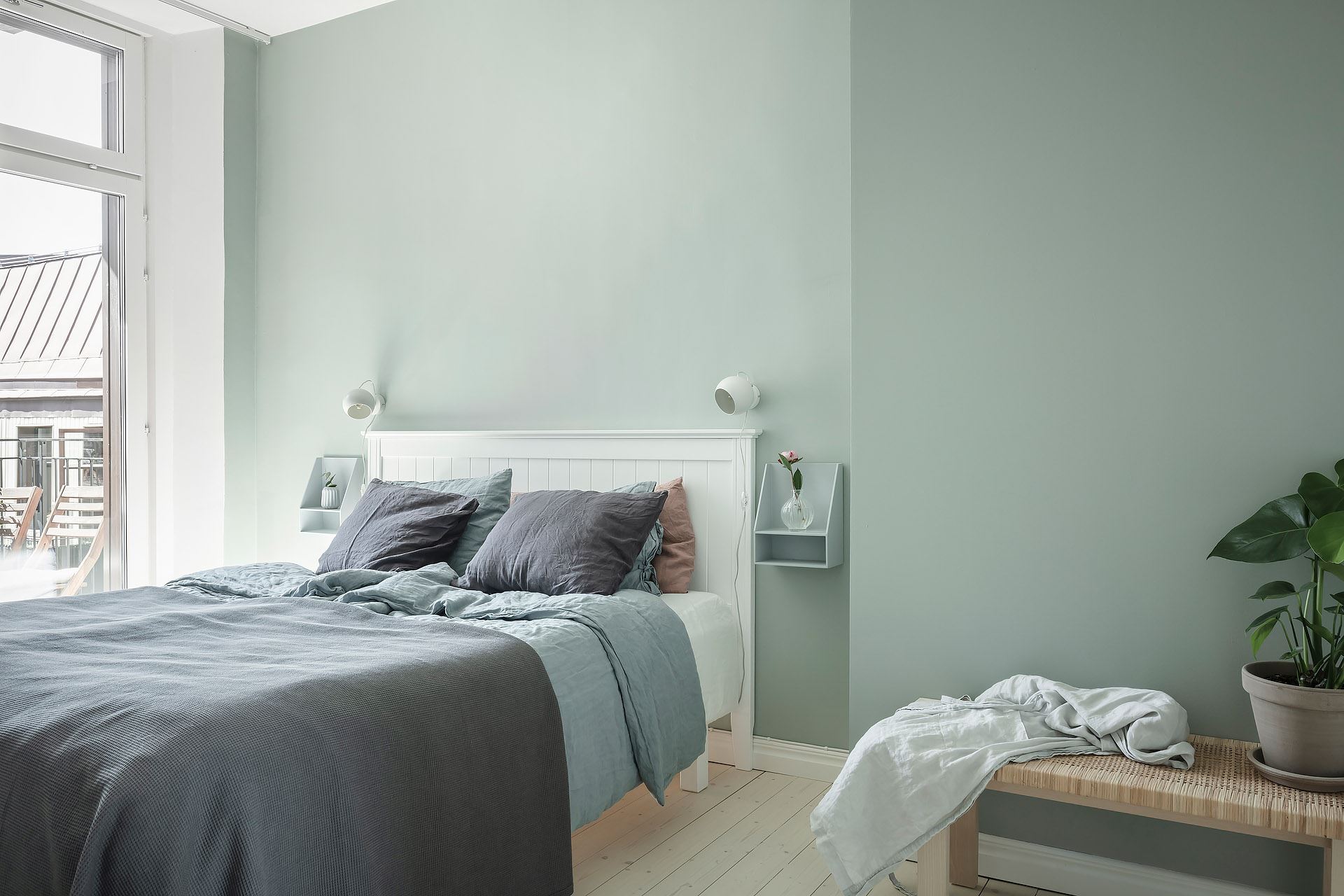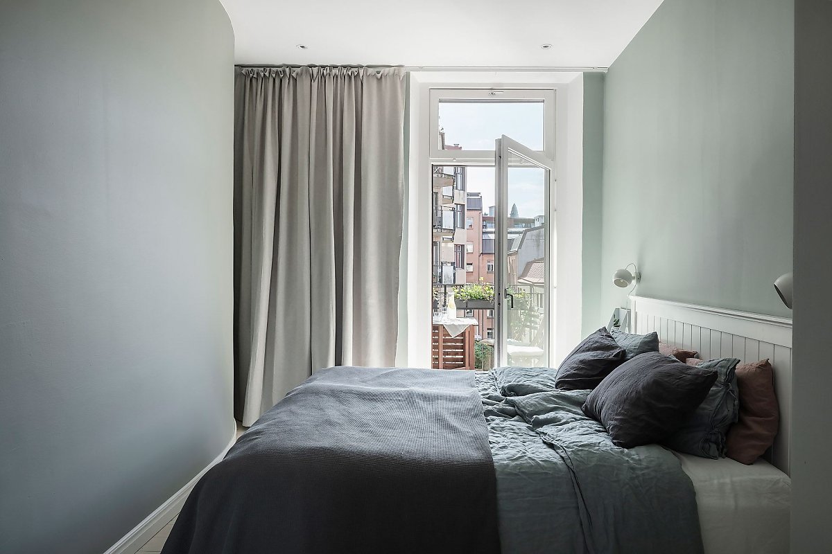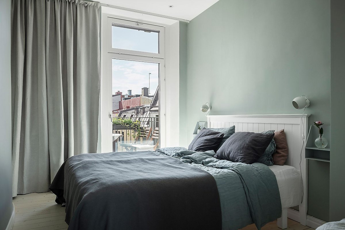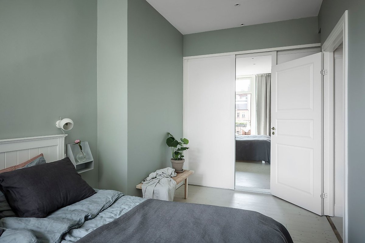 대형 빌트인장으로 수납을 깔끔하게 해결한 침실의 경우 아늑한 그레이 그린 컬러로 내벽을 마감한 후, 꼭 필요한 가구들을 단정하게 배치해 편안하고 세련된 프라이빗 공간을 선보이고 있다.