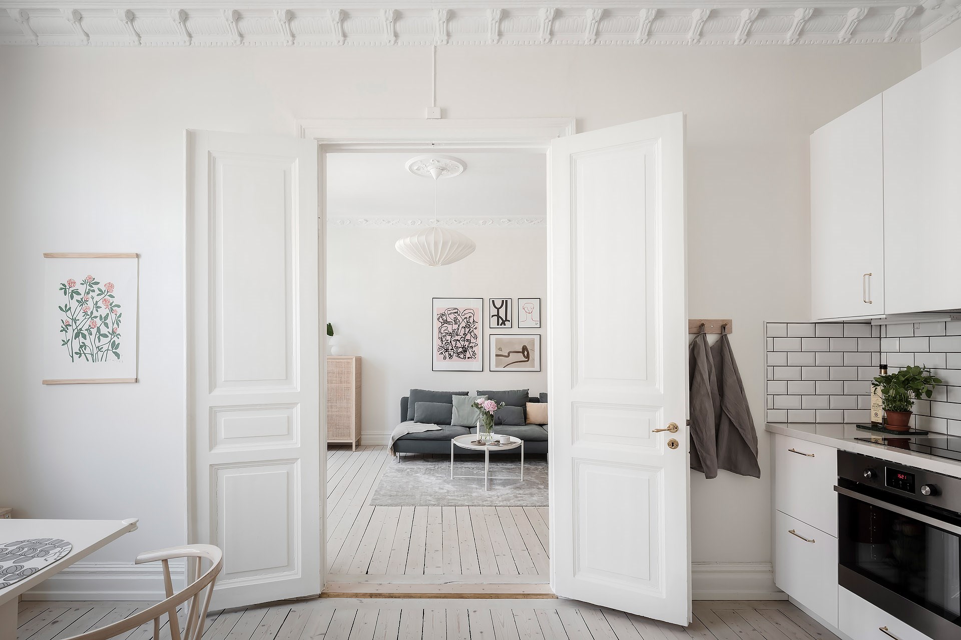 화이트 컬러로 깨끗하게 마감된 실내에 표백된 우드 플로어를 시공해 차분하고 깔끔한 분위기를 연출하고 있는 공동생활공간의 경우 거실과 주방 겸 식당 사이에 대형 여닫이문을 설치해 상황에 따라 유연한 공간 사용이 가능하도록 했다.