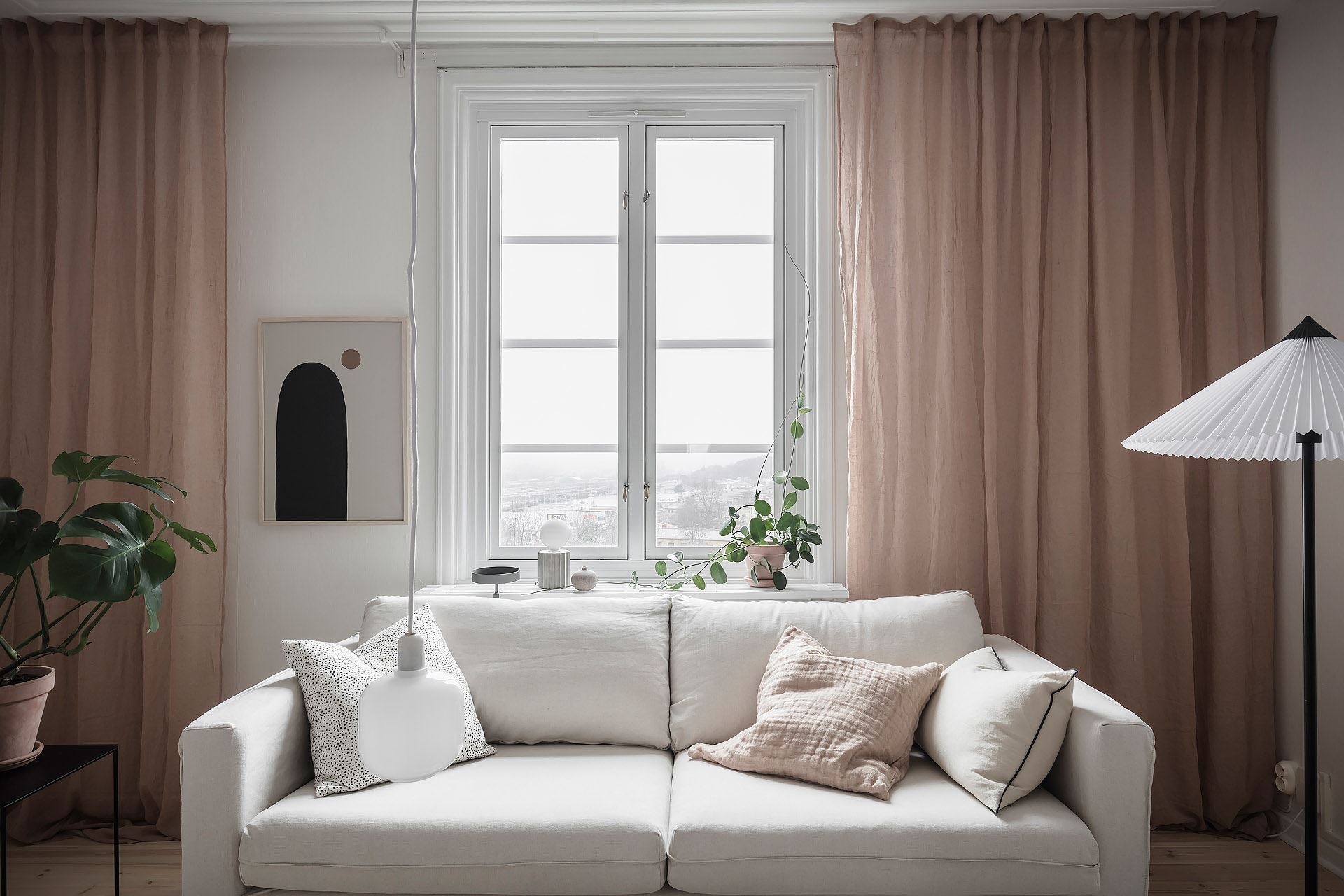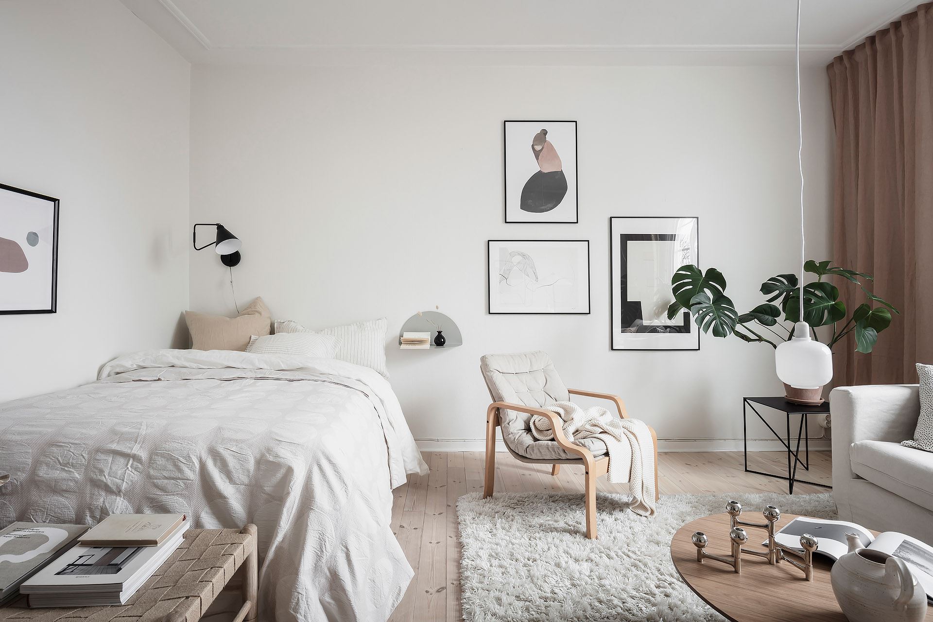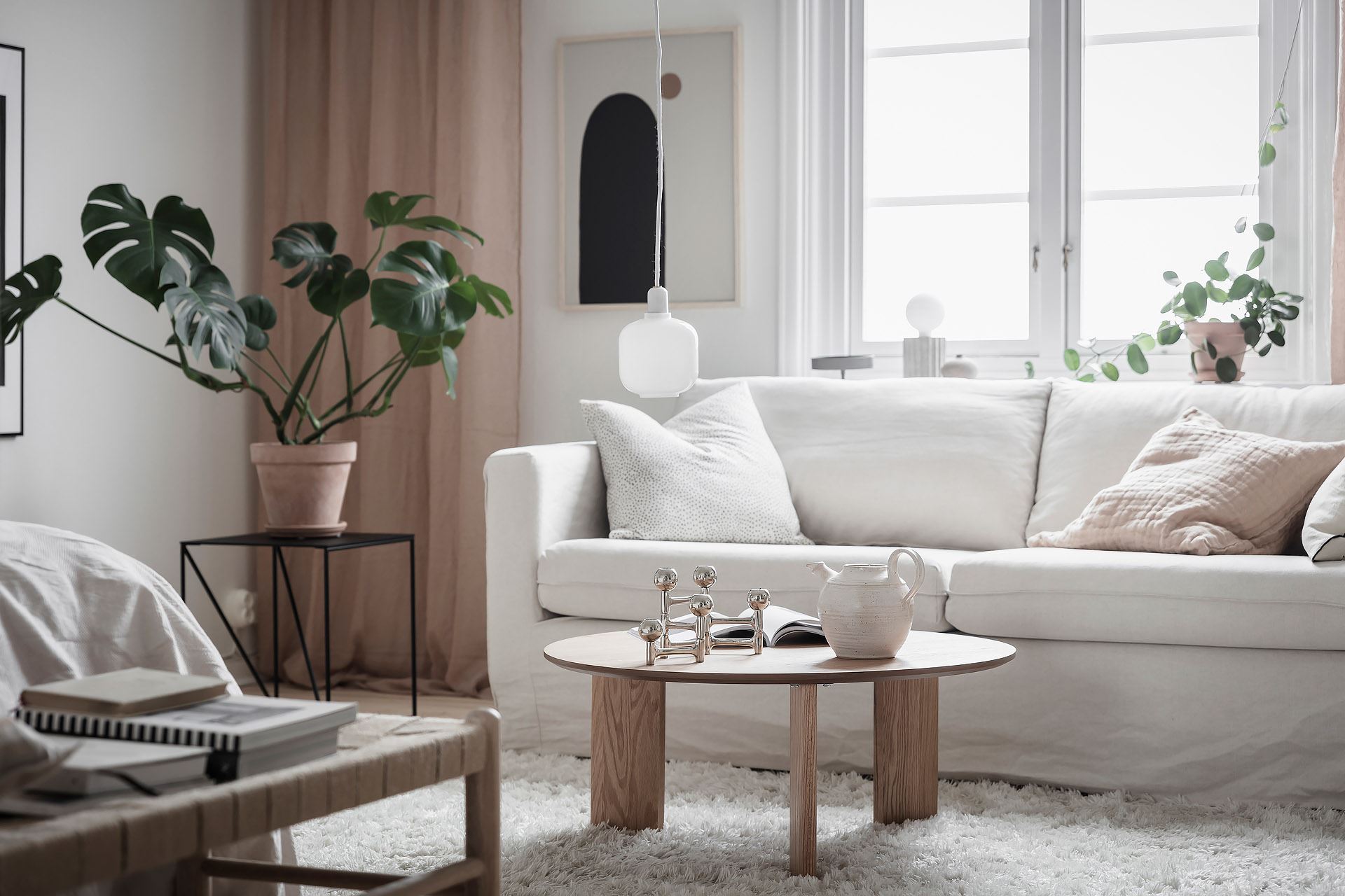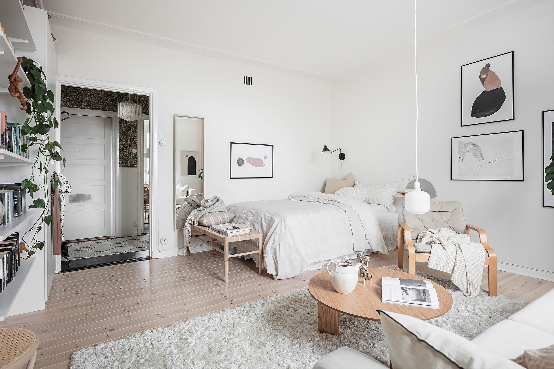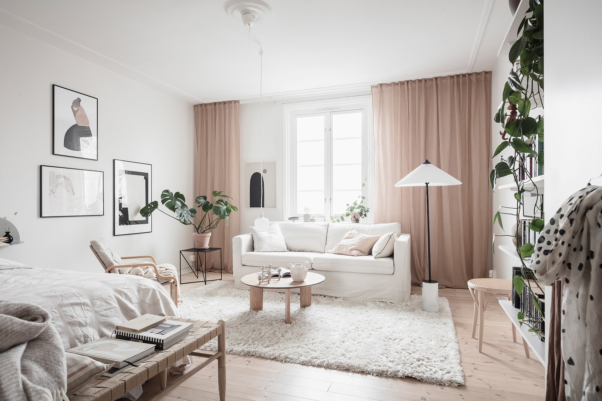 소파, 라운지체어, 티 테이블, 사이드 테이블, 수납장, 선반장, 침대 등이 깔끔하고 단정하게 배치된 메인 공간에는 러그, 액자, 조명, 오브제, 거울, 화초 등으로 아기자기한 포인트를 줘 아름답고 매력적인 공간을 완성하고 있다.