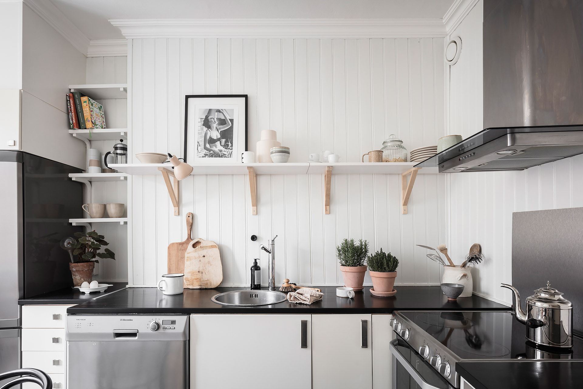 상부장을 과감하게 생략하고 심플한 디자인의 하부장과 선반, 빌트인장, 각종 주방 가전을 깔끔하게 설치한 주방은 소형 공간을 효율적으로 활용한 실용적인 모던 키친을 잘 보여주고 있다.