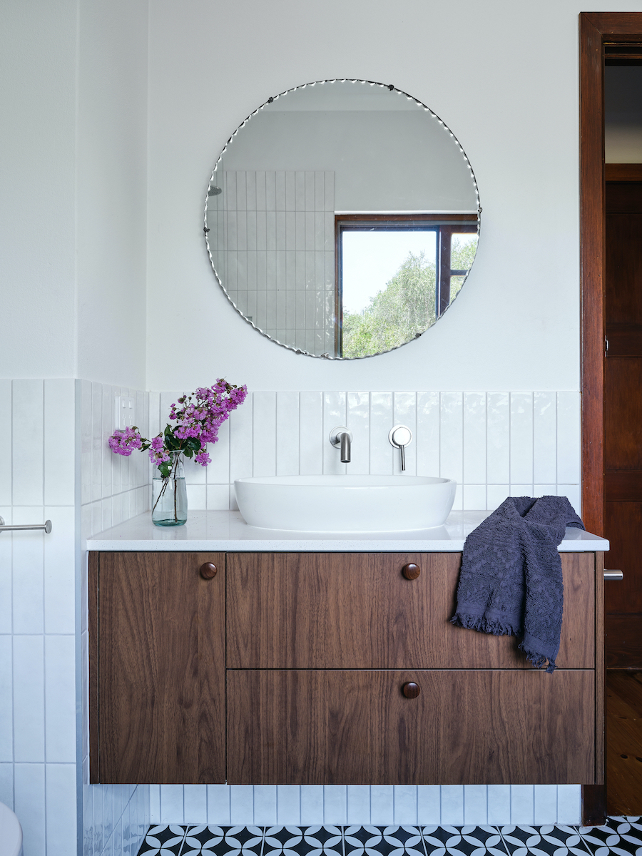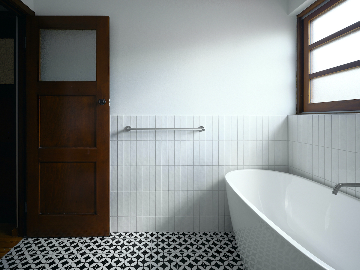 화이트 타일과 패턴 타일로 견고하게 마감된 욕실은 전체 공간과 통일성을 유지하는 빈티지 스타일로 디자인된 쾌적하고 현대적인 욕실 인테리어를 잘 보여주고 있다.