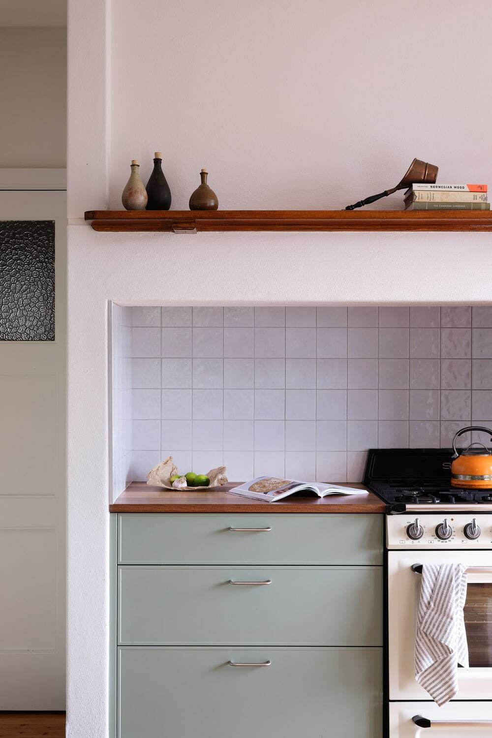 화이트 타일로 백 스플래쉬를 깔끔하게 마감한 후, 소프트 그린과 원목의 매력적인 조합이 돋보이는 싱크대 세트와 주방 가전들을 공간에 맞춰 깔끔하게 설치한 주방은 멋스러운 빈티지 키친 인테리어로 눈길을 끈다.