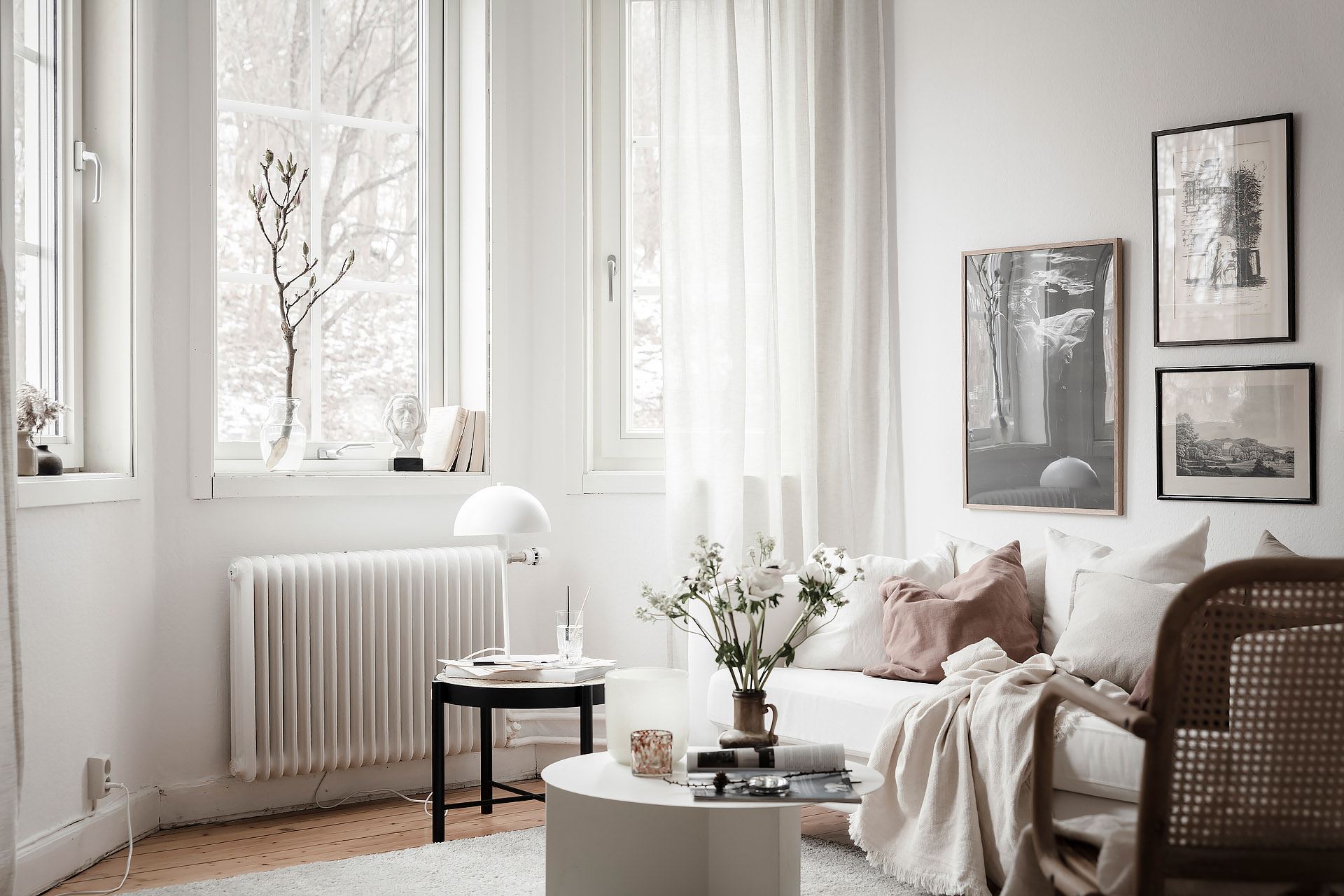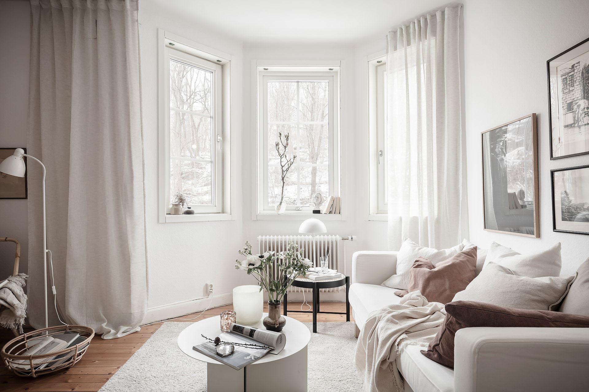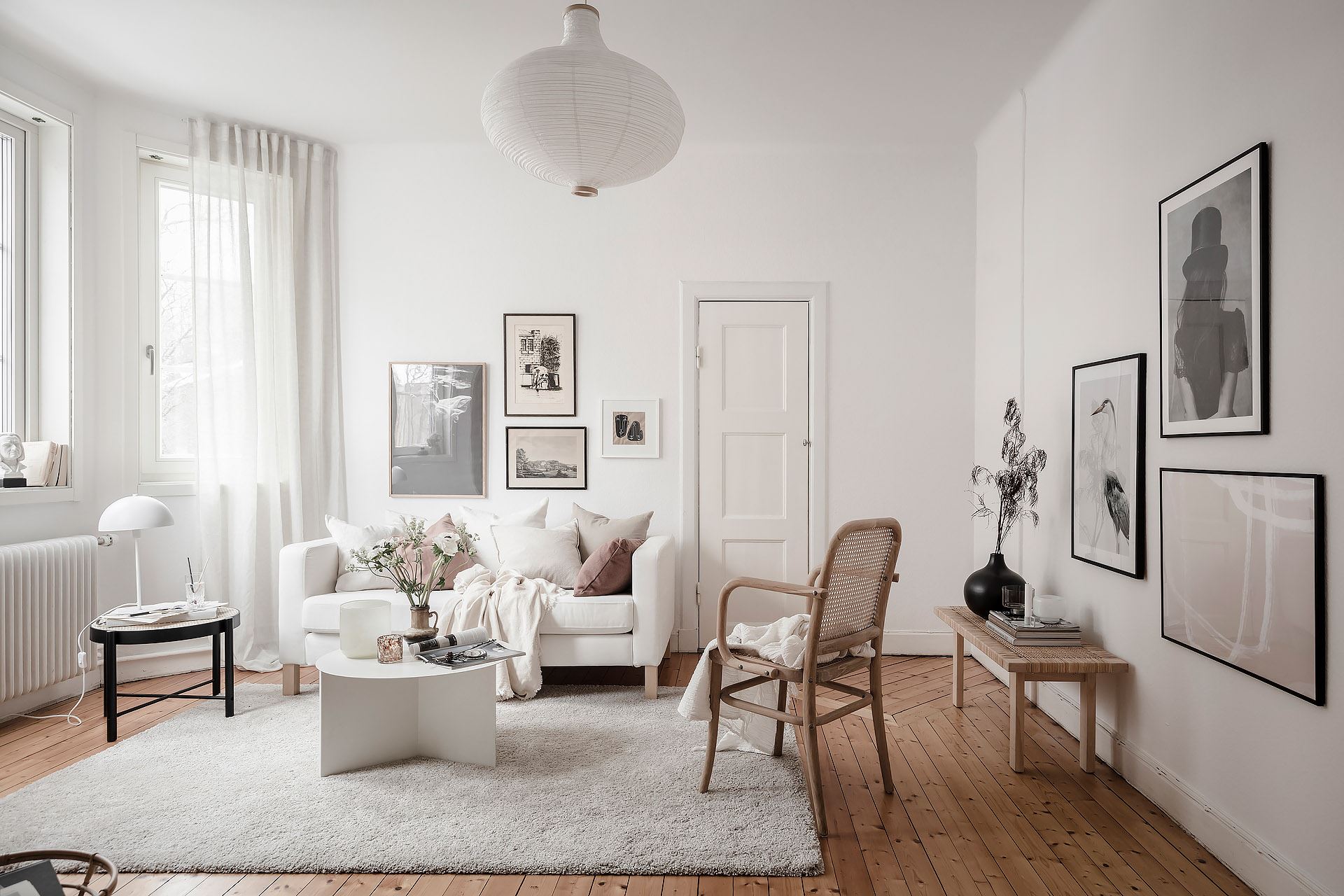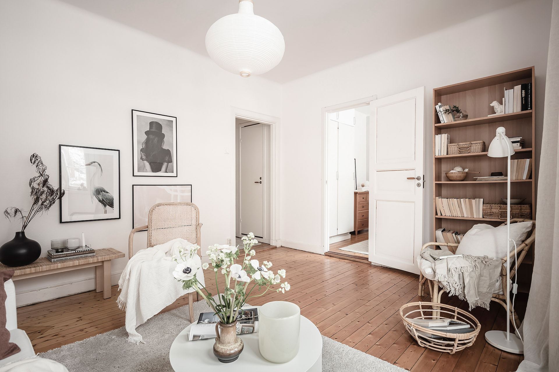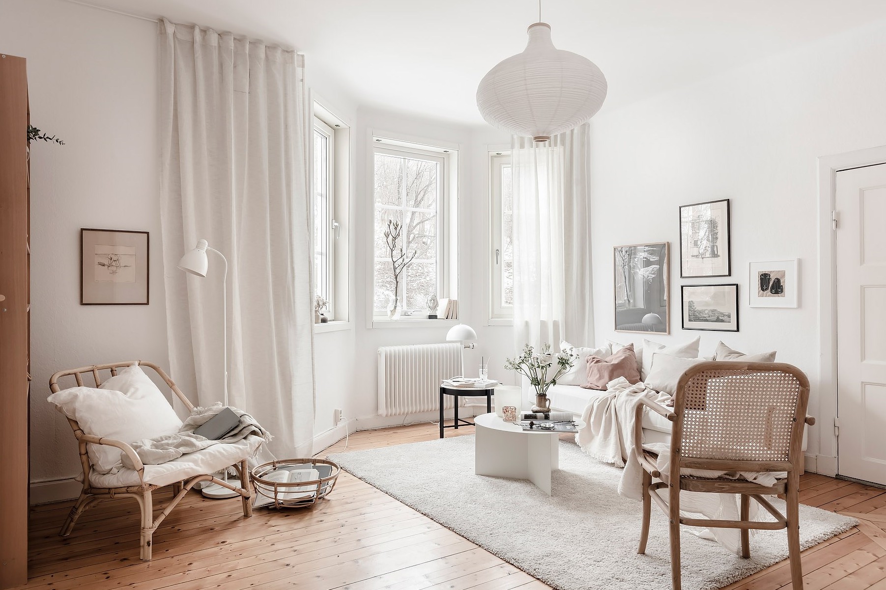 패브릭 소파, 티 테이블, 라탄 라운드체어, 책장, 사이드 테이블을 단정하게 배치한 후, 러그, 커튼, 조명, 액자, 오브제 등으로 공간의 디테일을 더한 거실은 평수와 관계없이 다양한 거실 공간에 활용해 볼 수 있는 아름다운 북유럽풍 내추럴 거실 인테리어를 잘 보여주고 있다.