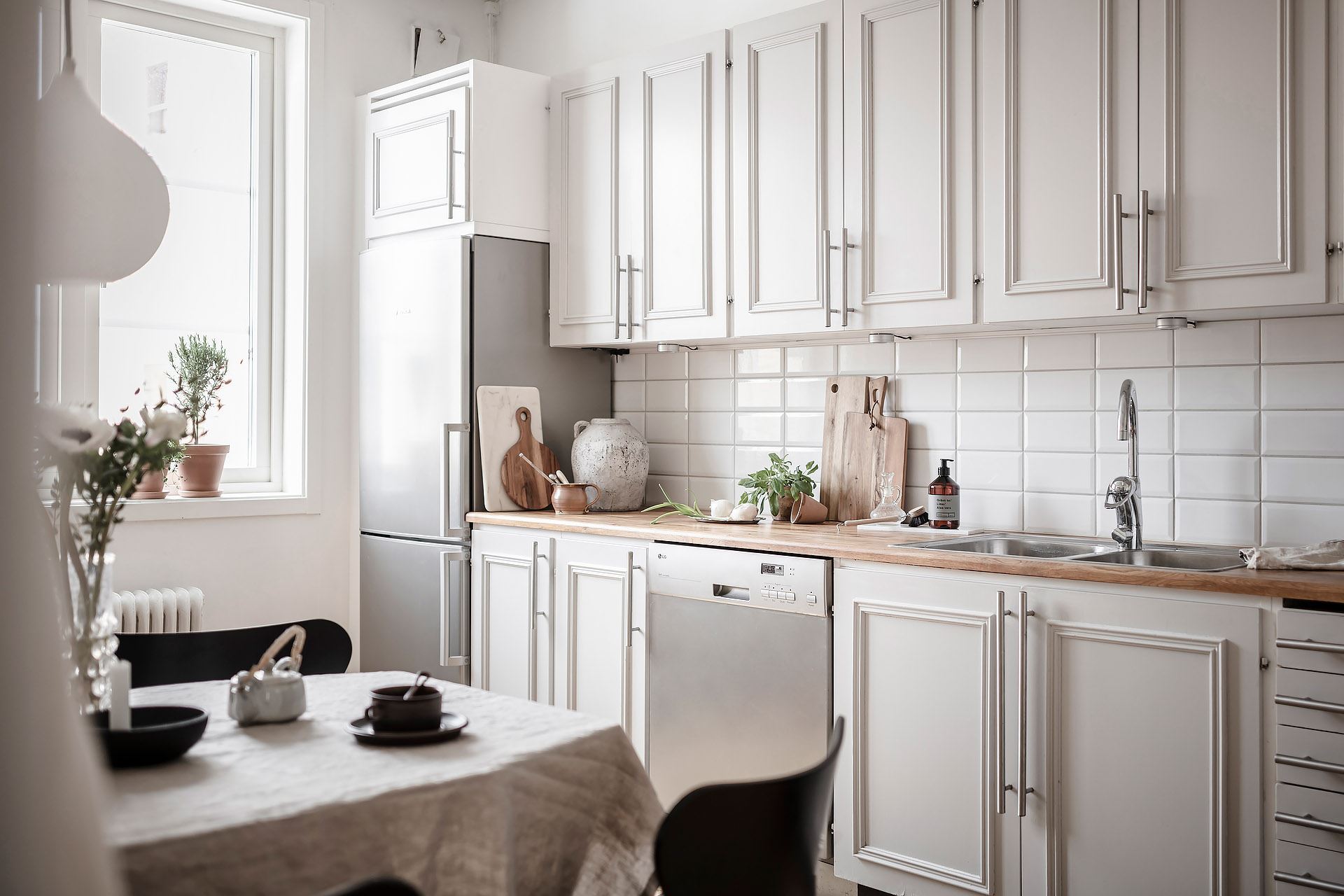 화이트 타일로 백스플래쉬를 깔끔하게 마감한 주방에는 웨인스코팅으로 포인트를 준 화이트 싱크대와 각종 주방 가전을 효율적으로 배치해 공간에 꼭 맞는 멋스럽고 실용적인 주방 공간을 선보이고 있다.