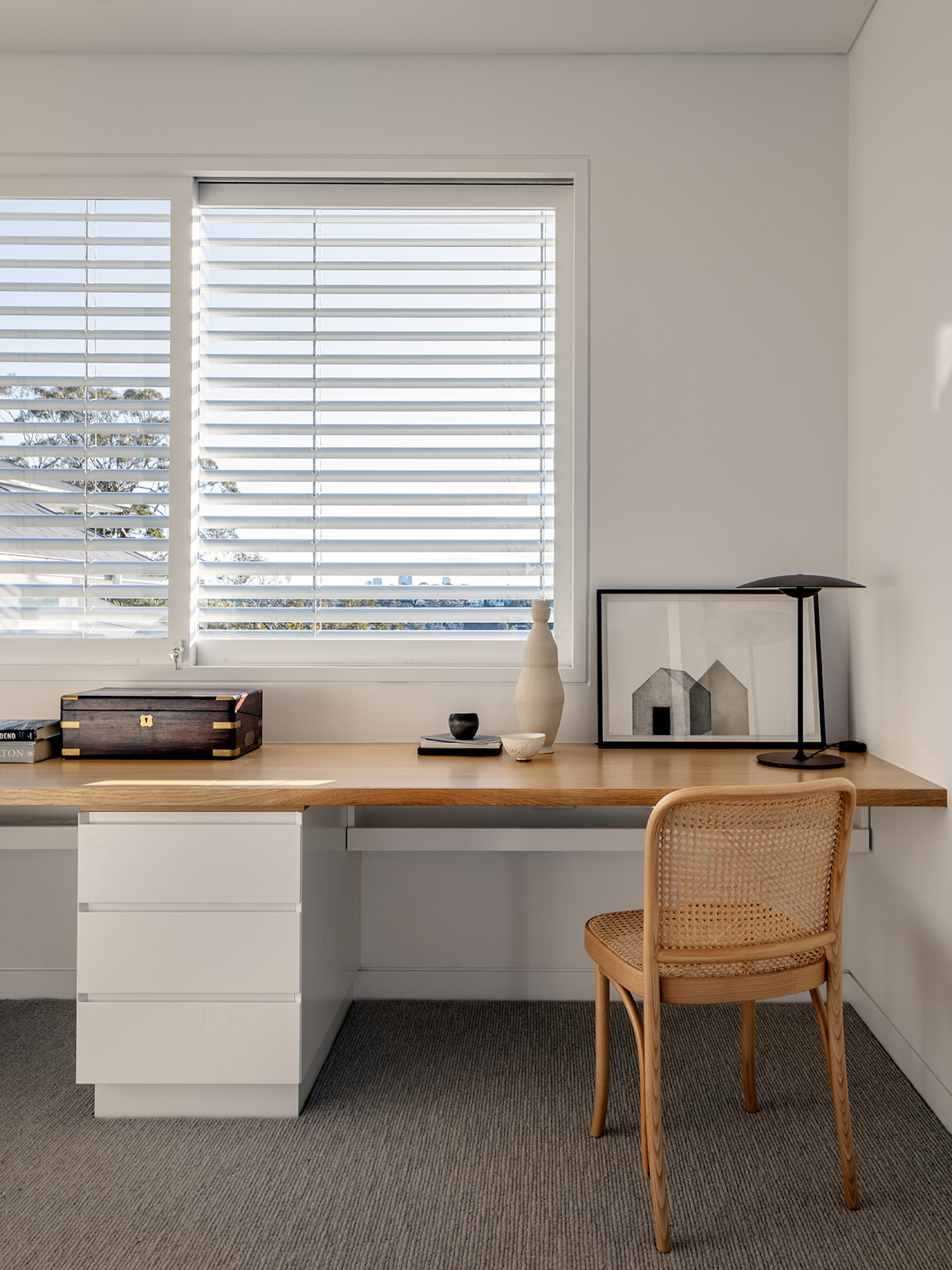 원목으로 견고하게 제작된 대형 책상과 넉넉한 수납공간을 내장하고 있는 수납장이 효율적으로 배치된 서재 겸 홈 오피스는 업무, 작업, 학습에 집중할 수 있도록 깔끔하게 디자인되었다.
