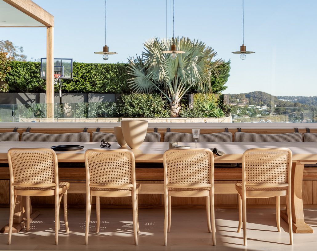 대형 창문을 배경으로 원목 다이닝 테이블과 원목 벤치, 라탄 다이닝 체어가 함께 놓인 이국적인 분위기의 식당은 식사와 티타임, 응접 등 다양한 용도로 사용될 수 있는 여유로운 홈 카페 겸 레스토랑으로 디자인되어 ‘비치 하우스’의 매력을 공간으로 느낄 수 있도록 했다.