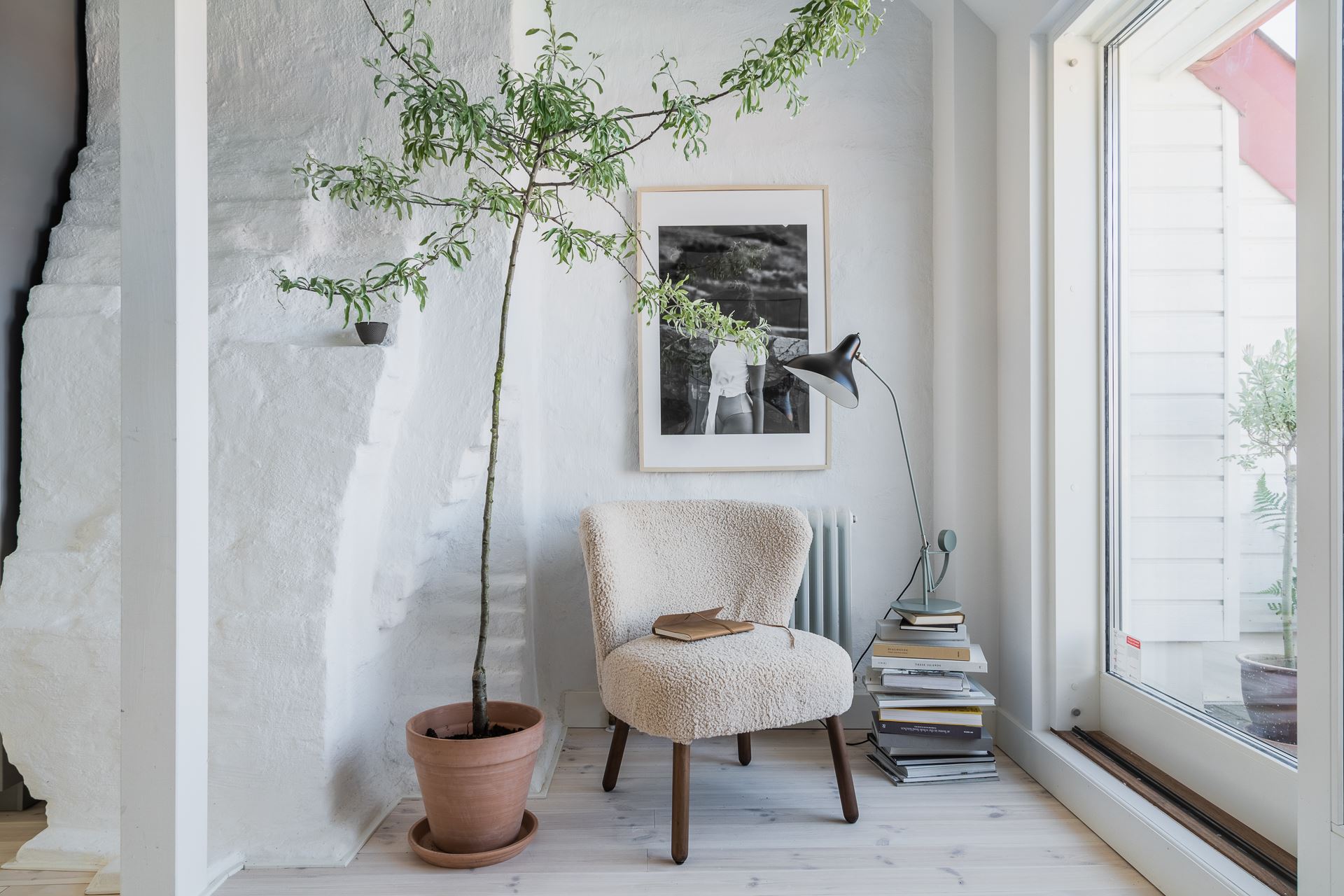 편안한 휴식과 여유로운 사색을 즐길 수 있도록 디자인된 창가 공간은 가구와 소품을 감각적으로 활용한 따뜻하고 멋스러운 북유럽 홈 스타일링의 모범적인 예시를 잘 보여주고 있다.