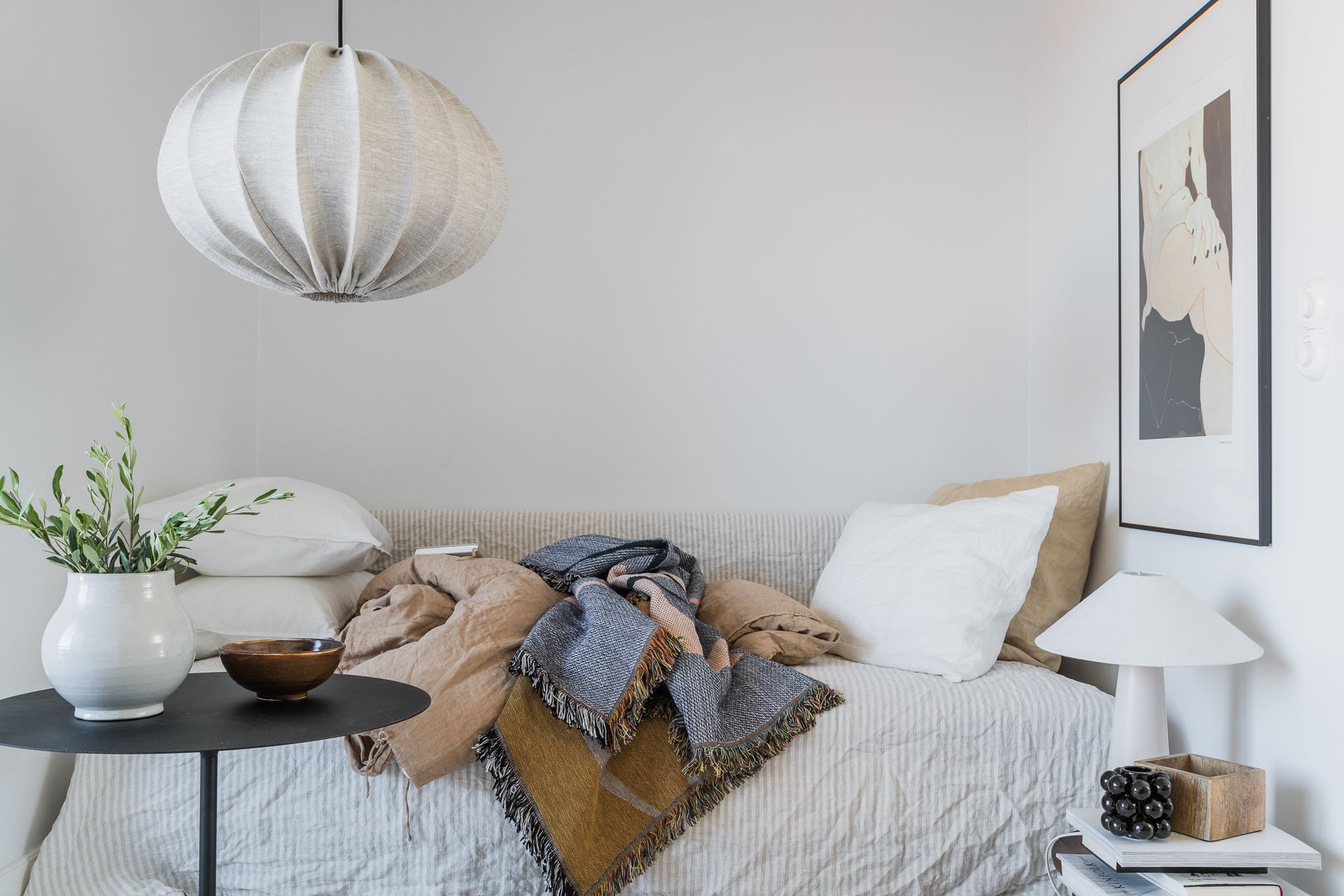 소파와 침대를 겸하고 있는 편안한 미니 베드가 놓인 작은 침실 공간에는 티 테이블, 조명, 오브제, 액자 등으로 감각적인 포인트를 줘 소형 주거공간에 적용해 볼 수 있는 매력적인 홈스타일링을 잘 보여주고 있다.