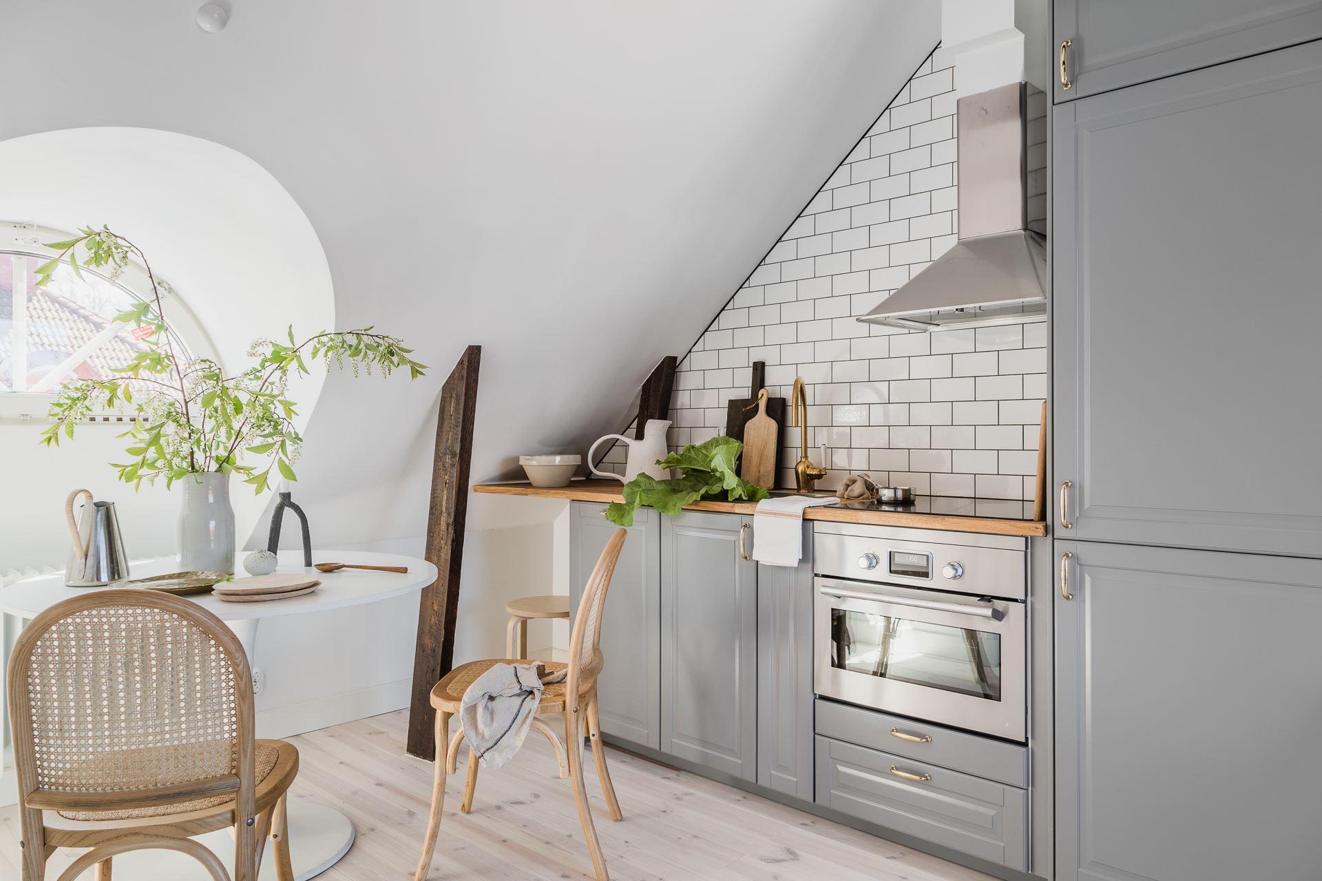 비스듬한 다락 공간을 효율적으로 활용해 만든 미니 주방의 경우 화이트 타일로 백스플래쉬를 마감한 후, 튼튼한 원목 상판이 놓인 그레이 빌트인 싱크대를 공간에 꼭 맞게 설치해 작지만 알찬 주방 인테리어를 선보이고 있다.