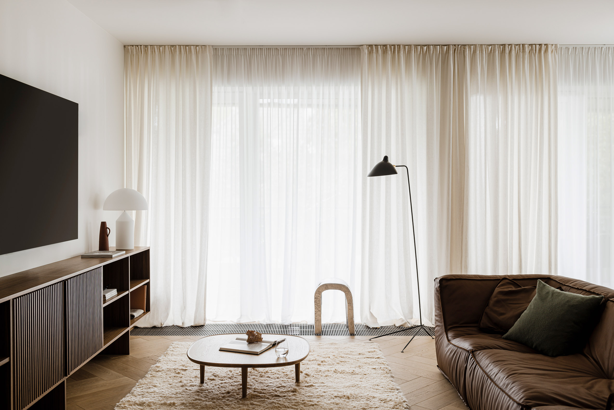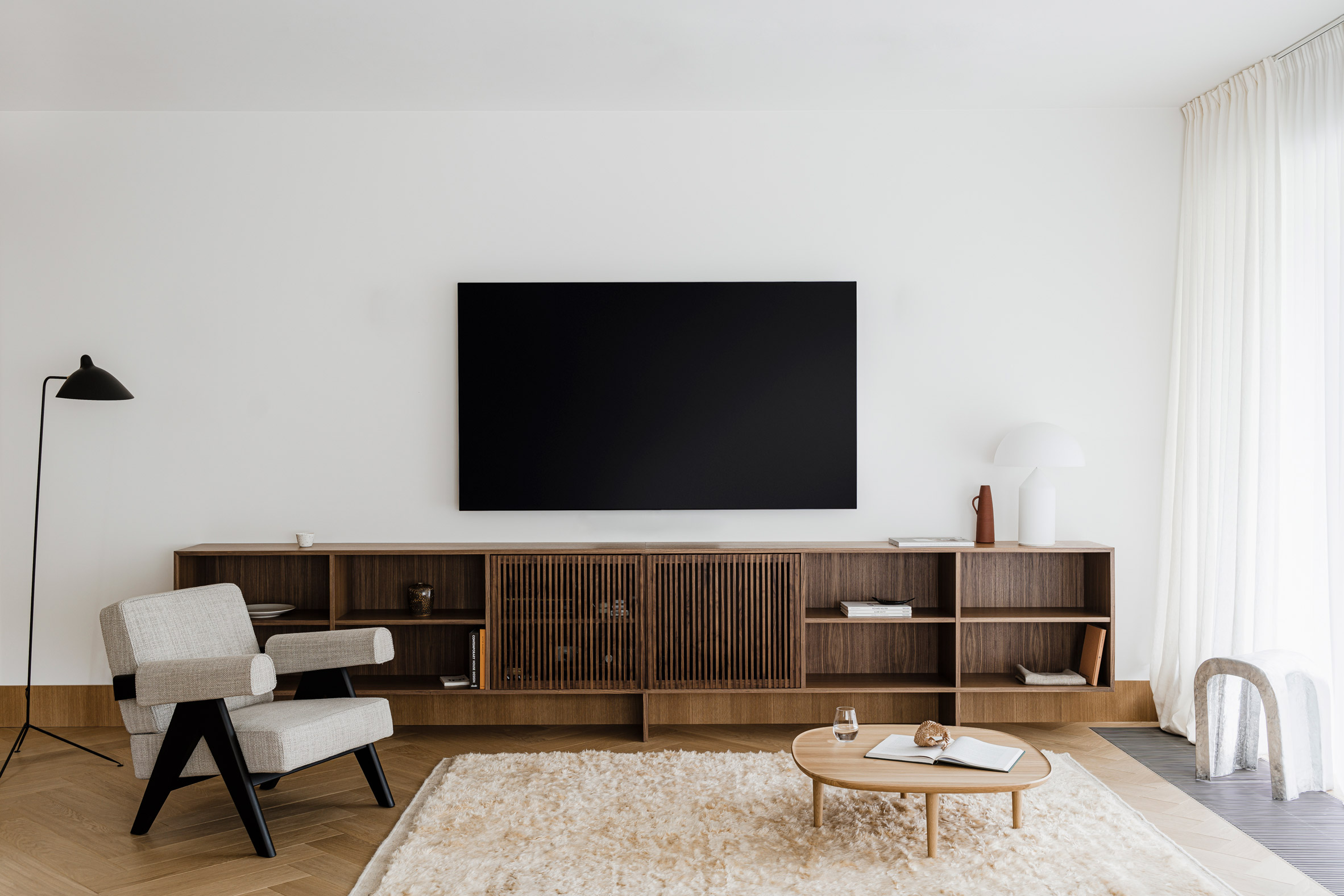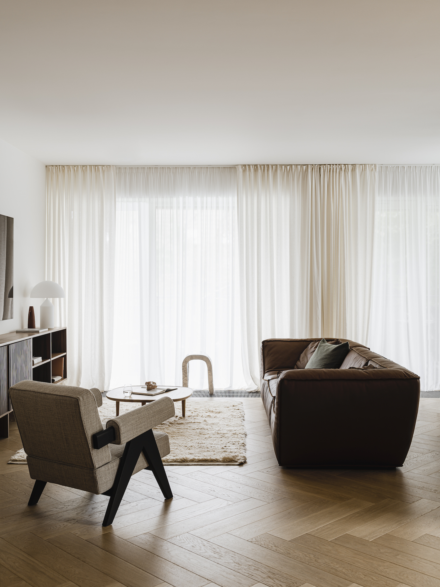 ‘피에르 잔느레: Pierre Jeanneret’의 암체어를 비롯한 유명 디자이너의 가구와 조명들로 ‘미드 센추리 모던’ 스타일을 섬세하게 구현한 거실은 부부가 편안한 휴식을 즐길 수 있는 멋스럽고 아늑한 거실 인테리어를 잘 보여주고 있다.