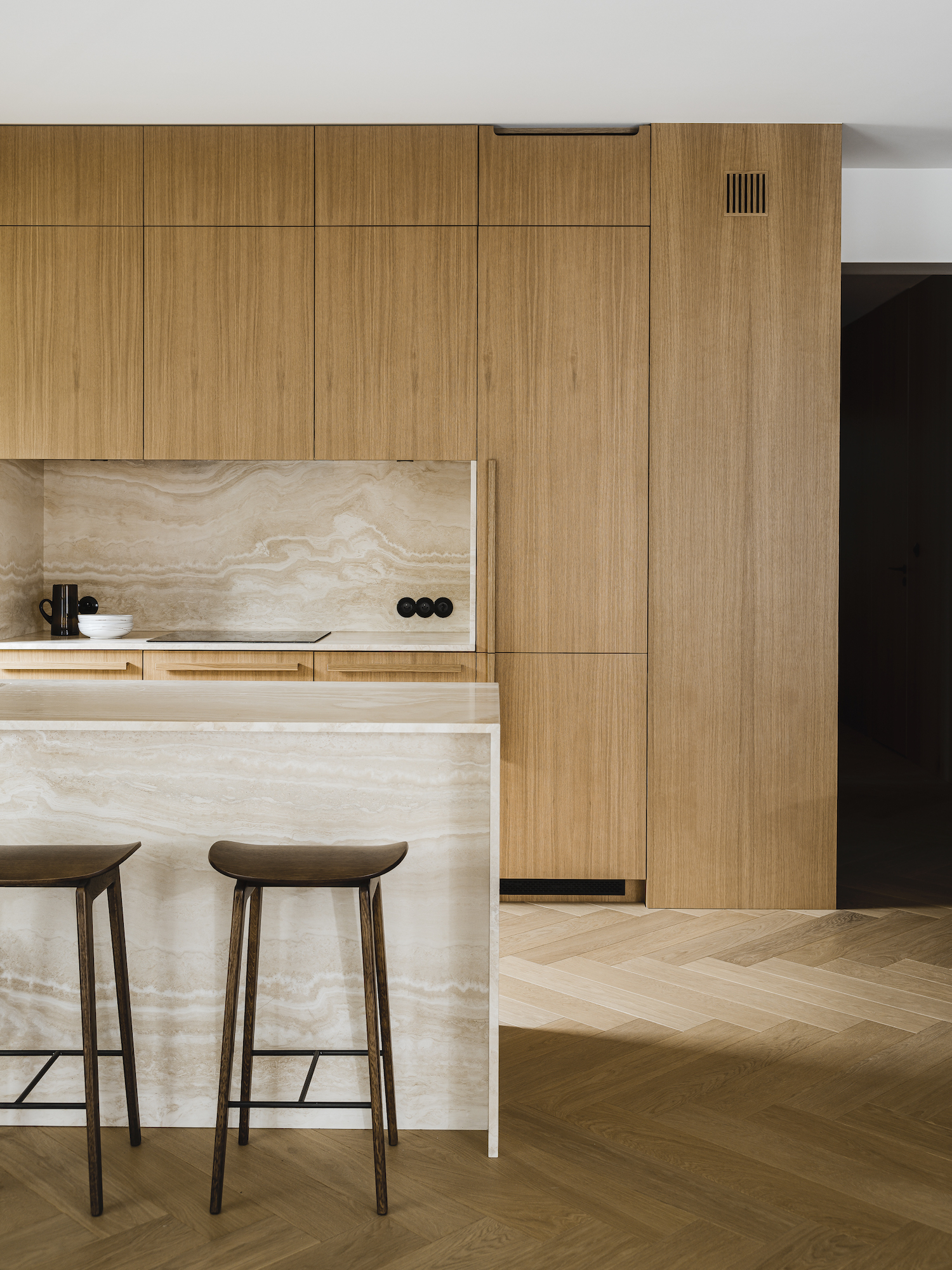 원목과 대리석으로 견고하게 제작된 빌트인 싱크대 세트가 깔끔하게 자리하고 있는 대면형 주방은 고급스러운 디자인은 물론 효율적인 동선과 실용적인 구성이 돋보이는 품격 있는 주방 인테리어가 공간의 아름다움을 더하고 있다.