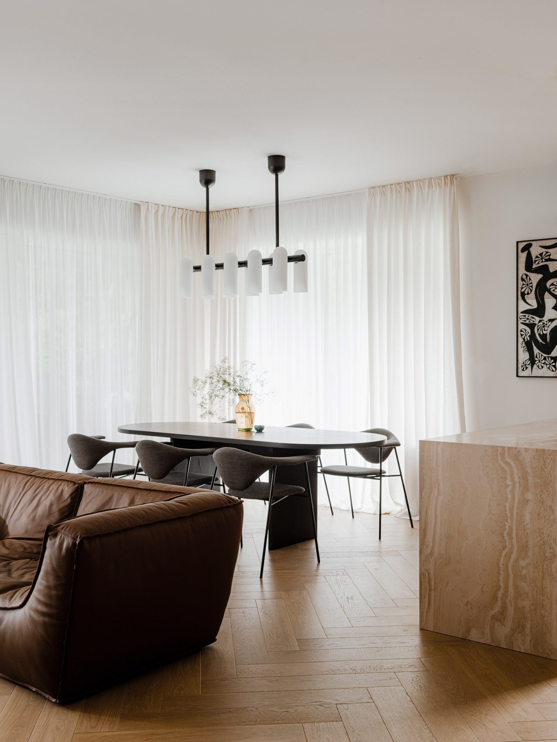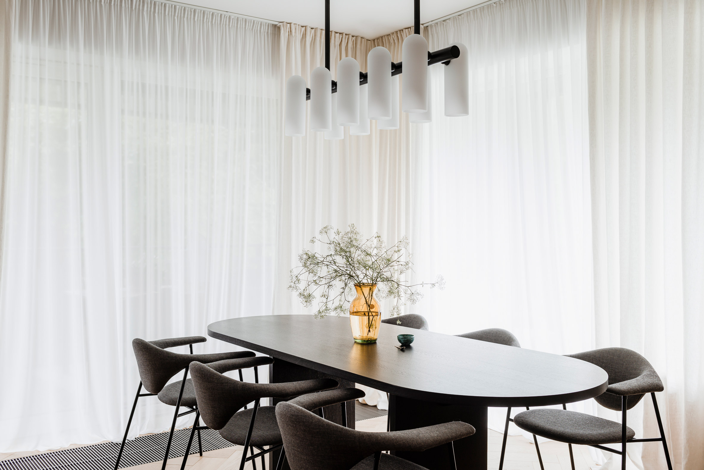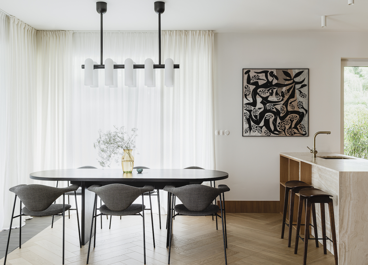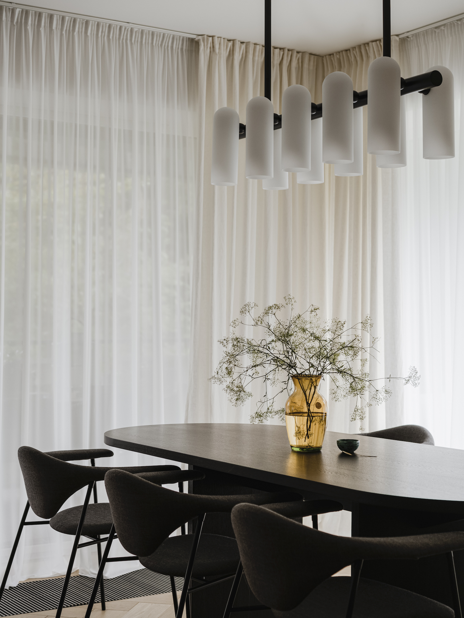 블랙 다이닝 테이블과 ‘구비: Gubi’의 마스쿨로 다이닝 체어가 놓인 오픈 다이닝 공간은 부부는 물론 가족, 친구, 지인들이 함께 식사와 티타임을 즐길 수 있는 우아한 홈 카페 겸 레스토랑으로 디자인되어 여유롭고 낭만적인 일상을 선사한다.