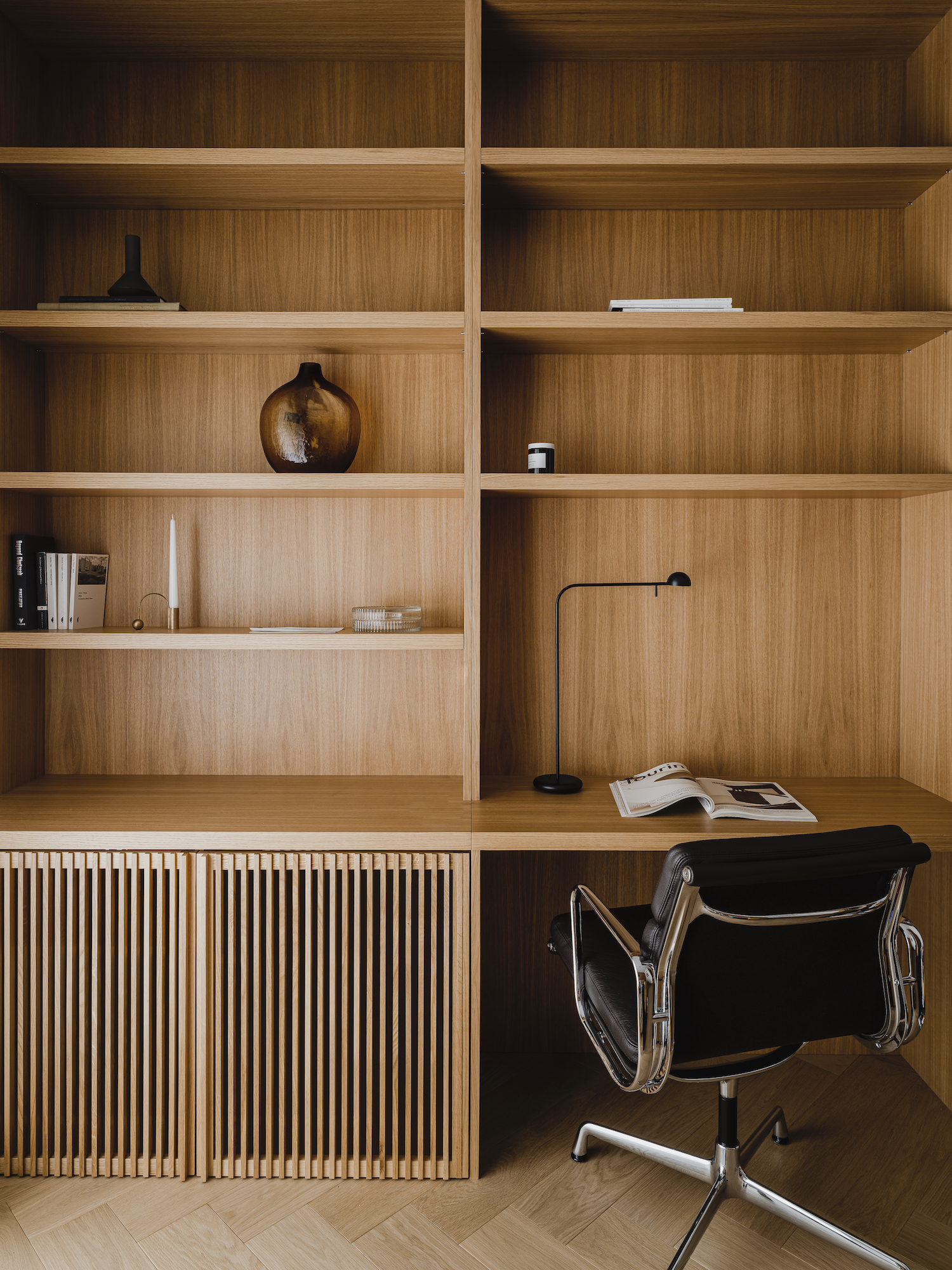 실용적인 디자인의 원목 책상 세트가 설치된 서재 겸 홈 오피스는 업무, 작업, 학습 등에 집중할 수 있는 조용한 독립 공간으로 디자인되었다.