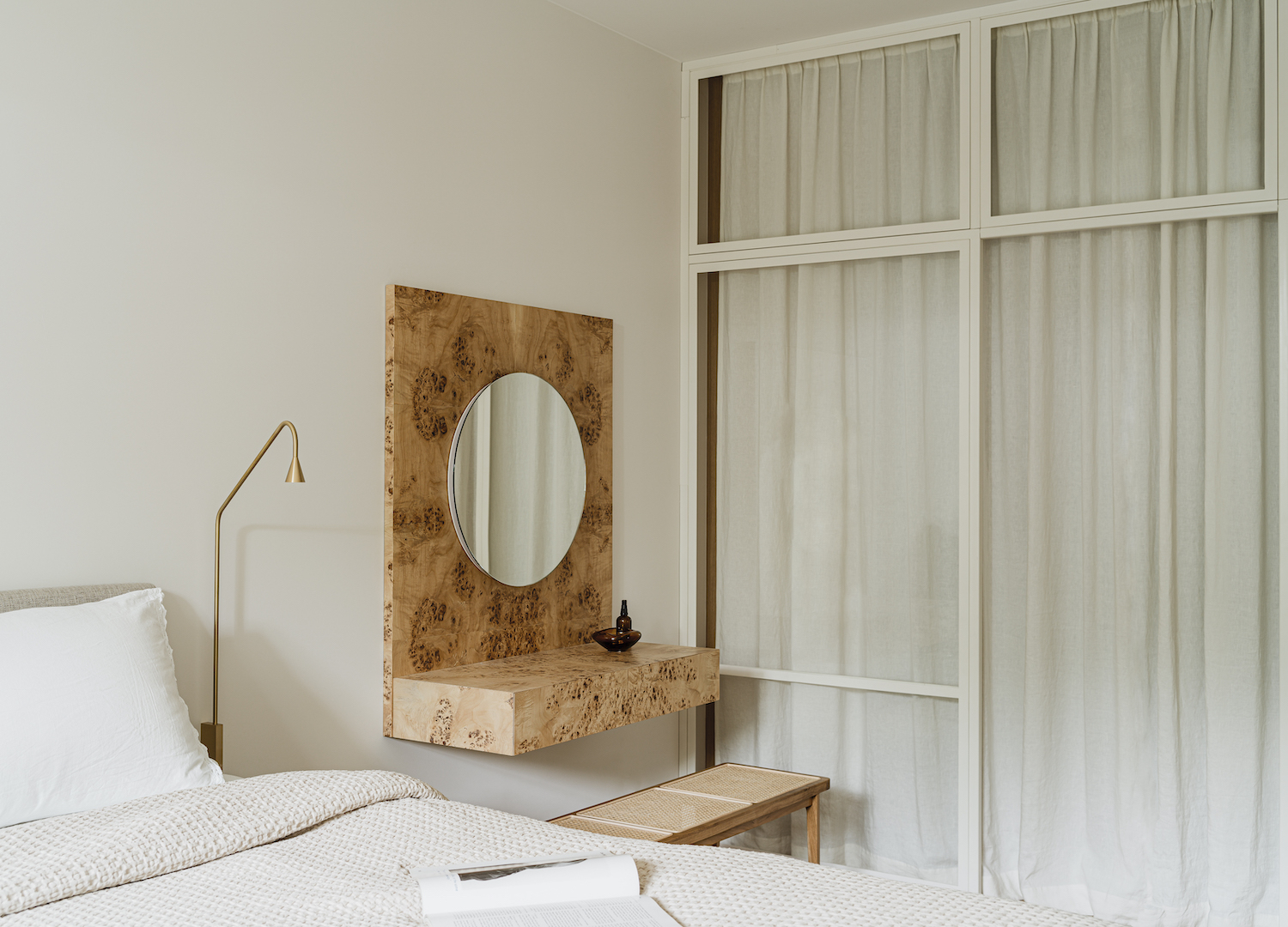 차분하고 우아하게 꾸며진 마스터 침실은 정갈하고 고급스러운 공간 구성이 돋보이는 부부만을 위한 매력적인 프라이빗 공간을 연출하고 있다.