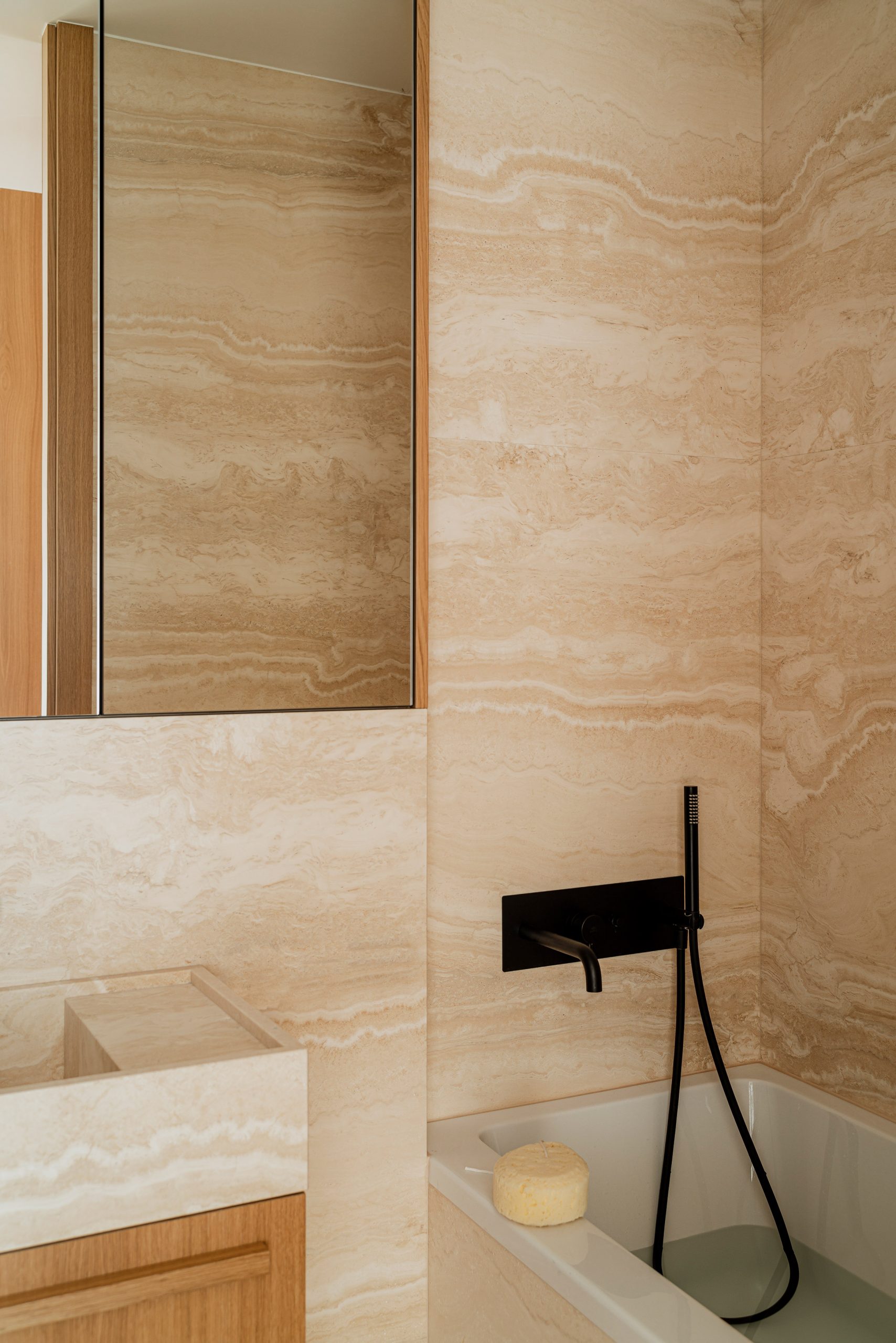 대리석으로 견고하게 마감된 건식 욕실은 럭셔리 호텔이 부럽지 않은 격조 높은 욕실 인테리어를 선보이고 있다.
