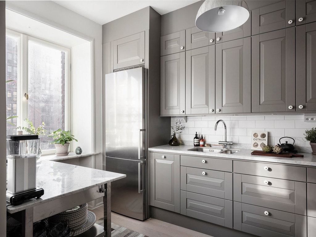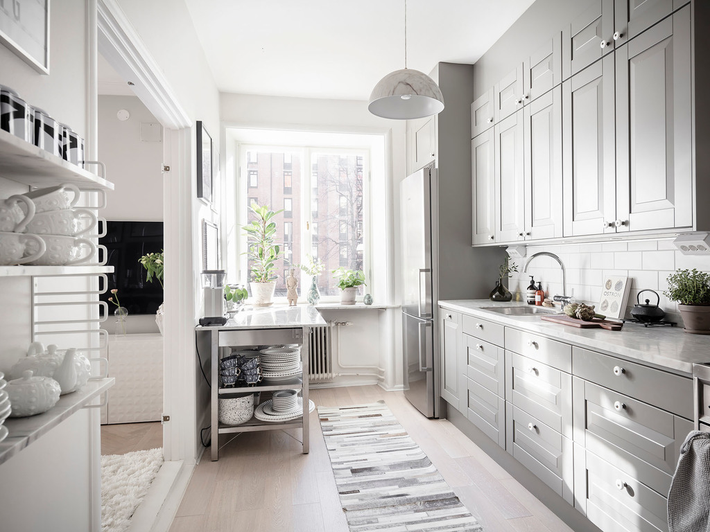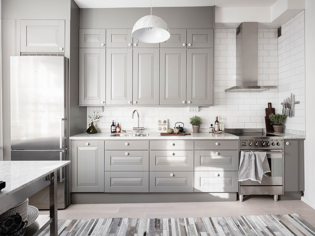 화이트 타일로 백스플래쉬를 마감해 사용과 관리에 편리를 더한 주방에는 대리석 카운터 탑이 놓인 고급스러운 그레이 싱크대와 주방 가전, 조리대, 선반장 등을 깔끔하게 설치해 세련되고 실용적인 모던 키친을 완성하고 있다.