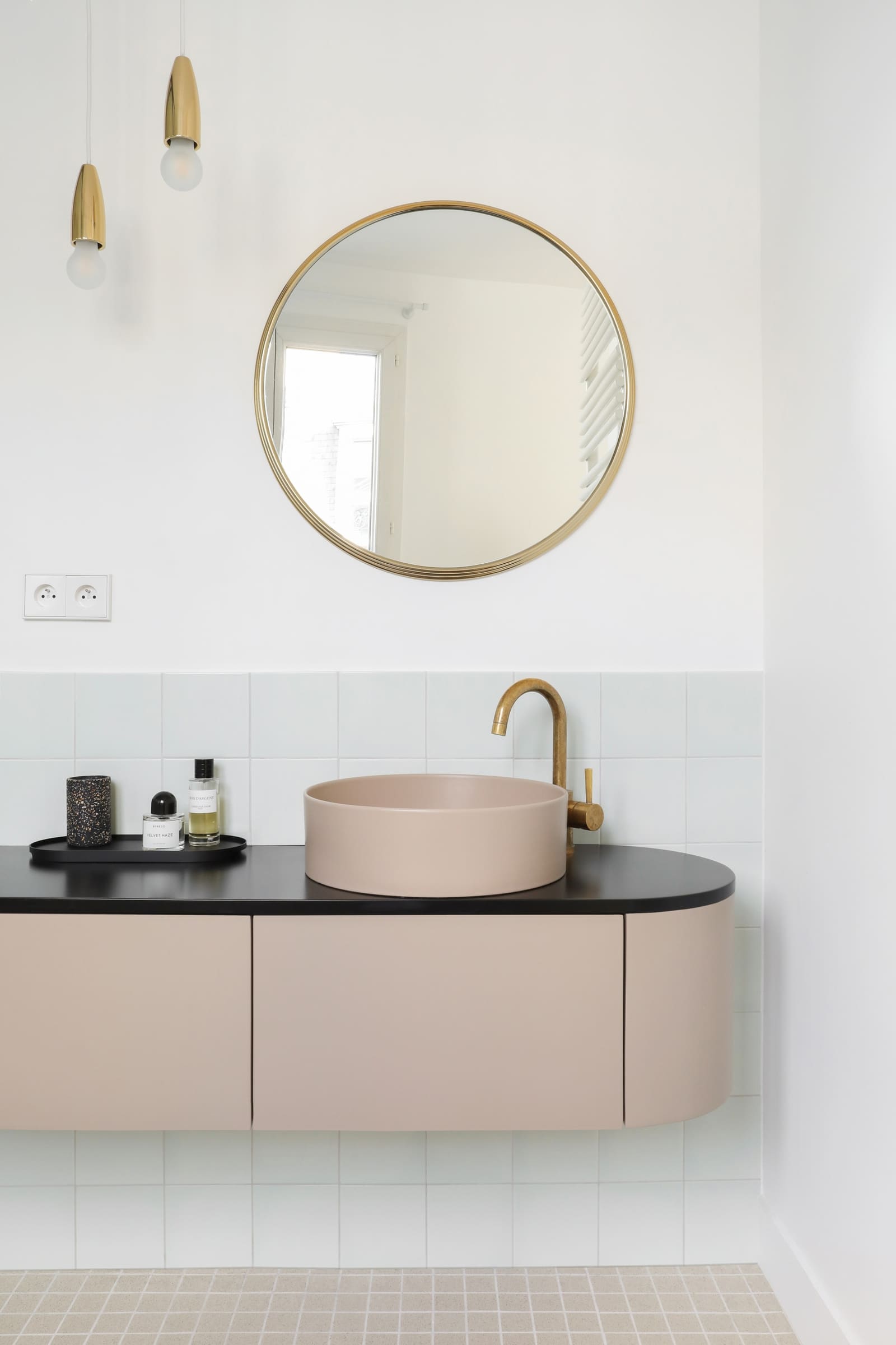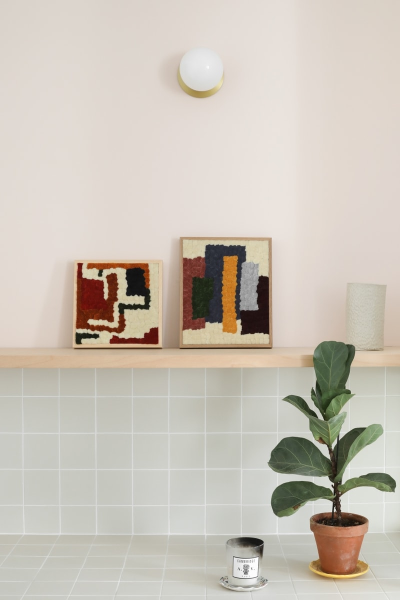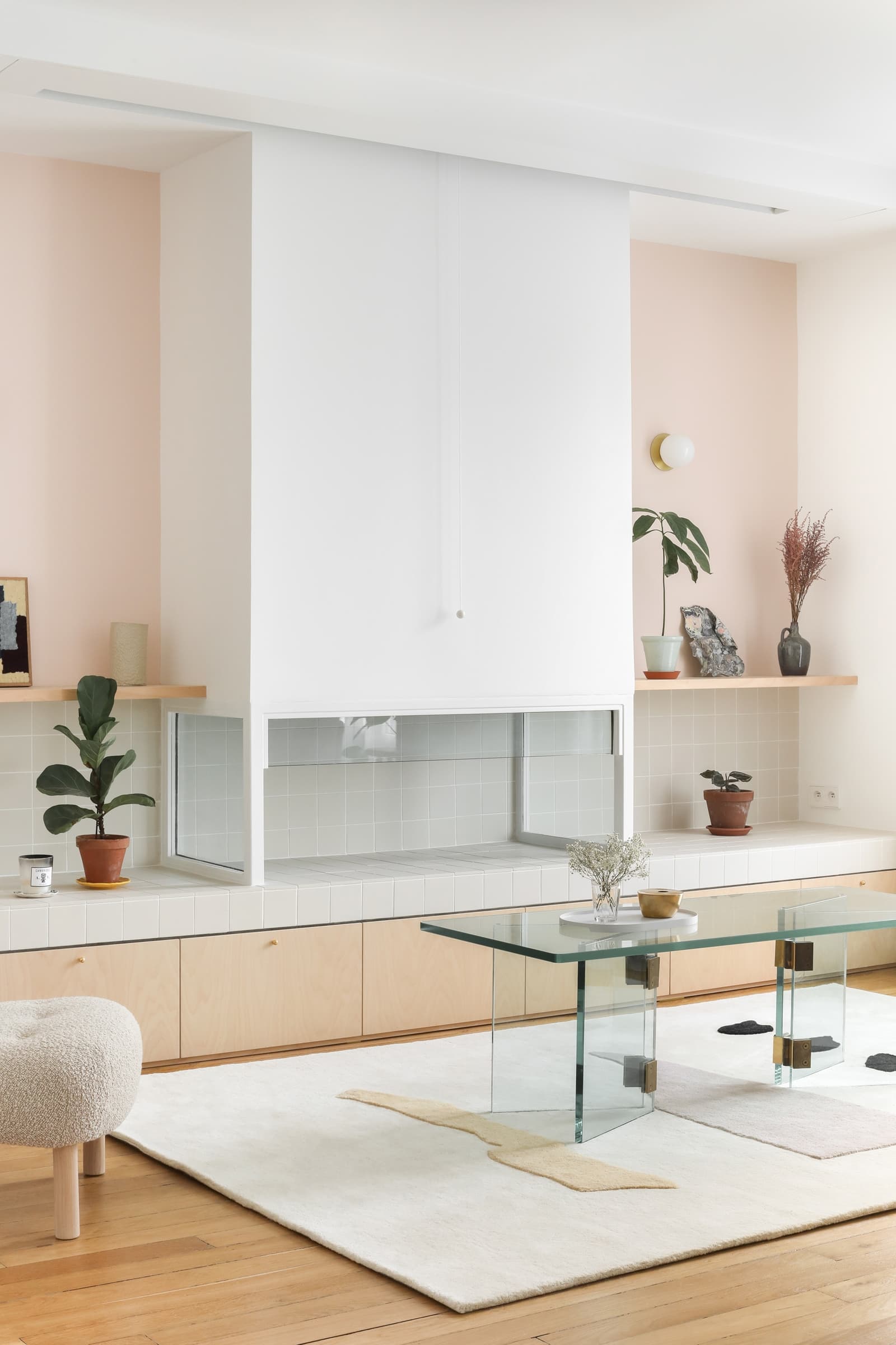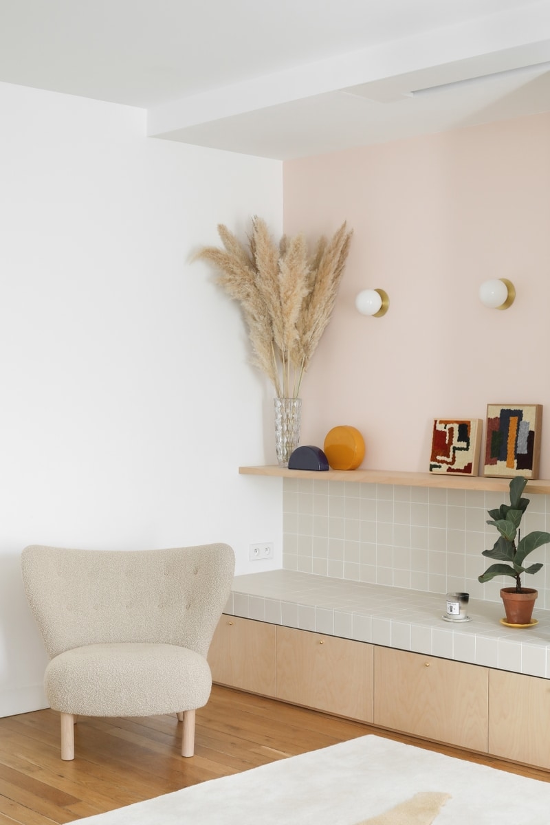베이비 핑크 컬러로 포인트를 준 벽면에 타일과 원목을 활용해 만든 벤치형 거실장과 선반을 공간에 꼭 맞춰 설치한 거실에는 집주인이 신중하게 선택한 디자이너 가구와 조명을 배치한 후, 아기자기한 오브제들로 예쁜 디테일을 더해 쇼룸이 부럽지 않은 스타일리시한 거실 공간을 완성하고 있다.