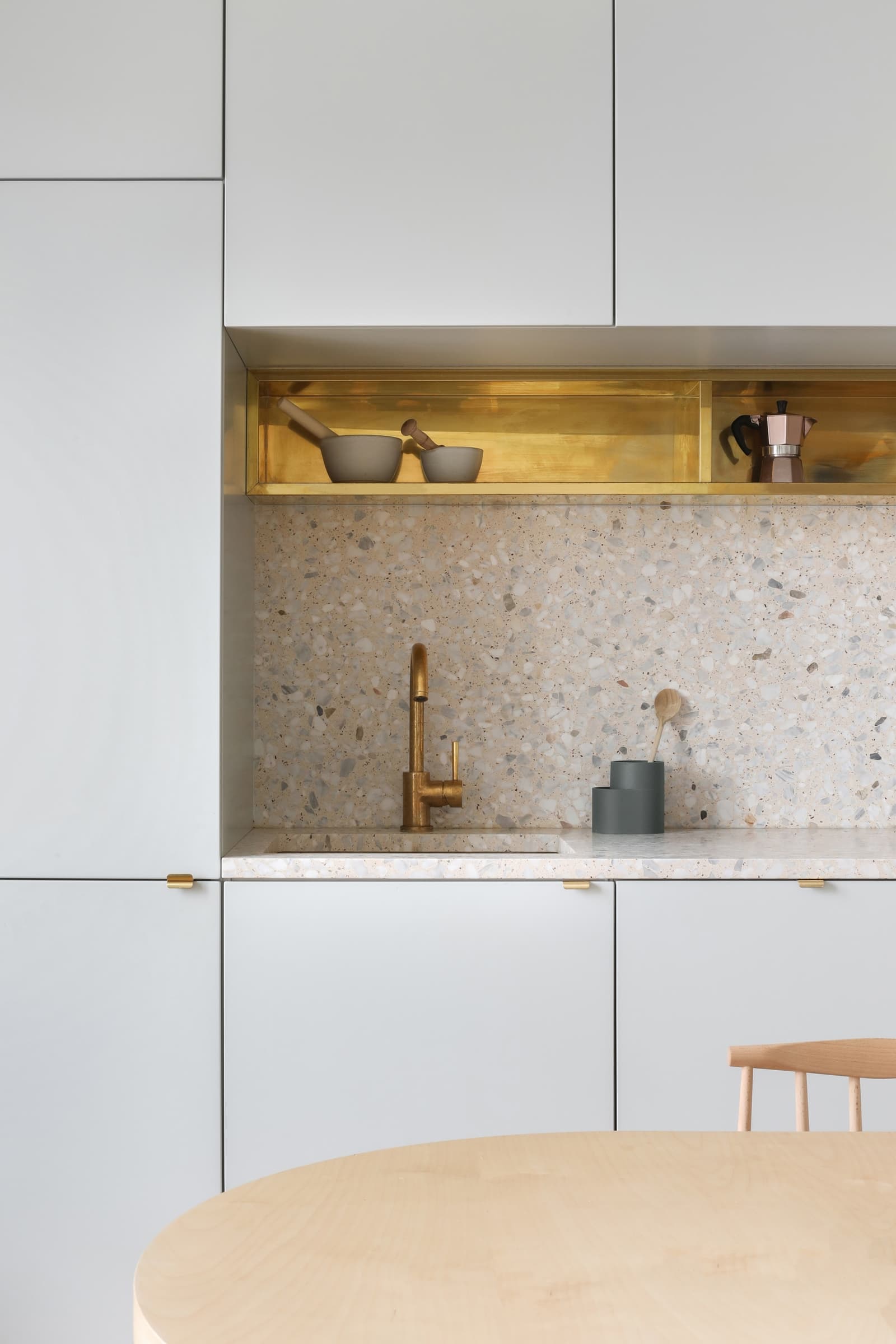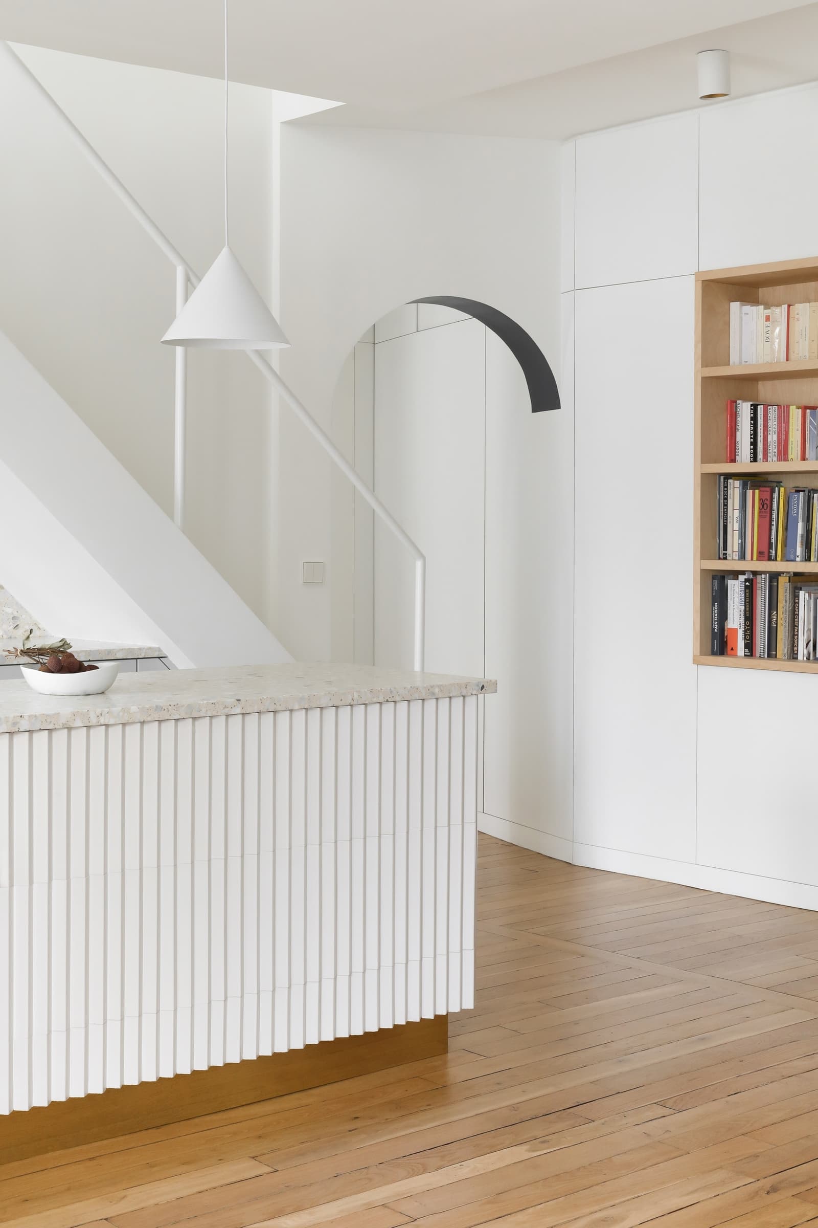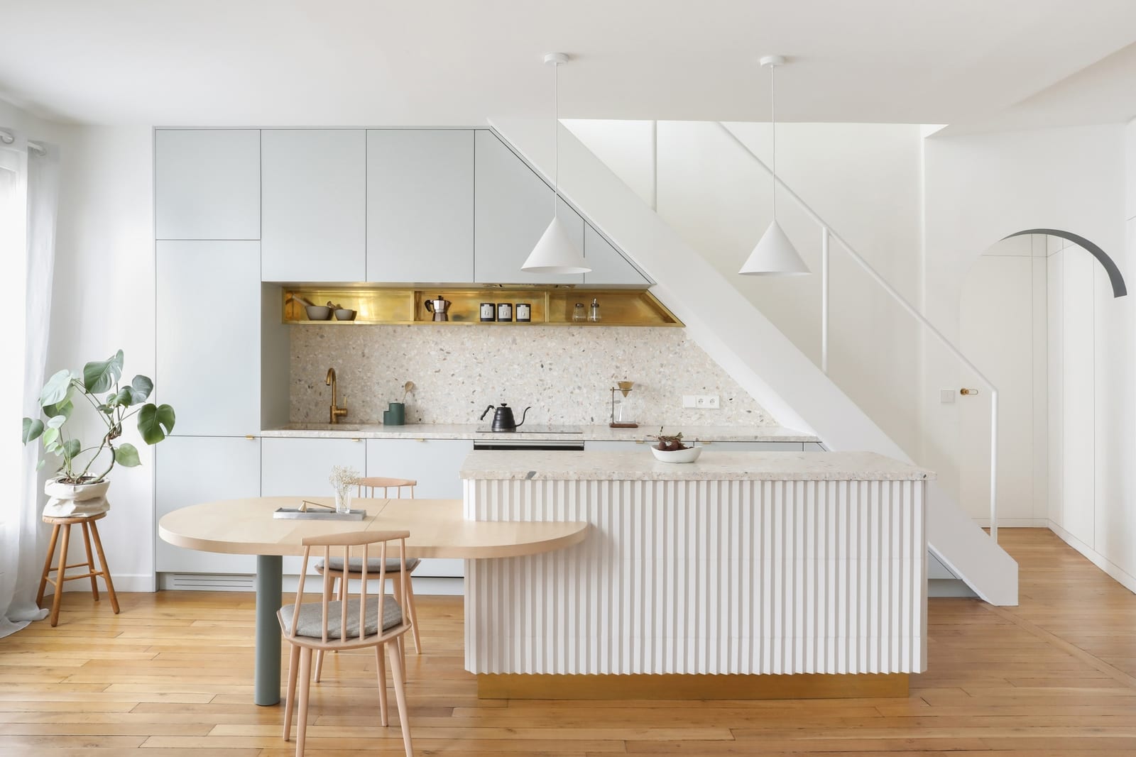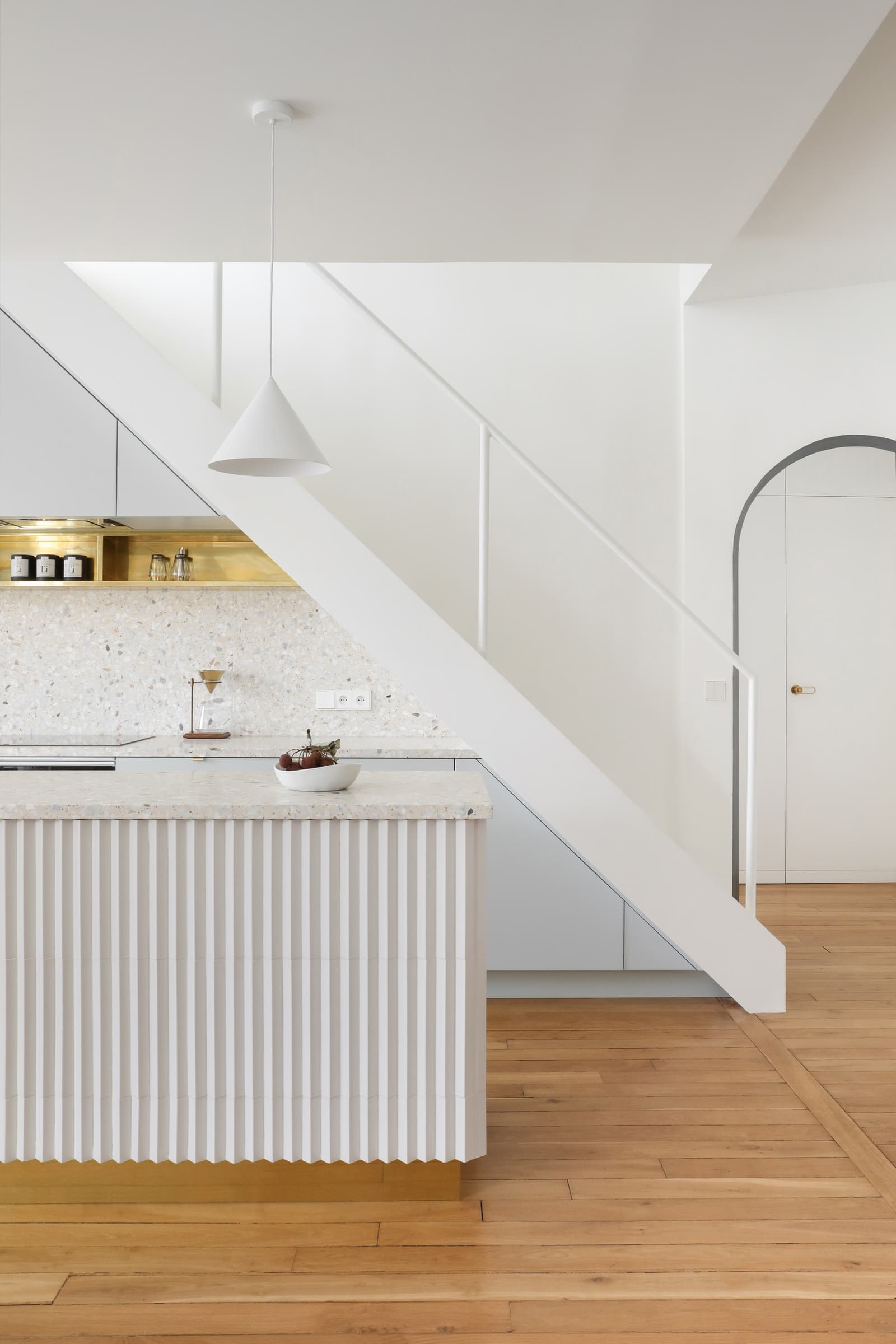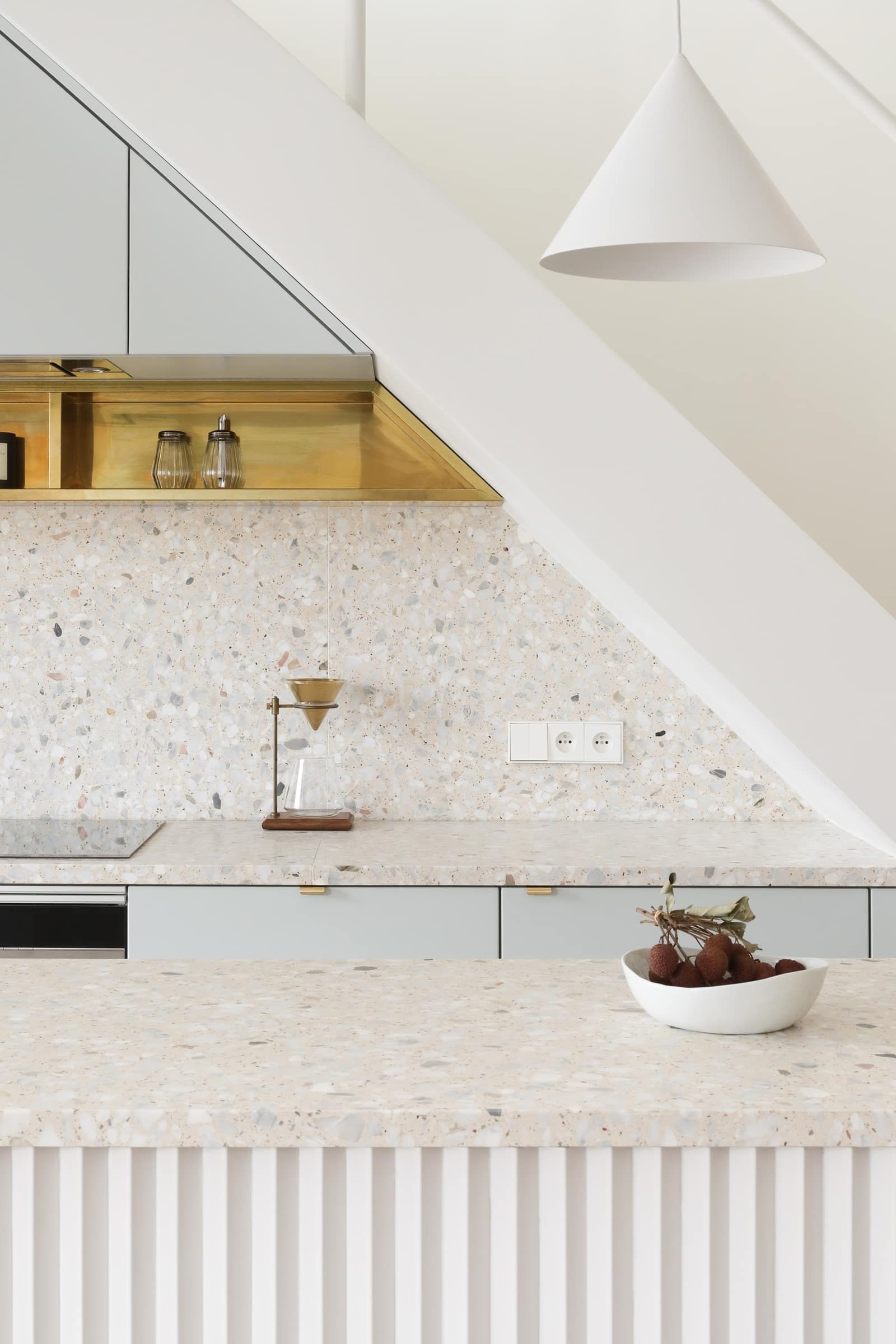 계단 아래 공간을 효율적으로 활용해 만든 주방에는 테라조 카운터 탑과 백스플래시로 세련미를 더한 심플한 디자인의 빌트인 싱크대와 아일랜드를 효율적인 동선에 맞춰 깔끔하게 설치해 감각적이고 세련된 모던 키친을 선보이고 있다.