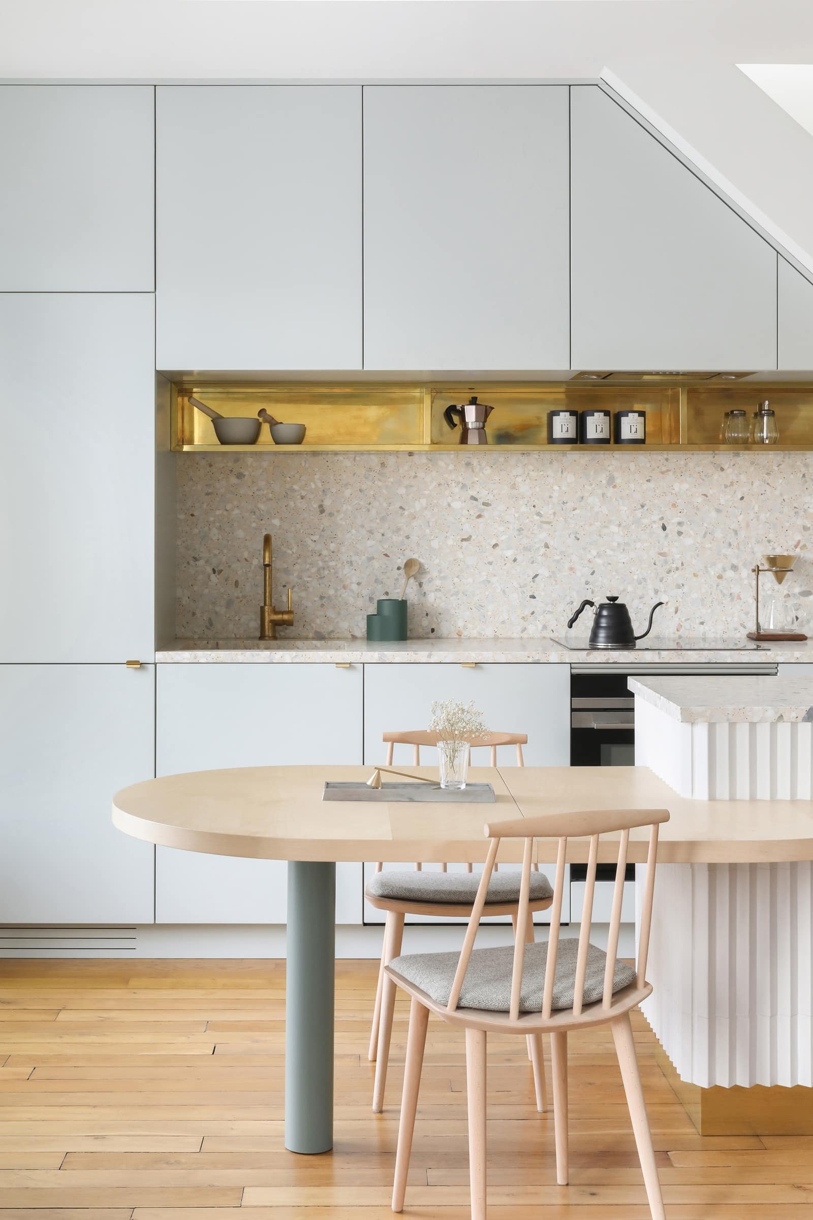 아일랜드와 일체형으로 제작된 라운드 다이닝 테이블이 자리하고 있는 주방 속 다이닝 공간은 식사와 티타임을 즐길 수 있는 예쁜 홈 카페 스타일로 디자인되어 아름답고 실용적인 공간 디자인의 좋은 예를 보여주고 있다.