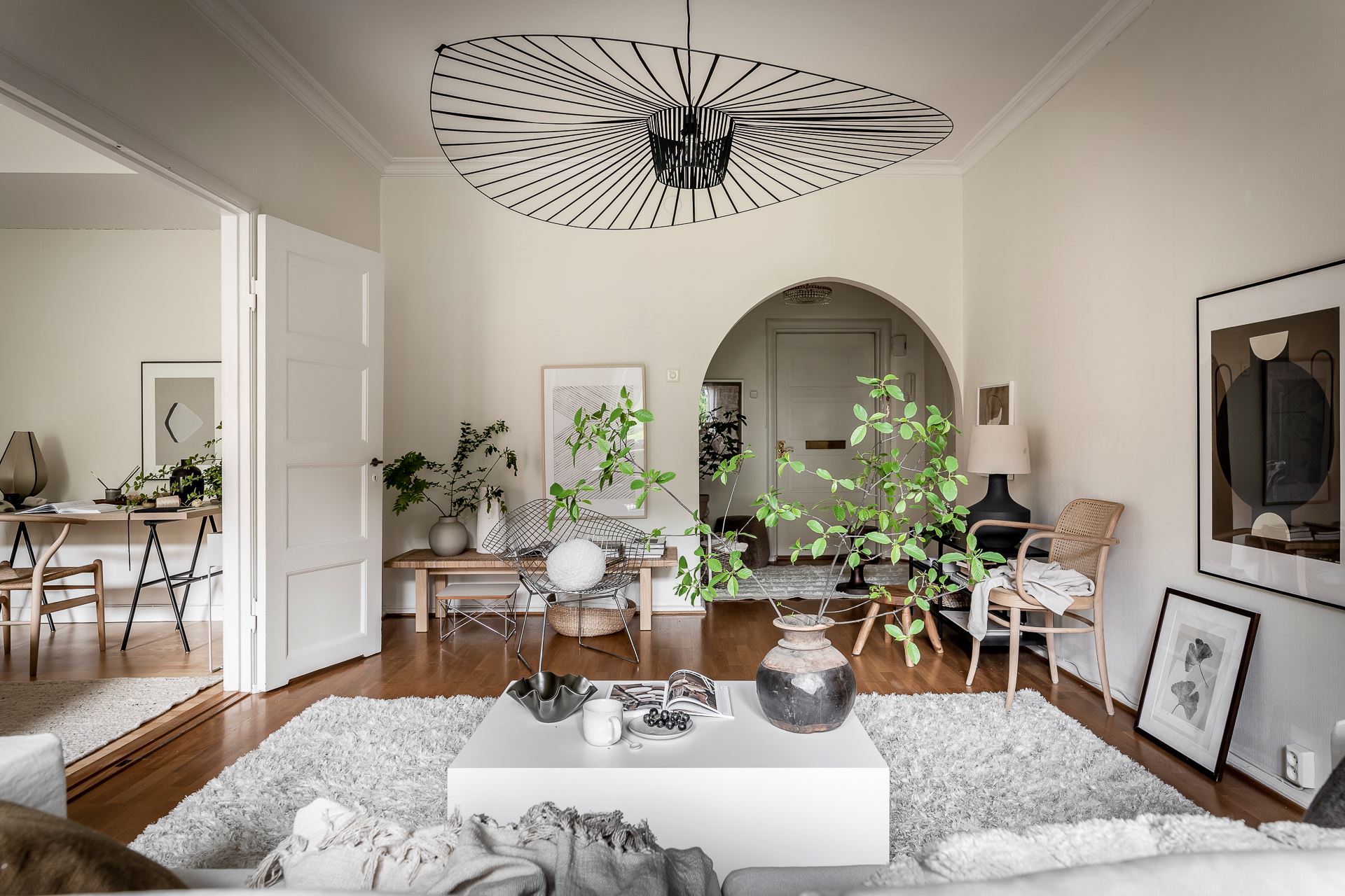 ‘콩스탕스 귀세: Constance Guisset’의 버티고 펜던트 조명으로 포인트를 준 거실에는 북유럽 디자이너 가구와 조명, 오브제들을 감각적으로 배치한 후, 싱그러운 화초들로 예쁜 디테일을 더해 편안한 일상을 즐길 수 있는 여유로운 휴식 공간을 연출하고 있다.