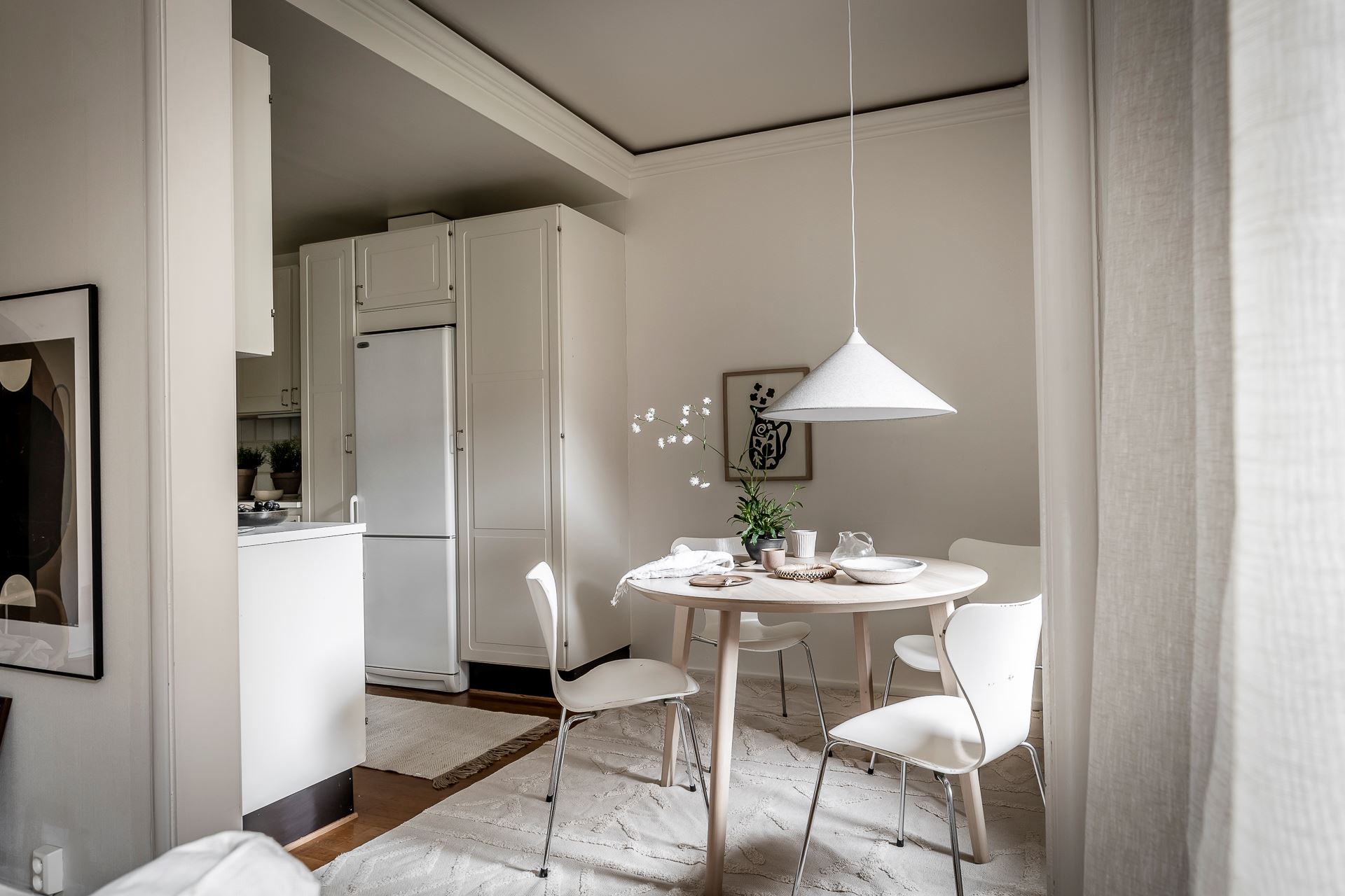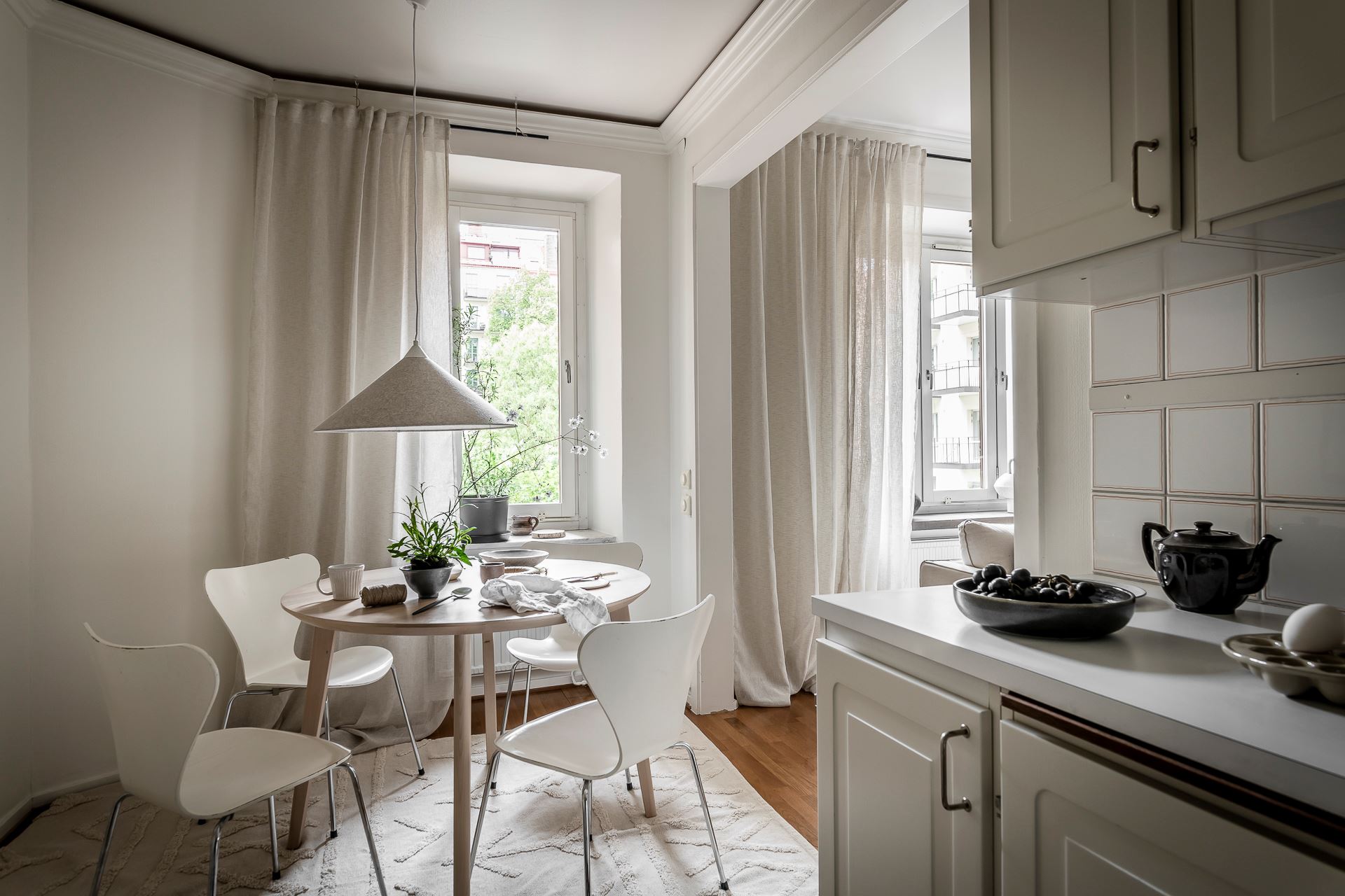 작은 공간을 효율적으로 활용해 만든 예쁜 주방의 경우 요리와 식사를 함께 할 수 있는 아담하지만 알찬 공간으로 스타일링되어 전체 공간과 조화로운 노르딕 키친 인테리어를 선보이고 있다.