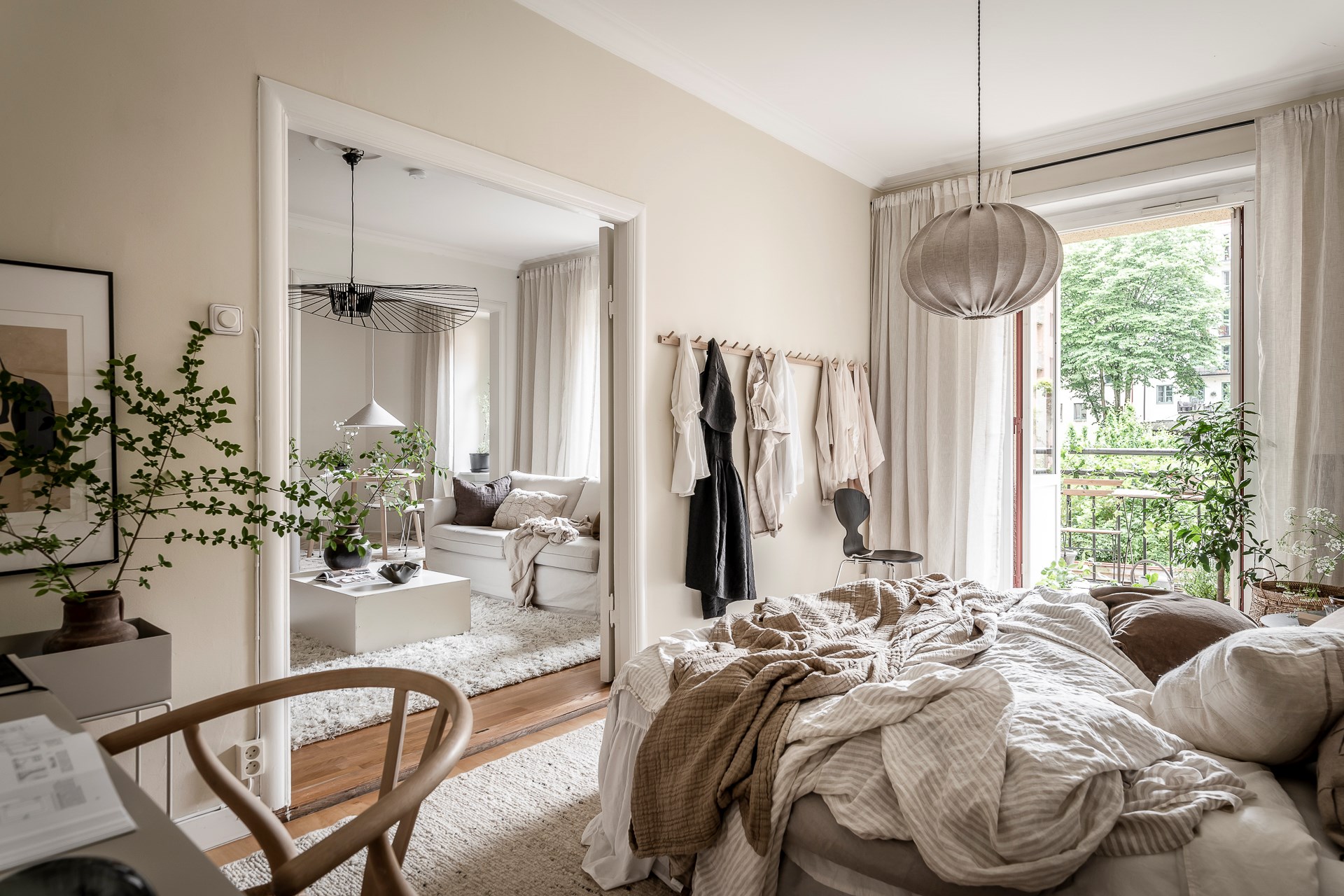 다양한 크기와 종류의 화초들을 감각적으로 활용한 노르딕 인테리어로 색다른 공간 경험을 선사하는 이 집은 거실, 주방, 전용 발코니가 있는 마스터 침실, 욕실, 현관 등으로 구성된 1베드 아파트로, 높은 층고로 인해 실제 면적보다 넓은 공간감을 느낄 수 있다.
