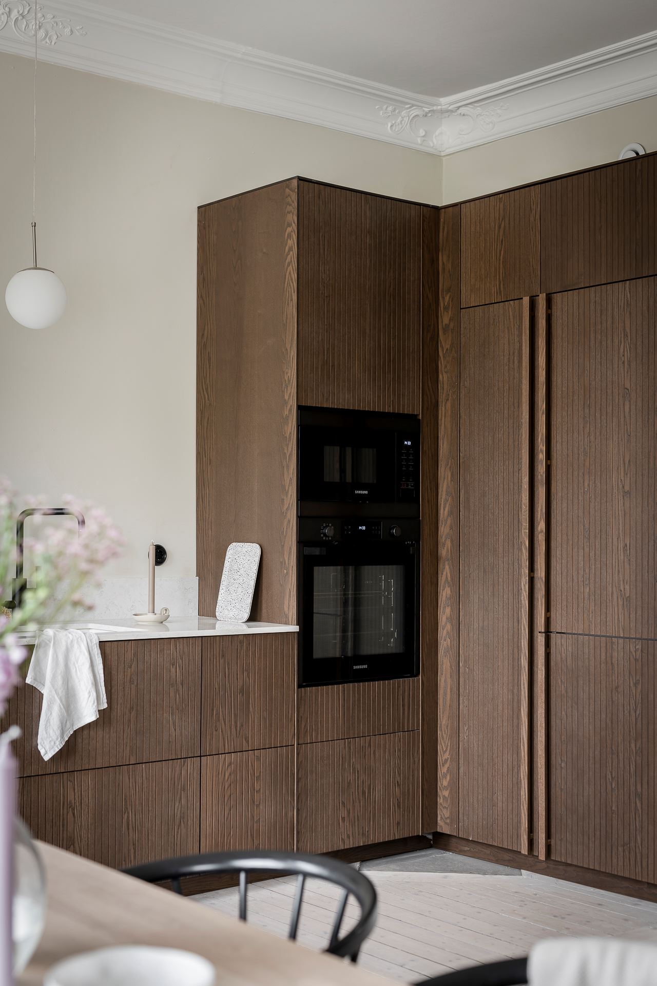 상부장을 생략해 시각적으로 넓은 공간감을 연출하는 주방에는 대리석 카운터 탑으로 고급스럽게 마감된 우드 빌트인 싱크대가 효율적인 동선에 맞춰 깔끔하게 설치되어 아름답고 실용적인 주방 공간을 완성하고 있다.