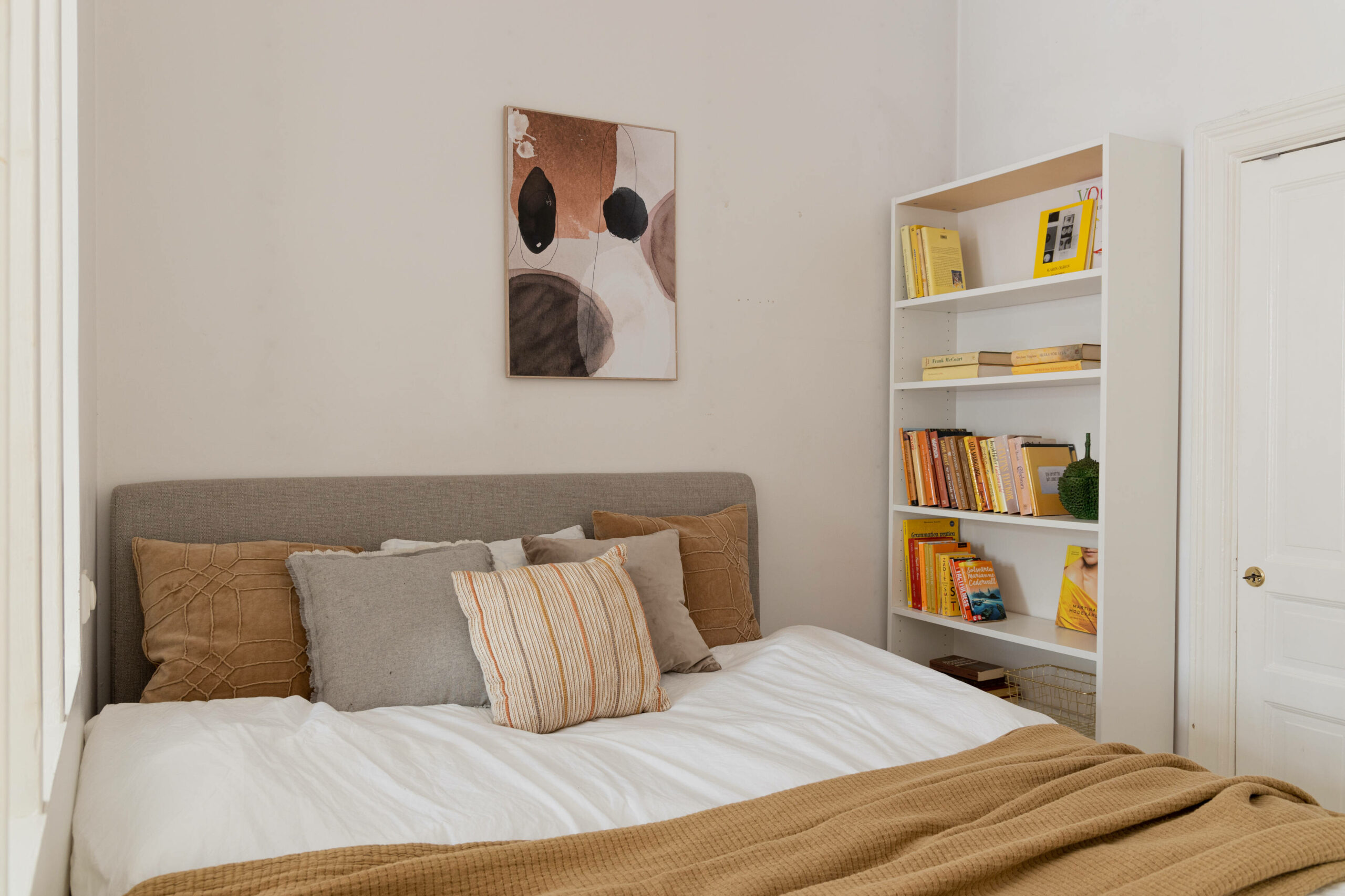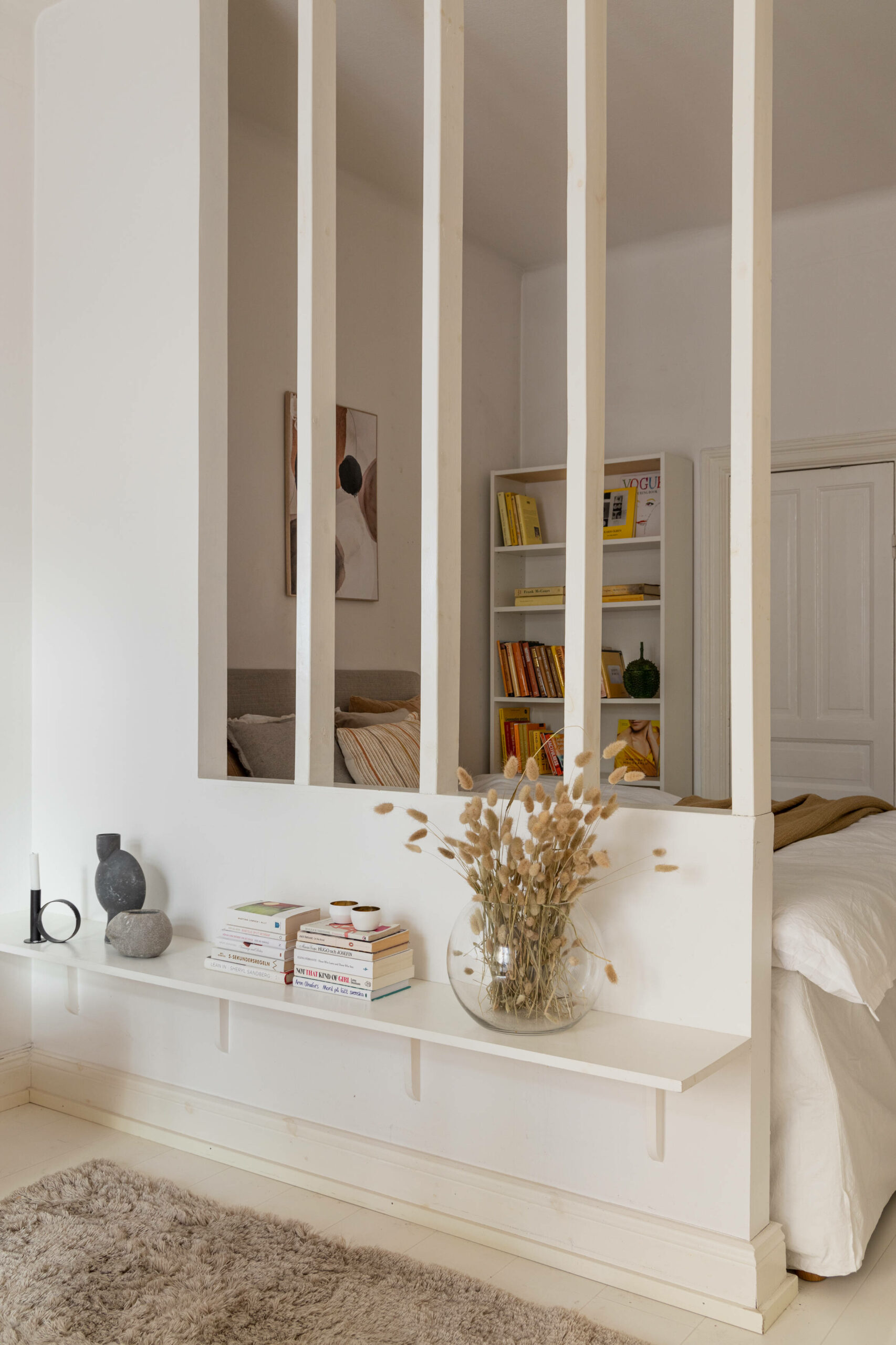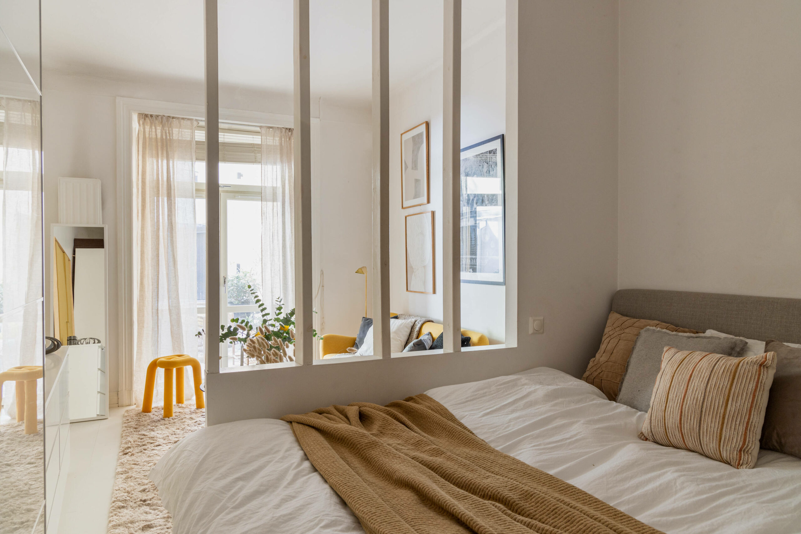 가벽을 사이에 두고 거실 공간과 자연스럽게 구분된 작은 침실에는 패브릭 침대와 수납장을 공간에 꼭 맞게 배치해 제한된 공간을 똑똑하게 활용한 아늑하고 실용적인 침실 스타일링을 잘 보여주고 있다.