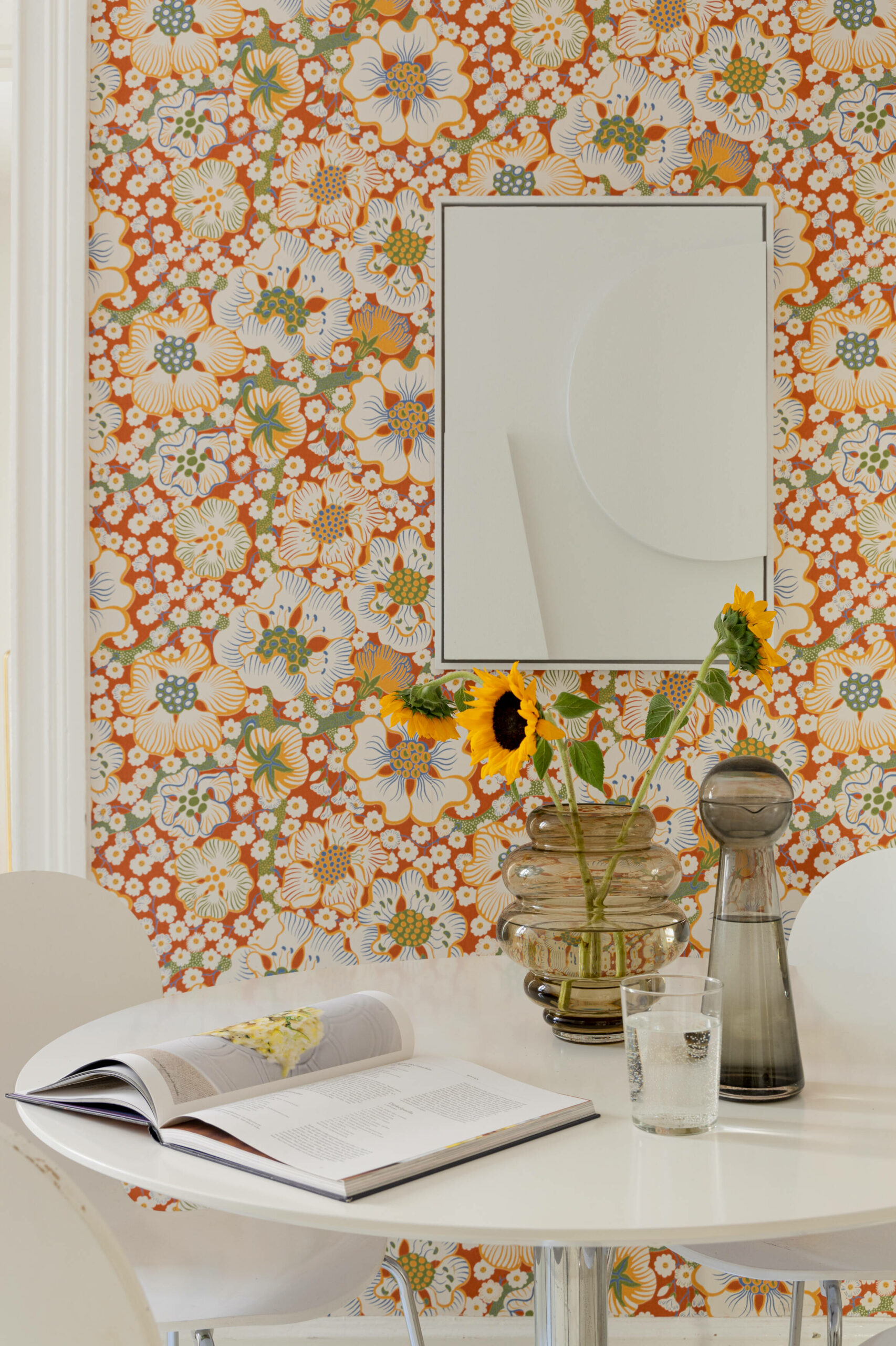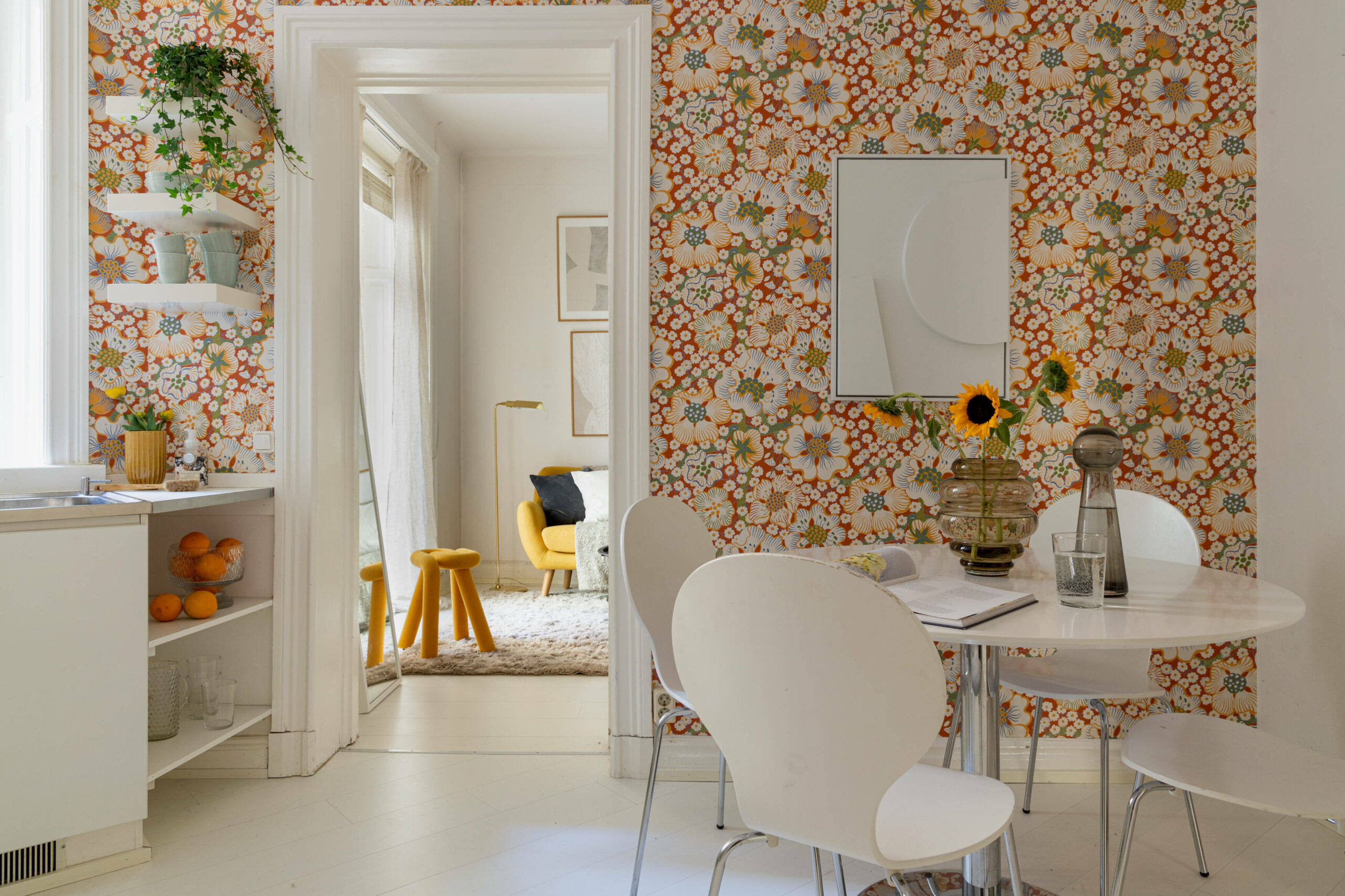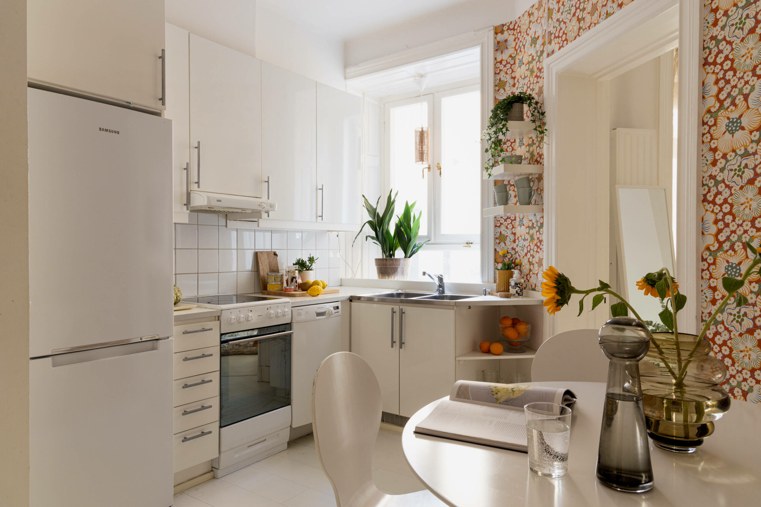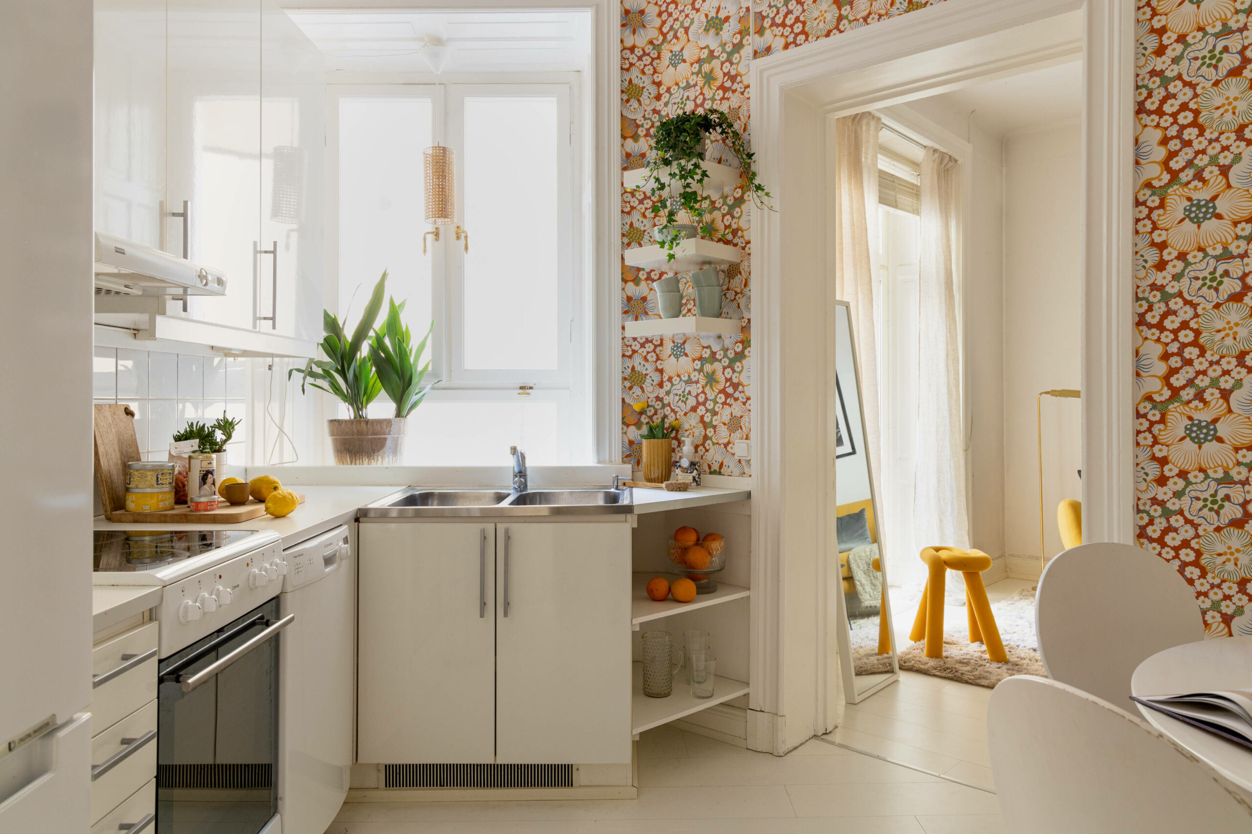 화려한 플라워 패턴 벽지로 포인트를 준 주방에는 심플한 디자인의 L자형 화이트 빌트인 싱크대와 주방 가전들을 공간에 맞춰 깔끔하게 설치해 깜찍하고 실용적인 주방 공간을 완성하고 있다.