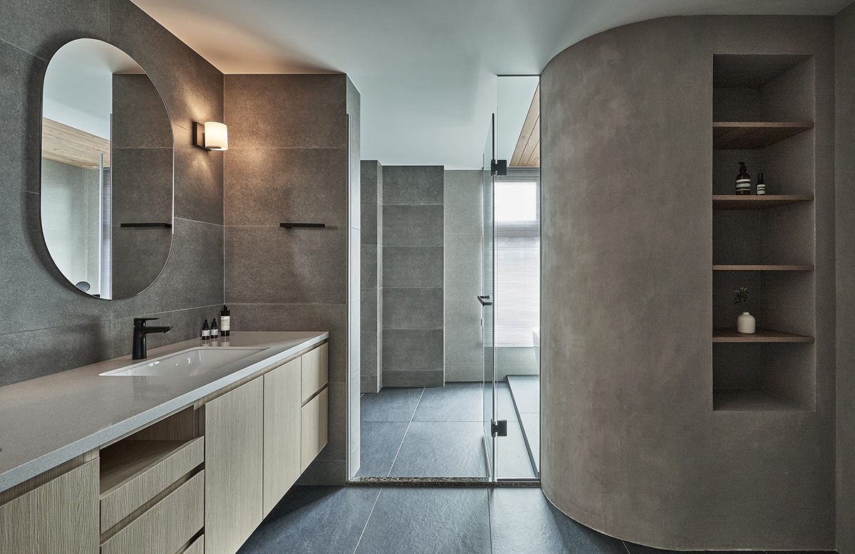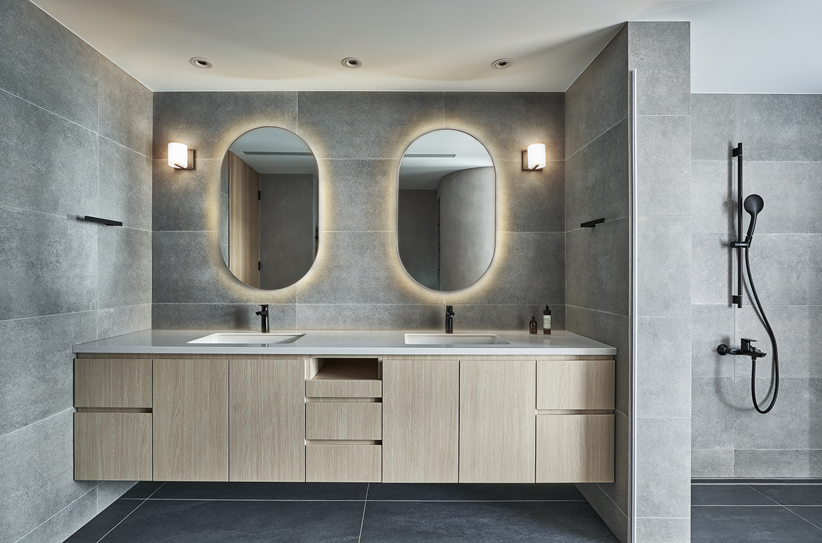 은은한 조명 인테리어가 돋보이는 건식 욕실은 세면 공간과 샤워 공간이 깔끔하게 구분되어 공간 사용과 관리에 편리를 더했다.