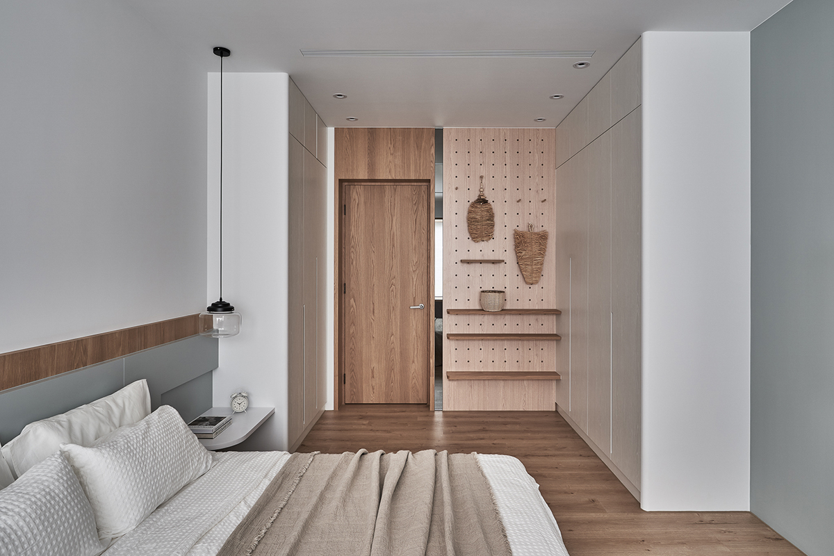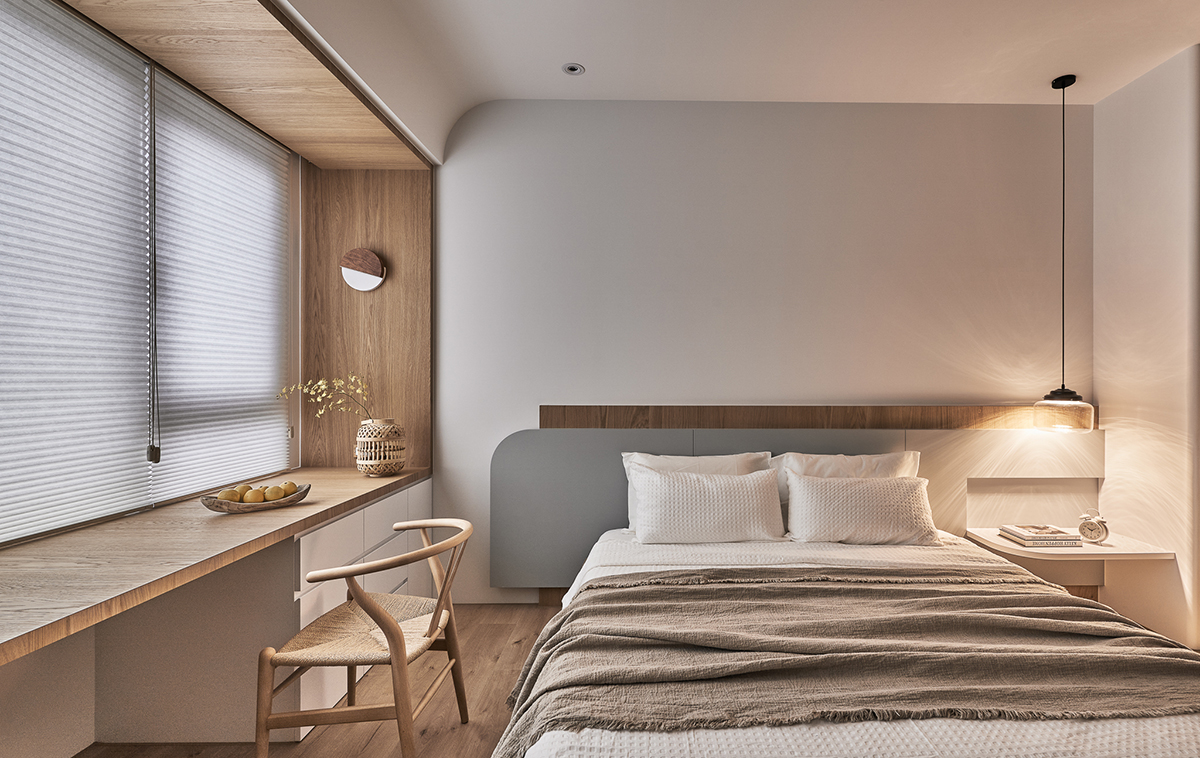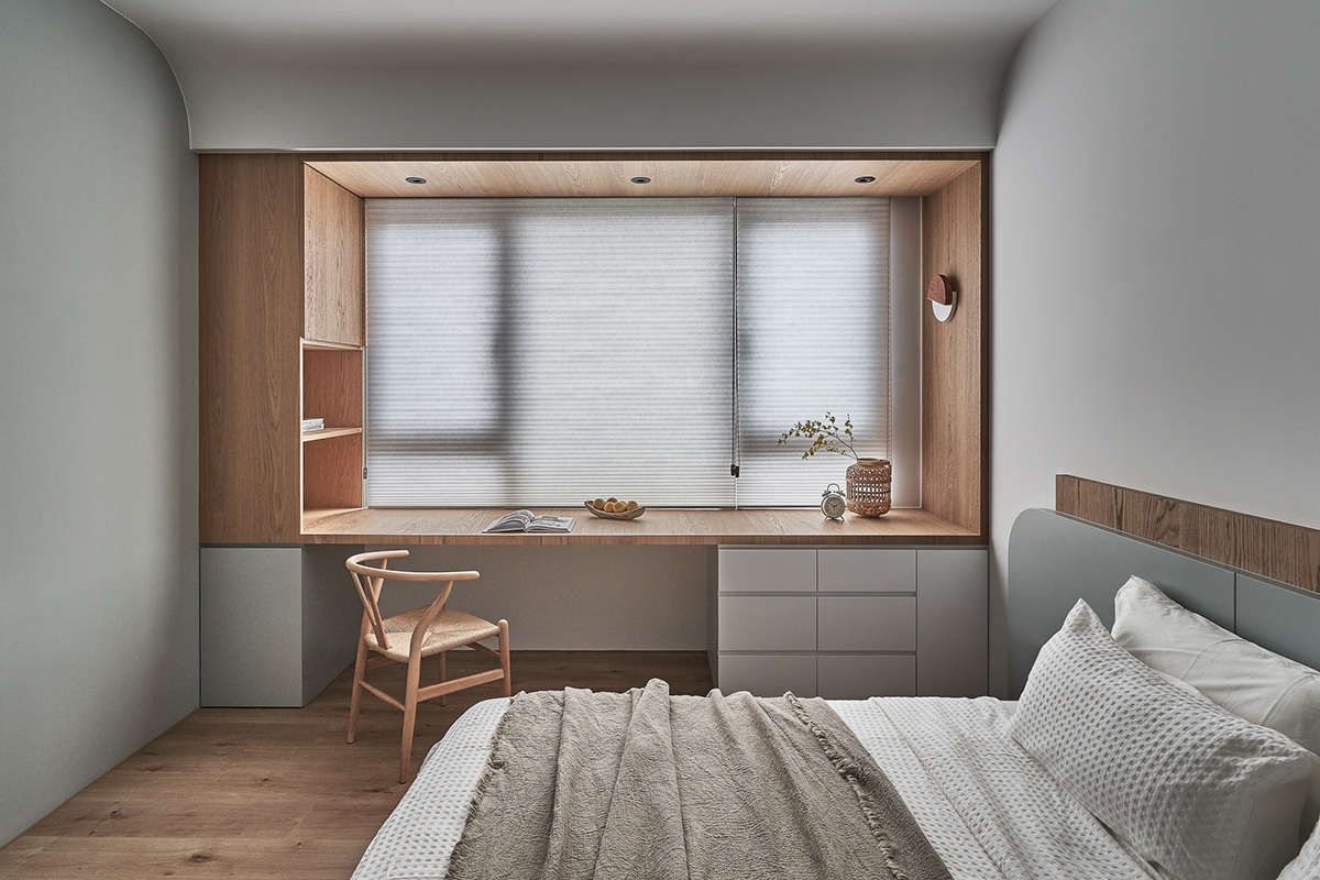 화이트, 그레이, 우드의 감각적인 조화가 돋보이는 가족 침실의 경우 업무와 작업, 학습에 집중할 수 있는 넉넉한 사이즈의 빌트인 책상을 비롯해 공간에 꼭 맞게 디자인된 빌트인 가구들이 효율적으로 배치되어 깔끔하고 세련된 프라이빗 공간을 연출하고 있다.