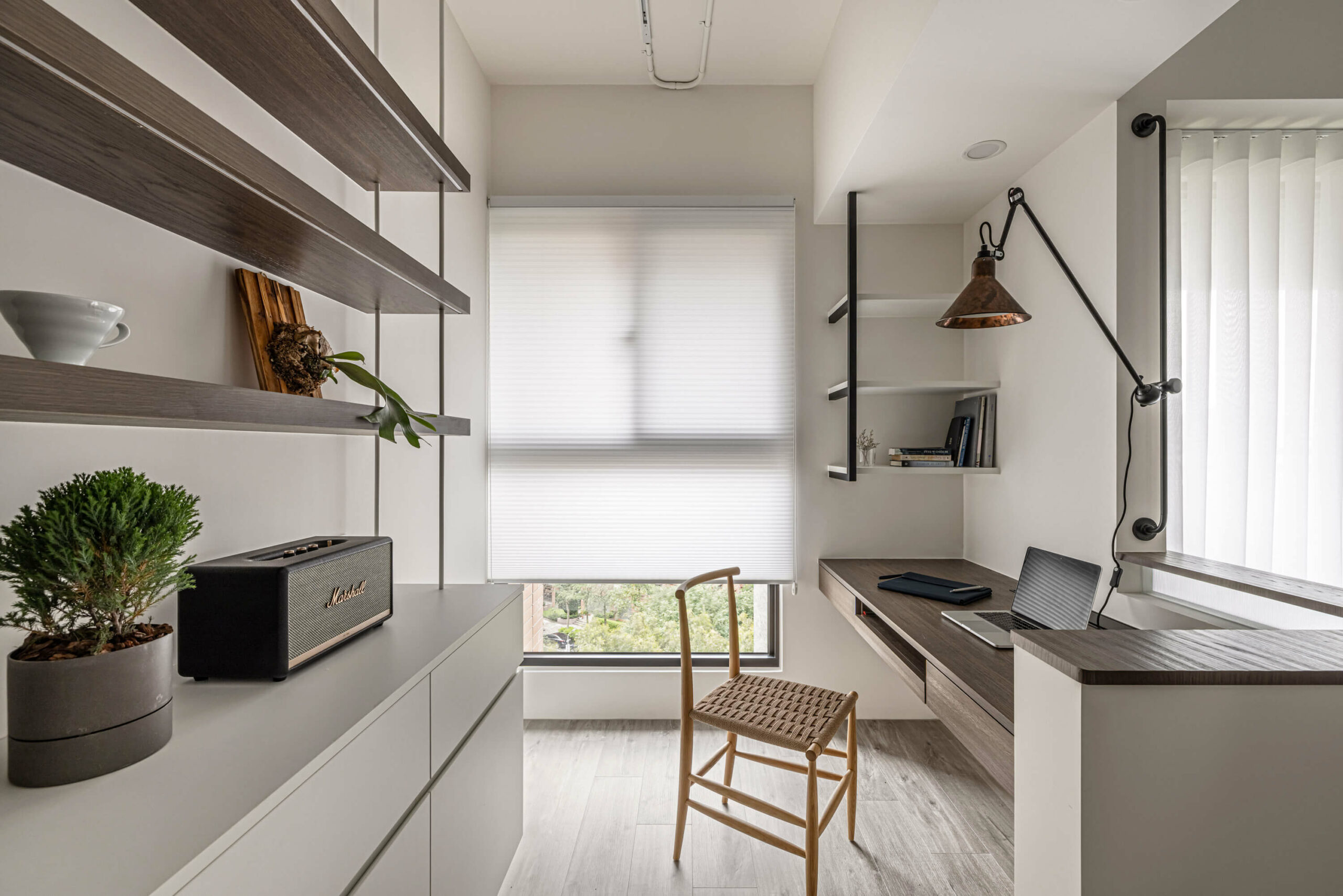 공간에 맞춰 짜임새 있게 디자인된 빌트인 가구로 깔끔하게 꾸며진 거실 속 작은 홈 오피스는 집에서도 업무와 작업에 집중할 수 있는 효율적인 공간을 연출하고 있다.