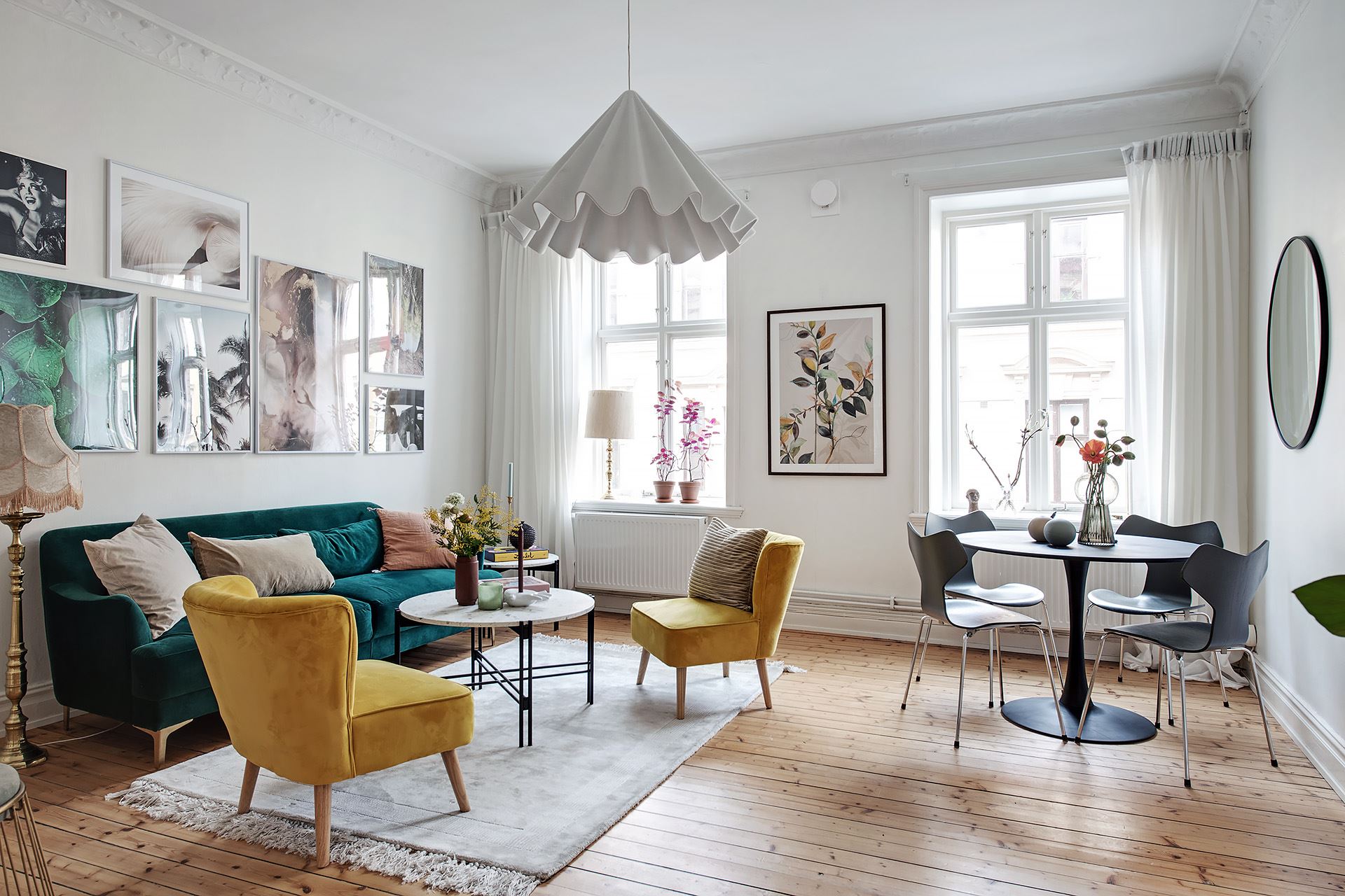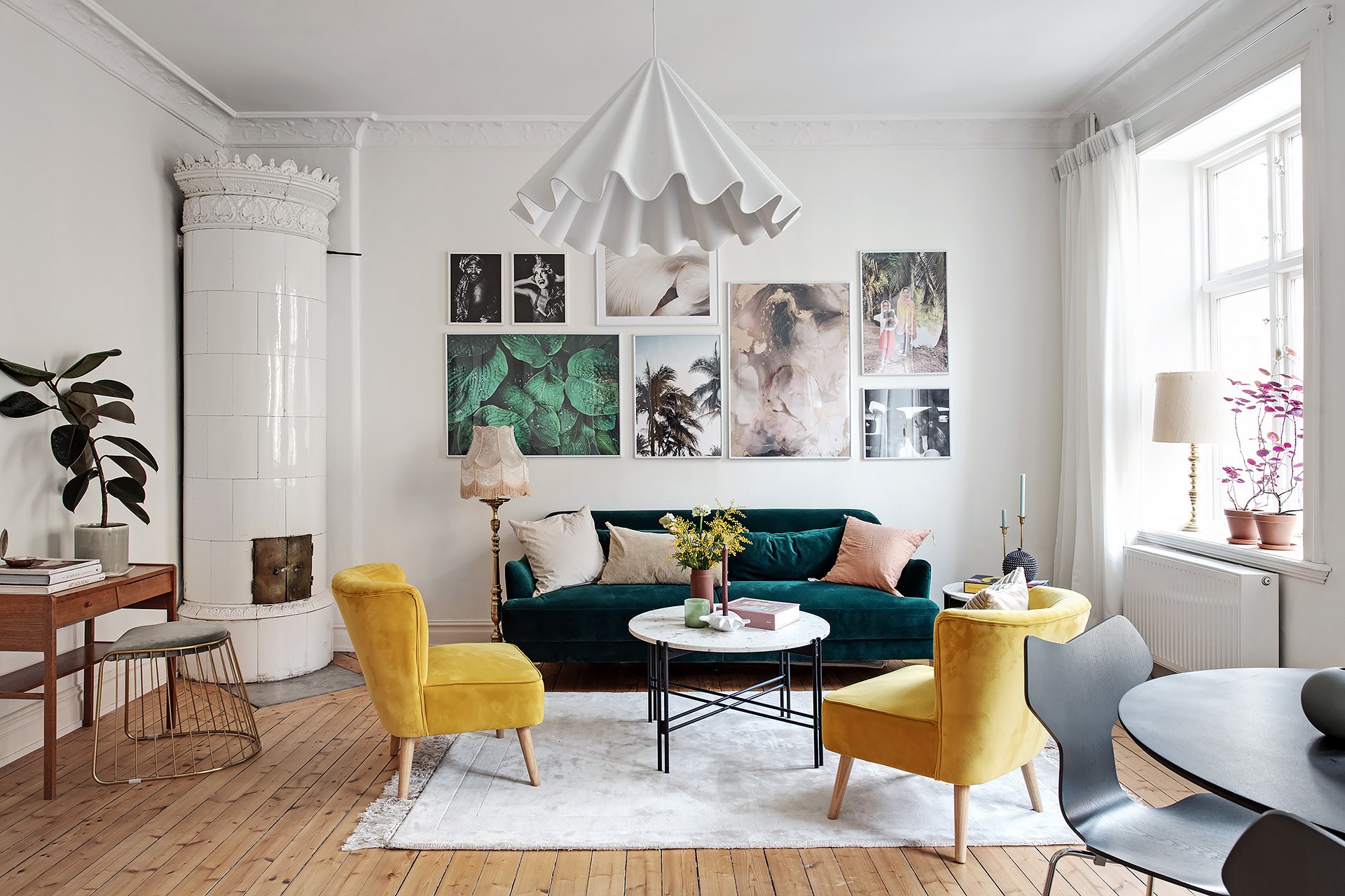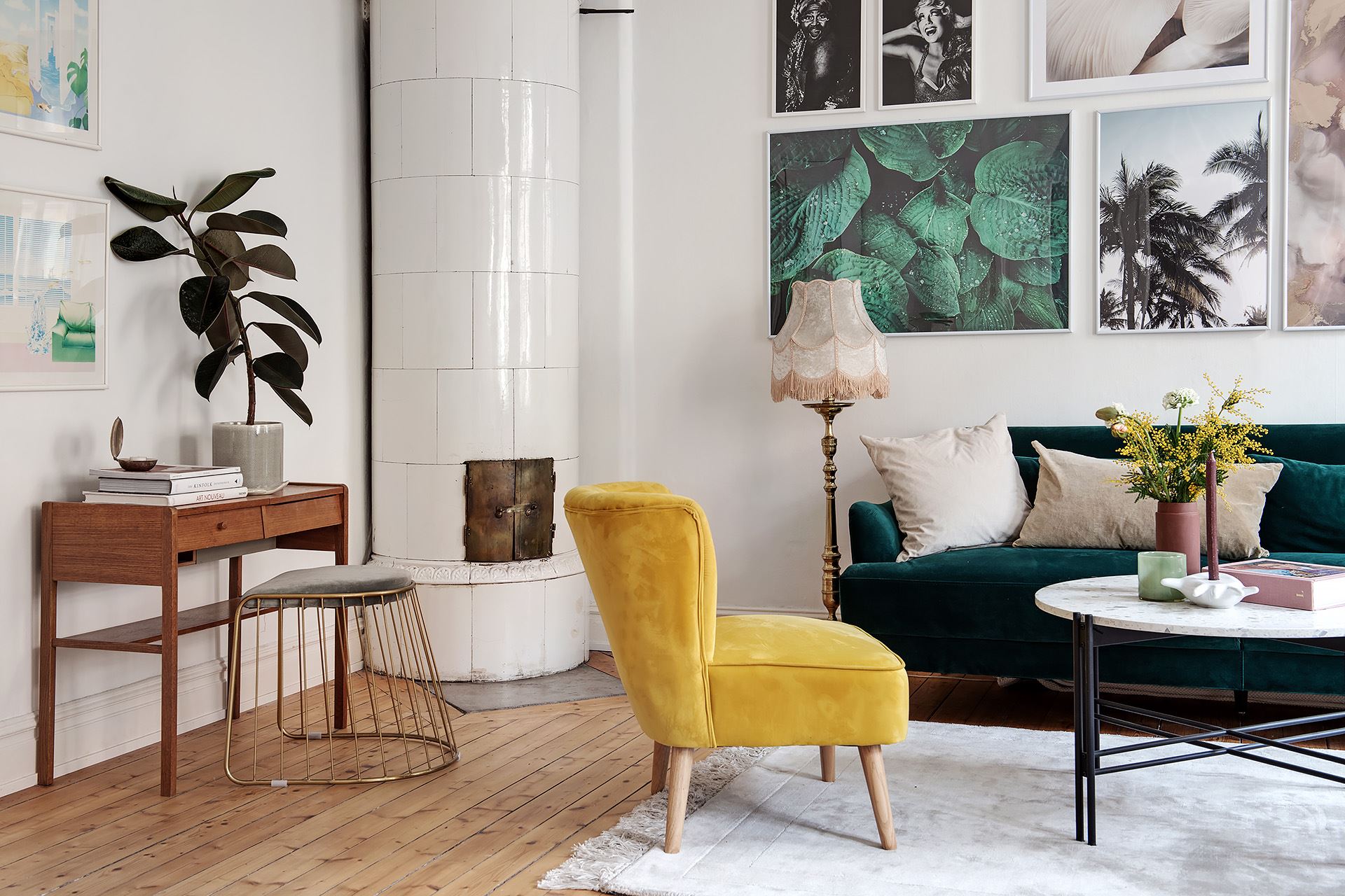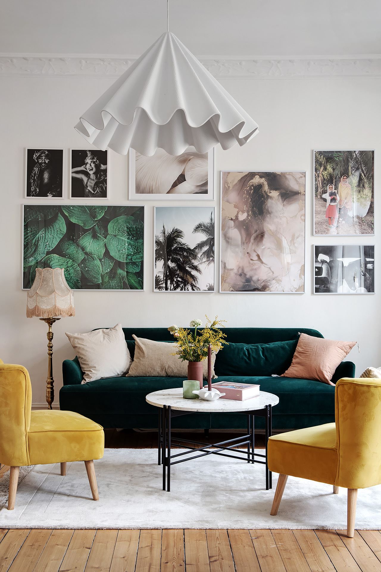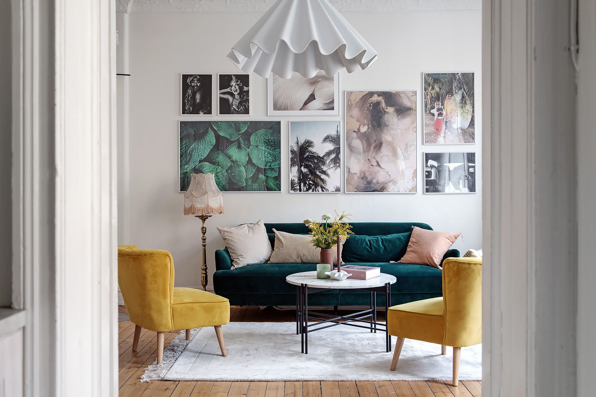 매혹적인 딥 그린 컬러가 돋보이는 벨벳 소파와 발랄한 머스타드 벨벳 라운지체어, 대리석 티 테이블, 사이드 테이블, 앤티크 스탠딩 조명, 러그 등이 단정하게 배치된 거실에는 다채로운 액자와 오브제, 화초 등으로 공간에 포인트를 줘 아름답고 매력적인 거실 공간을 연출하고 있다.