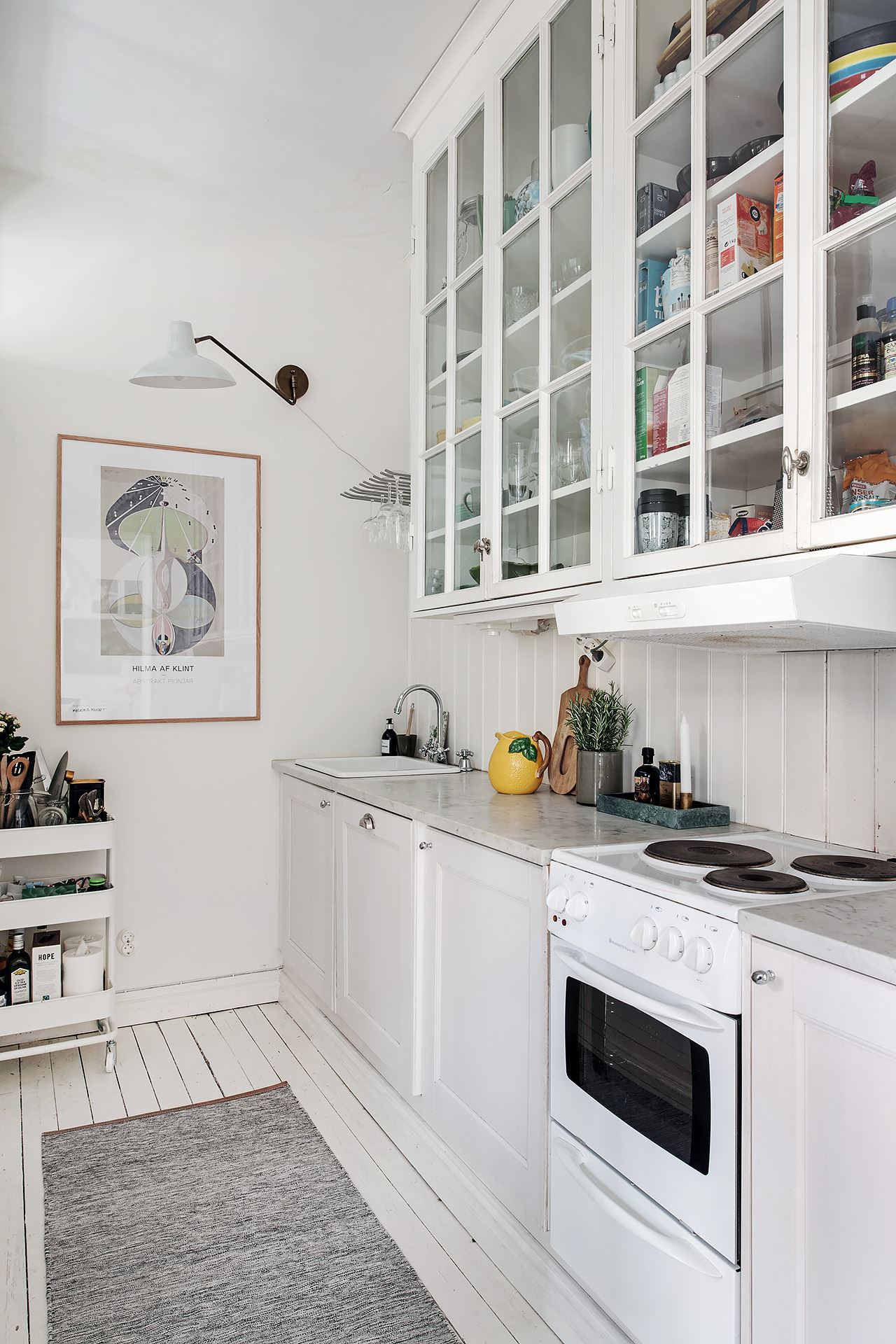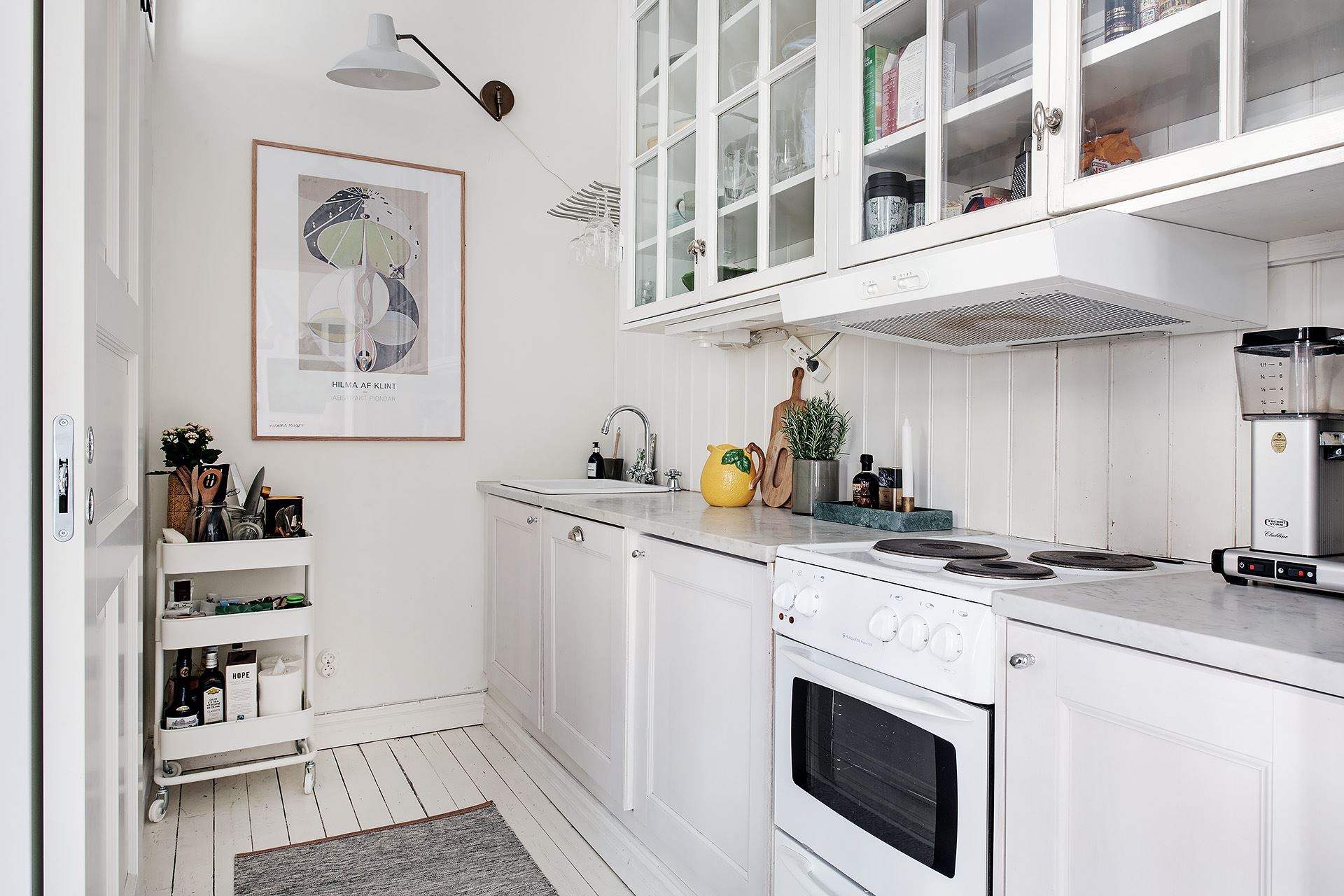 넉넉한 수납공간을 내장하고 있는 화이트 빌트인 싱크대가 설치된 주방은 작은 공간을 효율적으로 활용한 깔끔하고 실용적인 주방 인테리어를 잘 보여주고 있다.